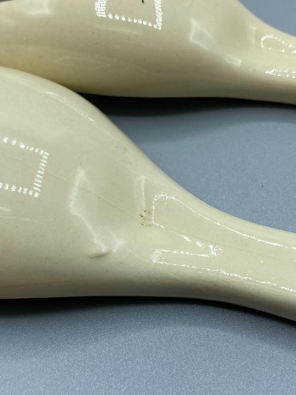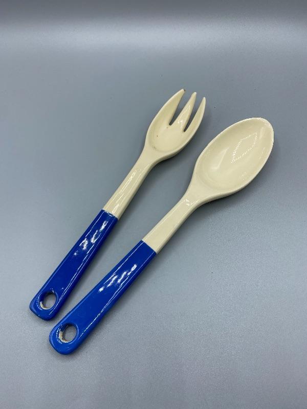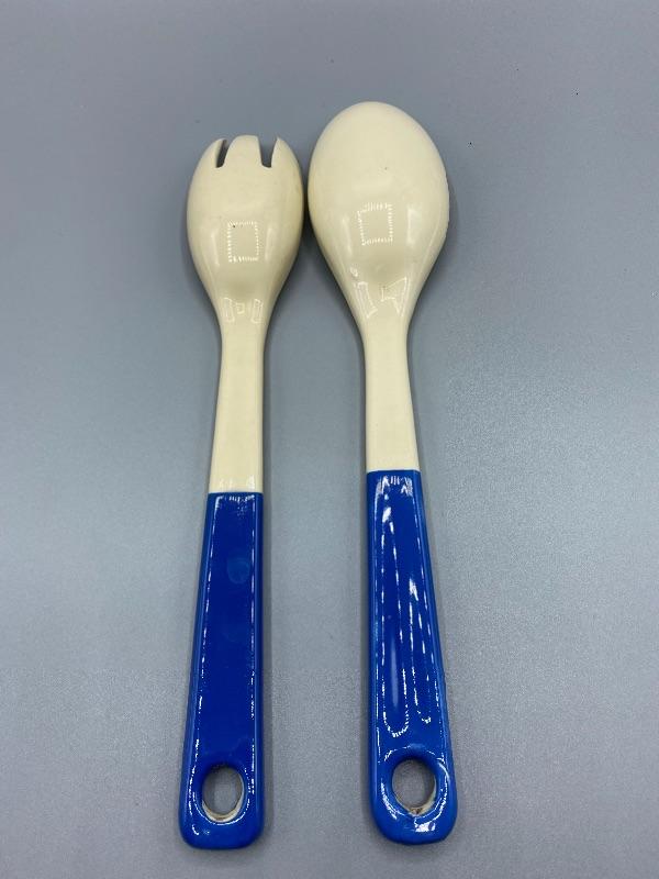 Vintage salad serving utensils. White and blue ceramic fork and spoon. Slight crazing and a chip in the end of the fork.