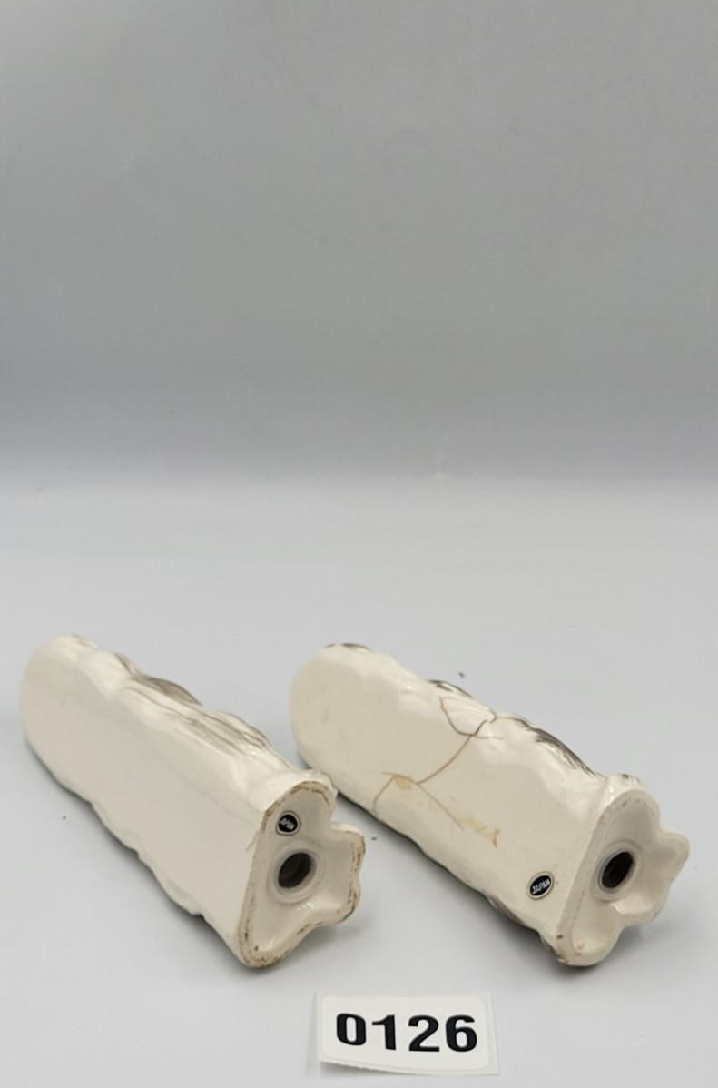 Unknown maker of these two items. Stoppers are present on both. The pepper shakers has been broken and repaired as shown in the photo.