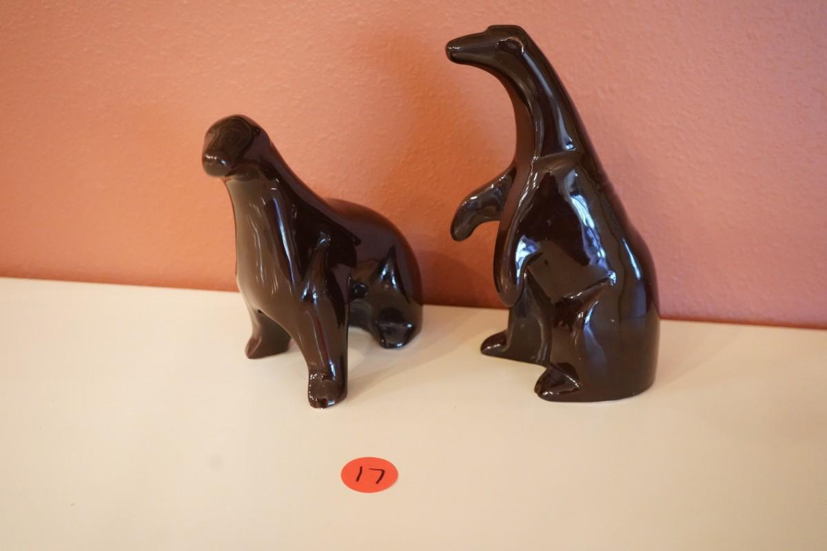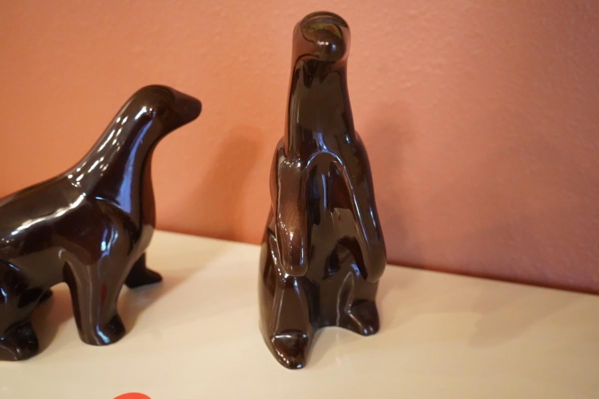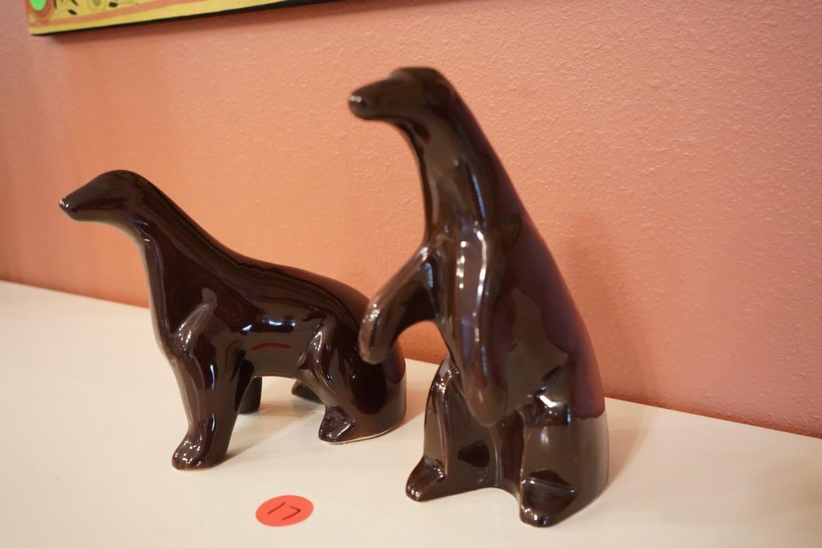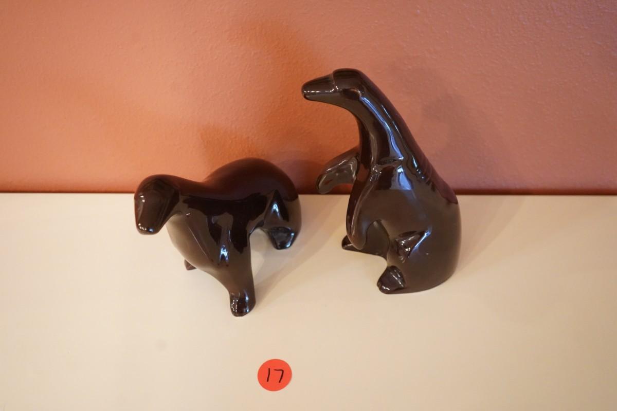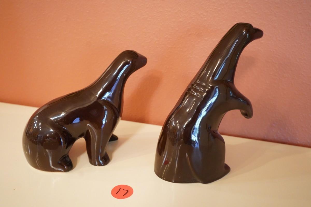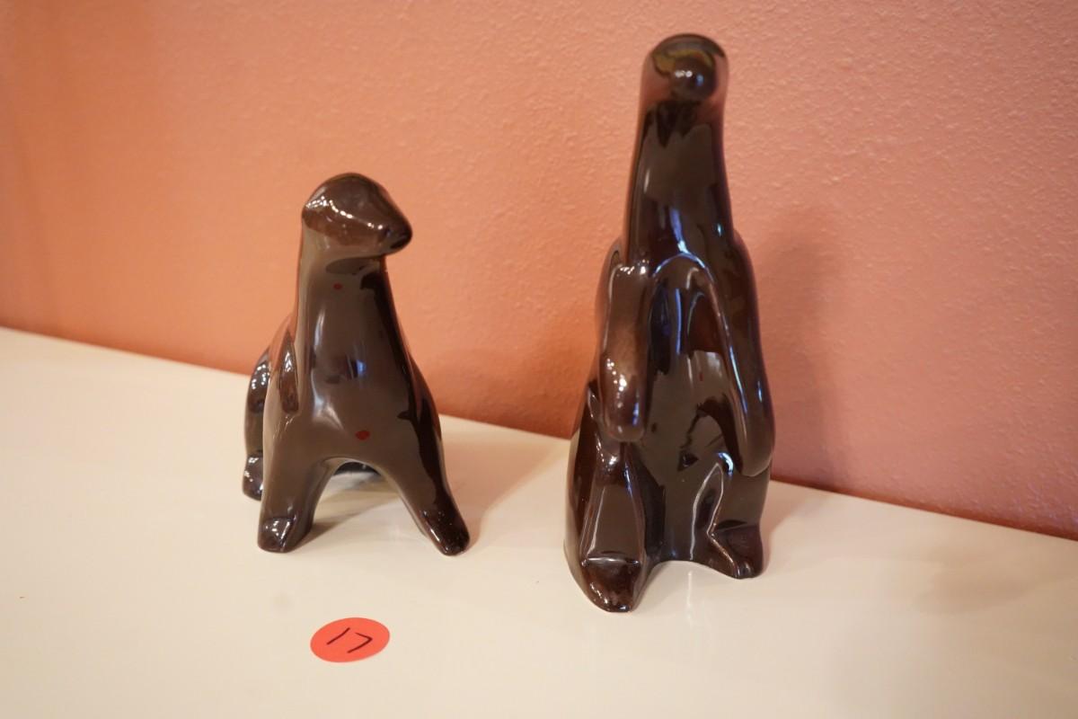 Dark brown decorative sea lions for tabletop display. Sitting sea lion measures 8.5 W x 5D x 7.5H. Upright sea lion measures 4W x 6D x 9.5H.