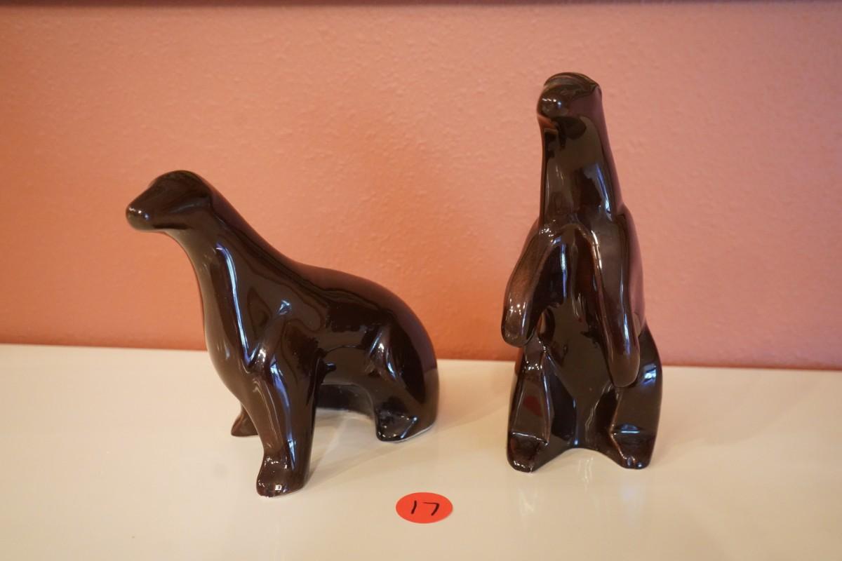 Dark brown decorative sea lions for tabletop display. Sitting sea lion measures 8.5 W x 5D x 7.5H. Upright sea lion measures 4W x 6D x 9.5H.