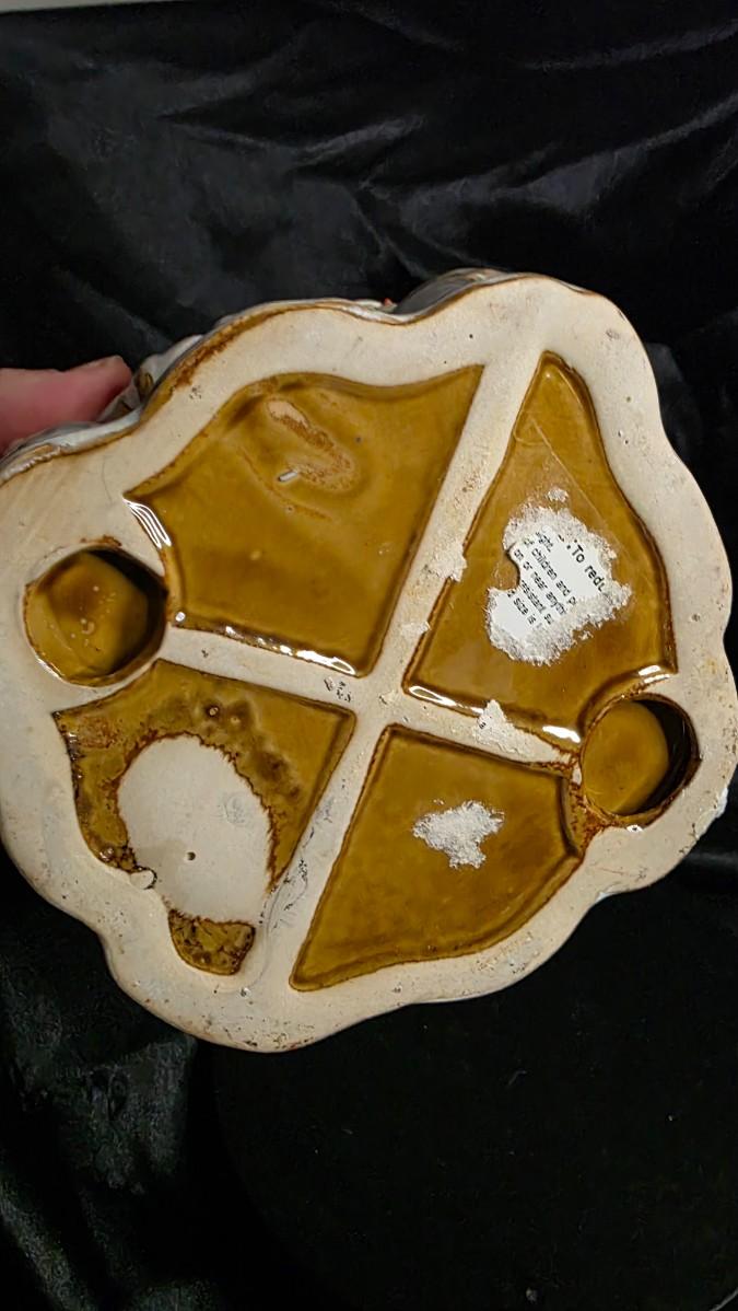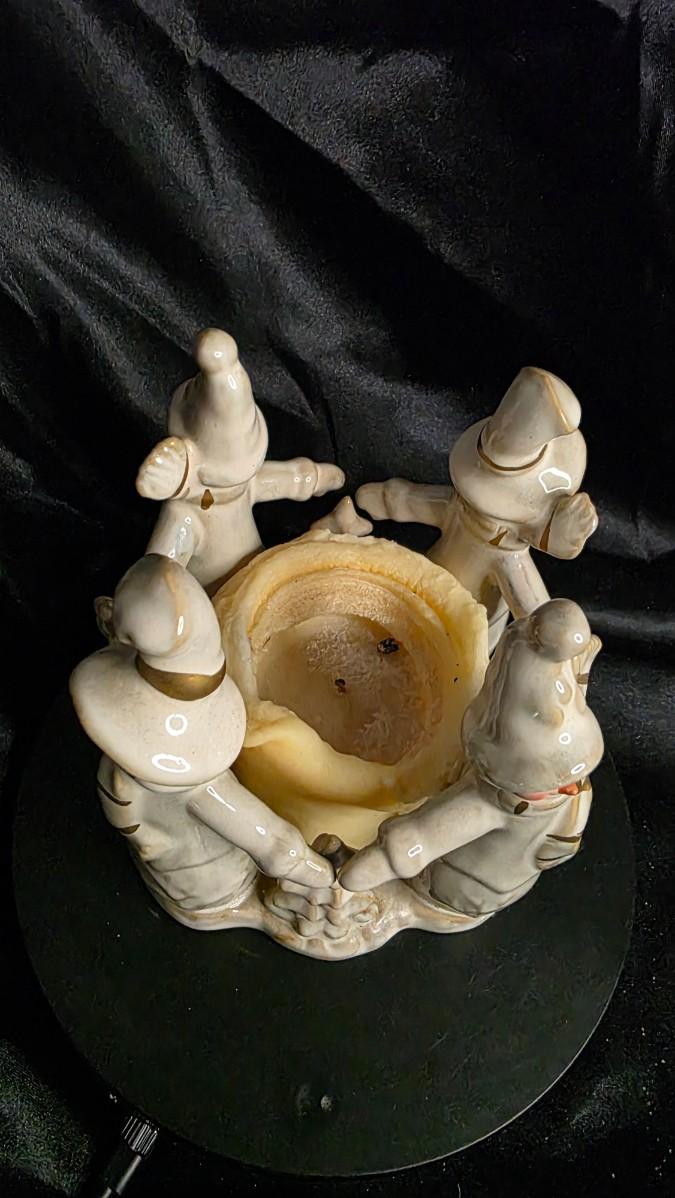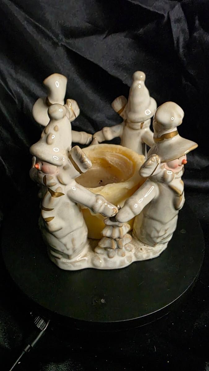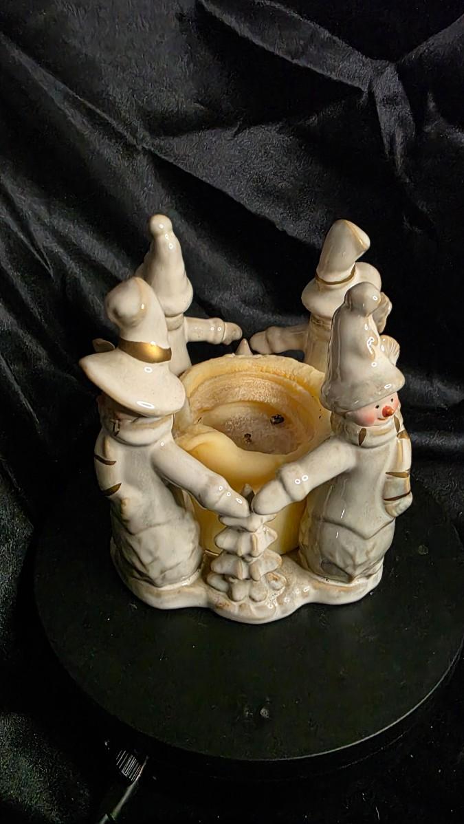 At the center rests a well-worn wax cavity—evidence of cozy evenings past—adding to its rustic, time-touched charm. The snowmen stand on a textured snowy base, their linked arms forming a perfect ring that feels both festive and symbolic. It’s a wonderful display piece for a holiday mantle, a vintage ceramics collection, or anyone who loves winter décor with personality and soul.