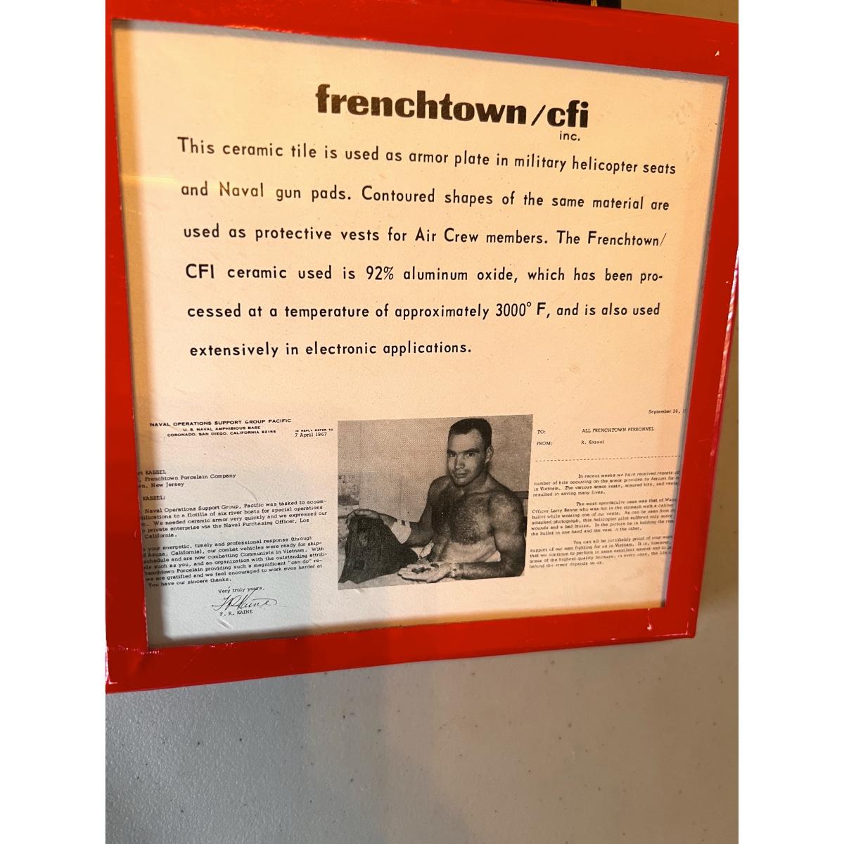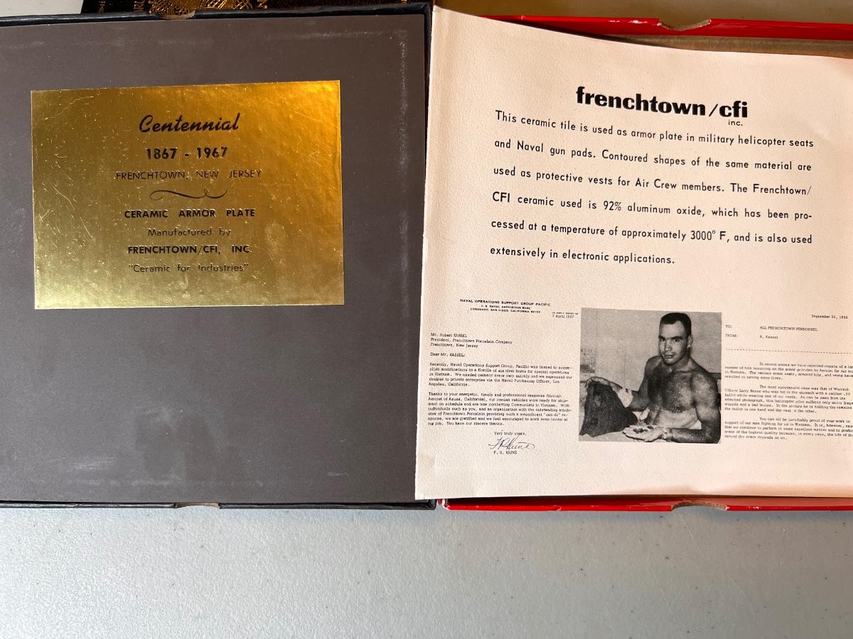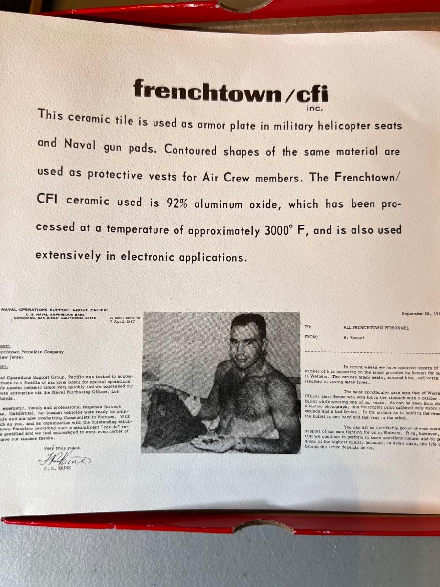 Rare Frenchtown/cfi inc. commemorative tile. "This ceramic tile is used as armor plate in military helicopter seats