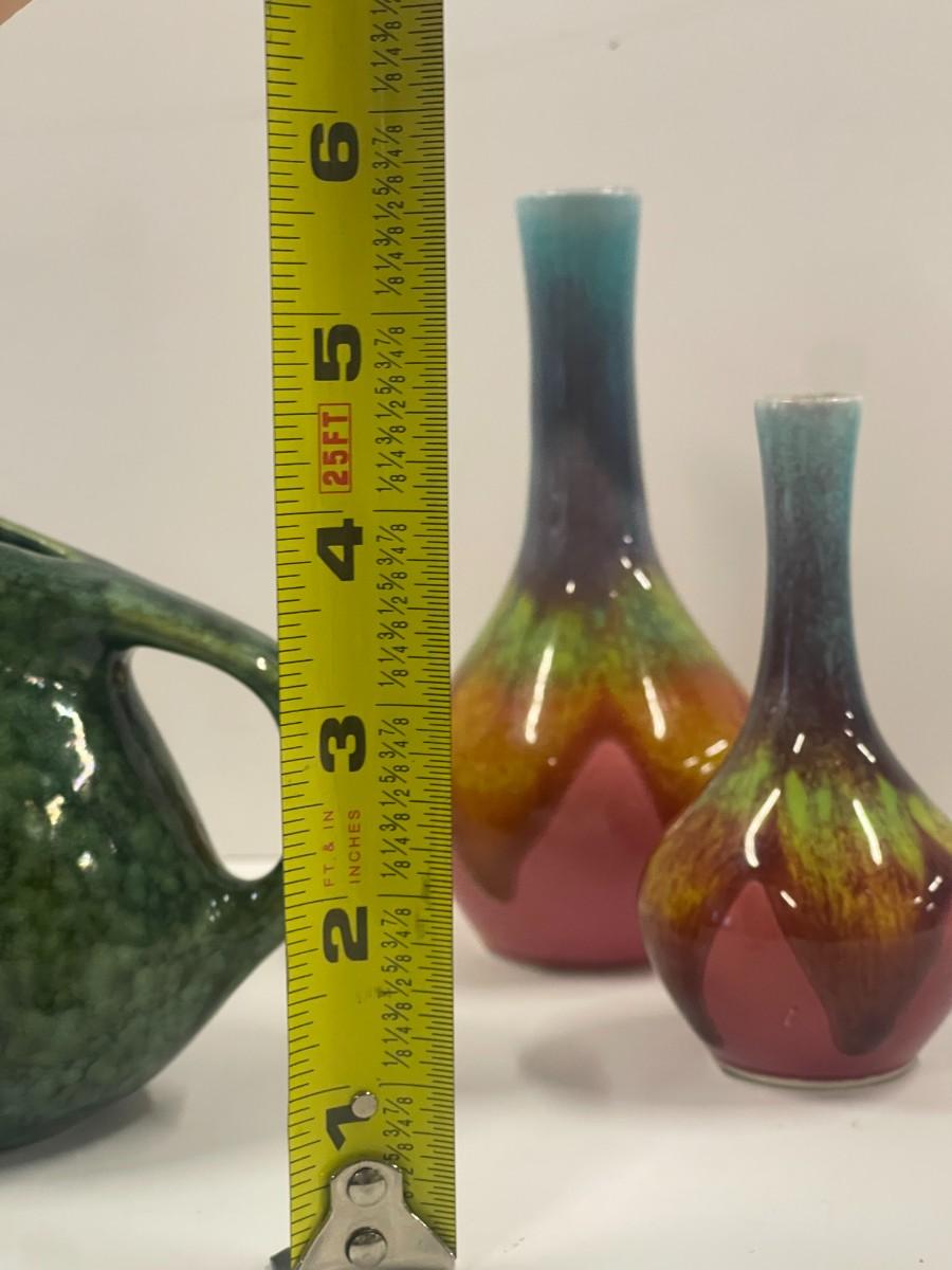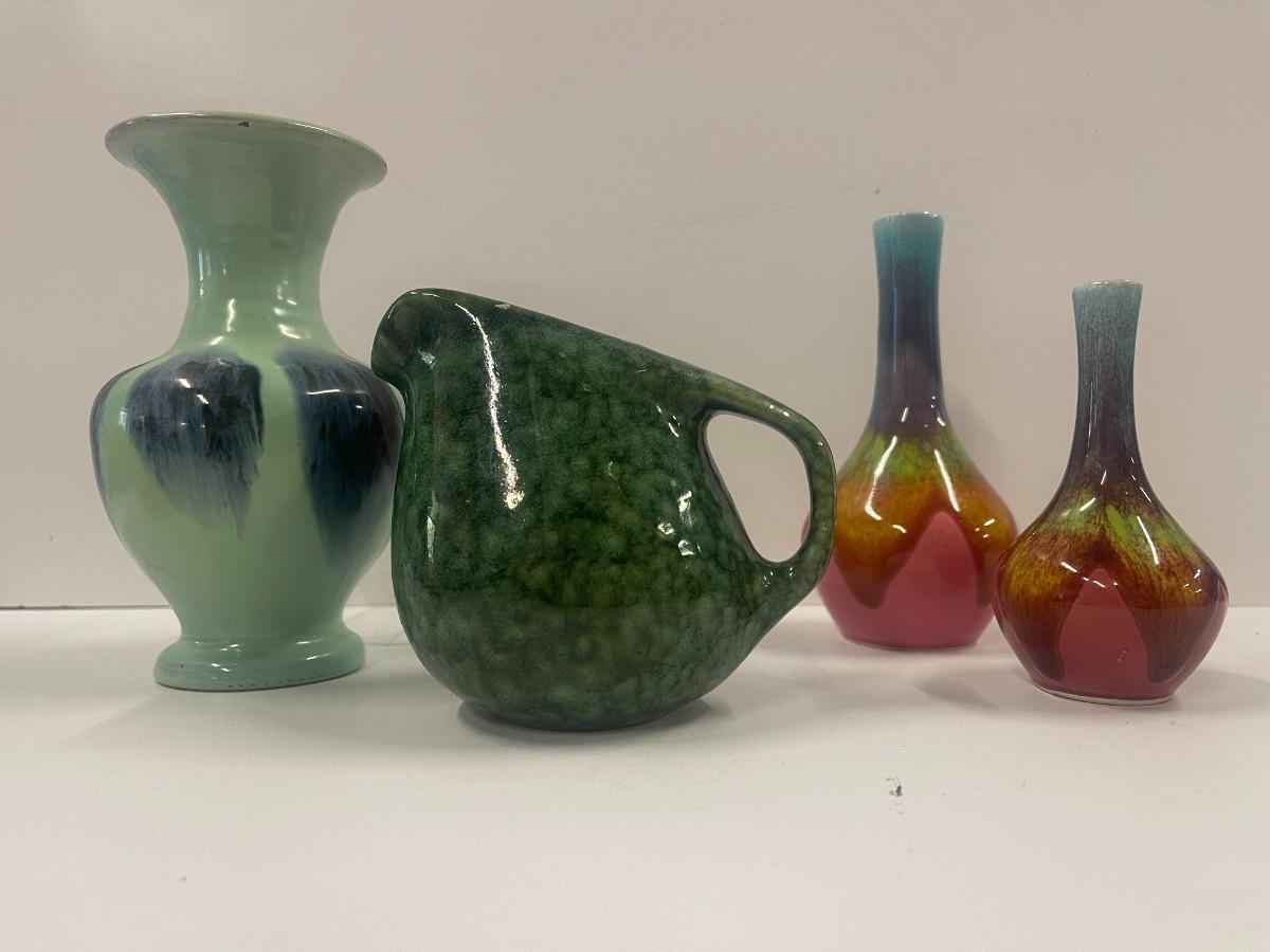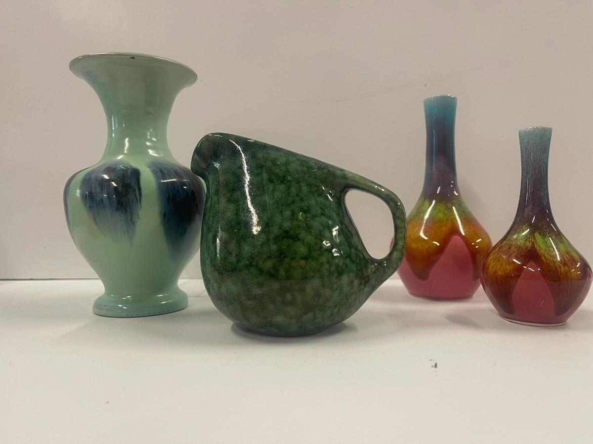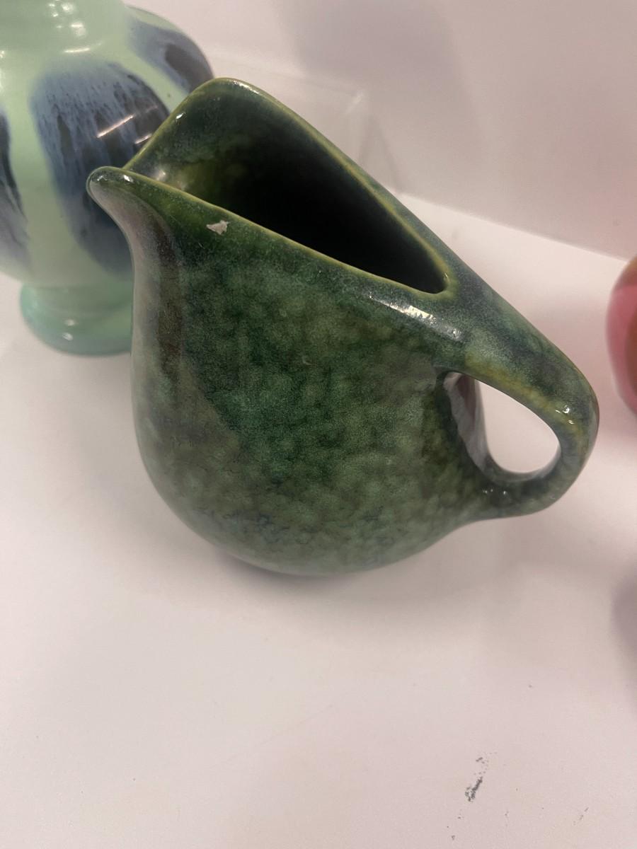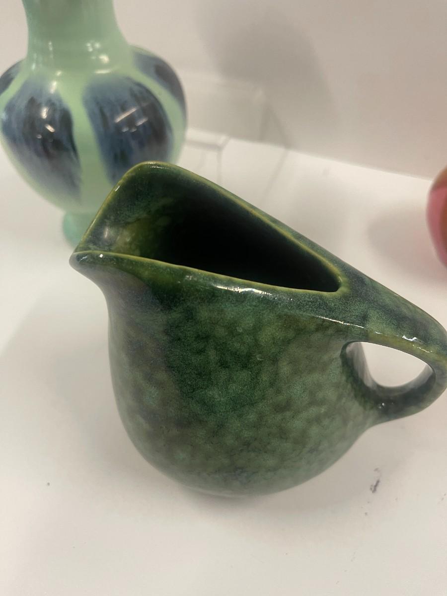 Vintage Ceramic Vases & Creamer. One of the small pink bud vases has a chip.