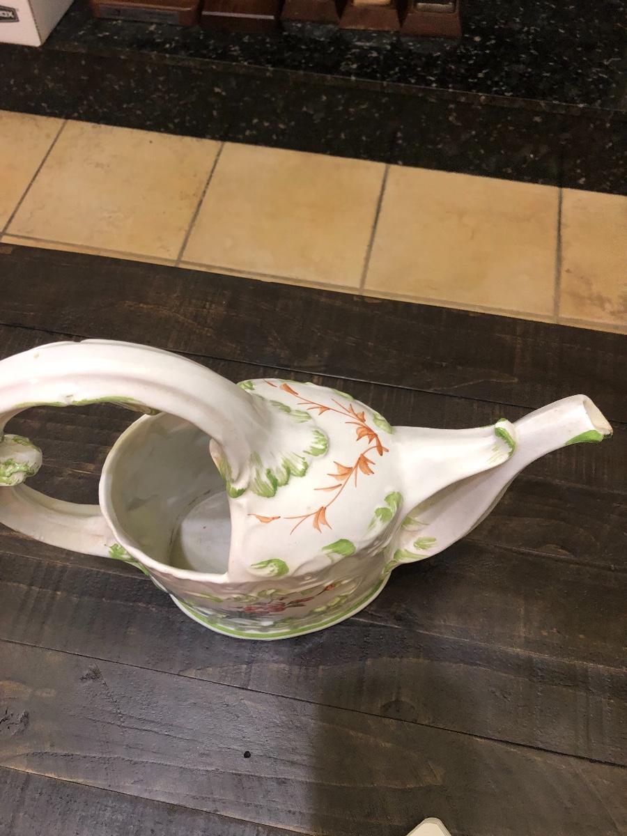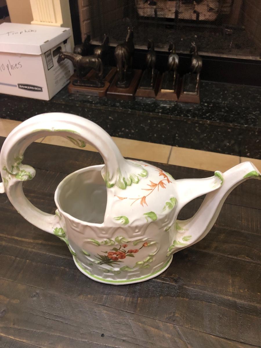 This ceramic piece is adorable. Has a very long spout with handle Measures 11”