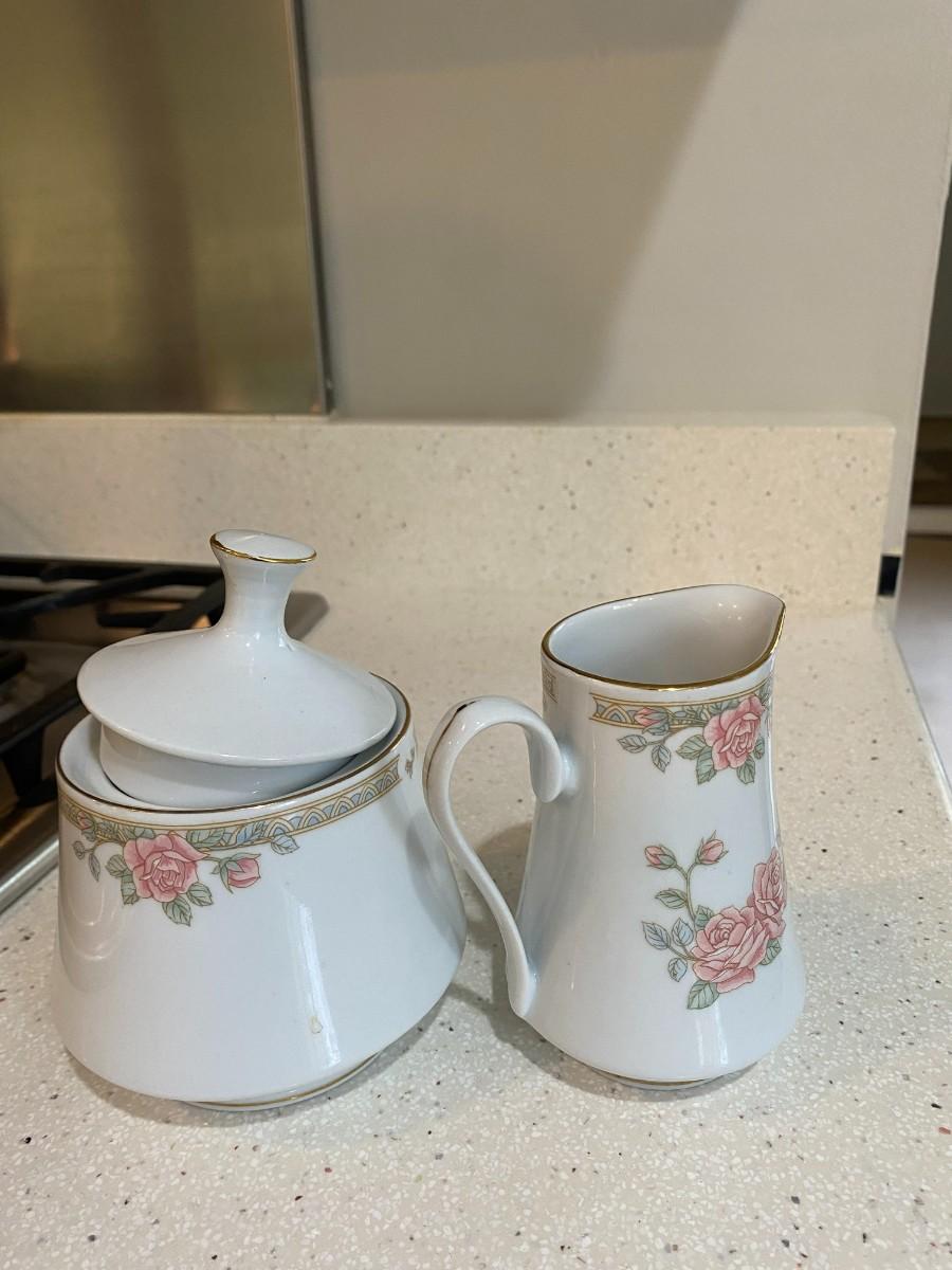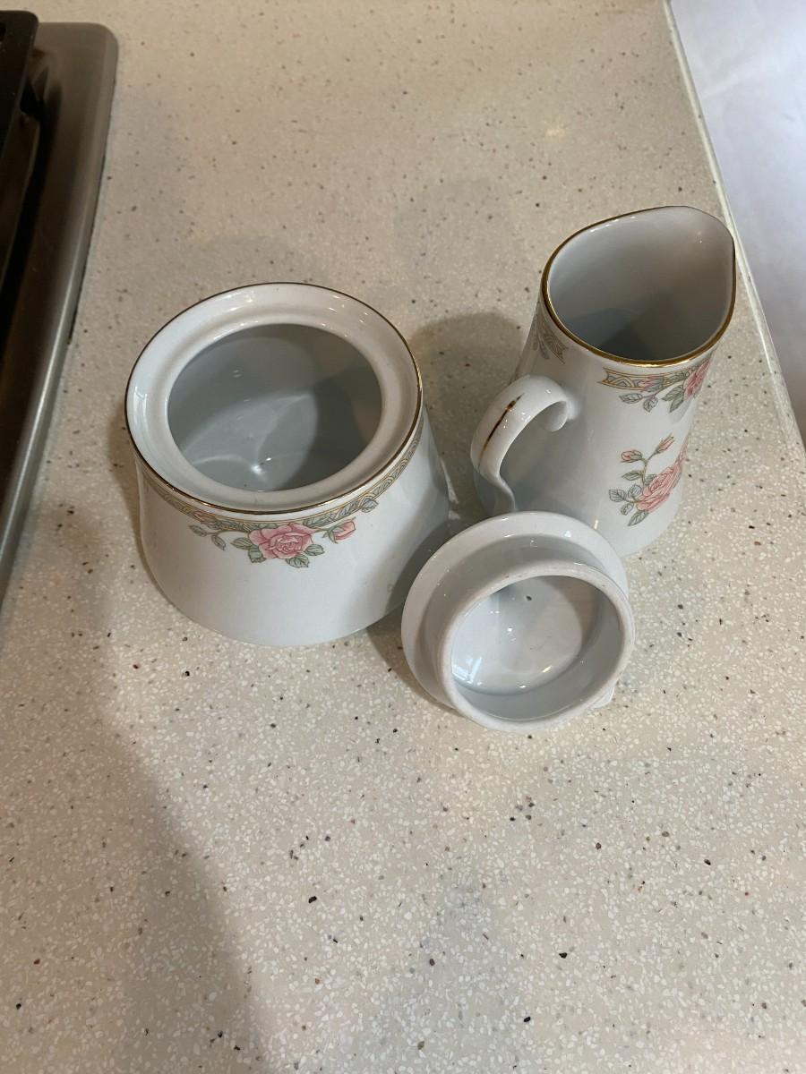 In great condition with no broken pieces. Has beautiful gold trim with pin floral detail.