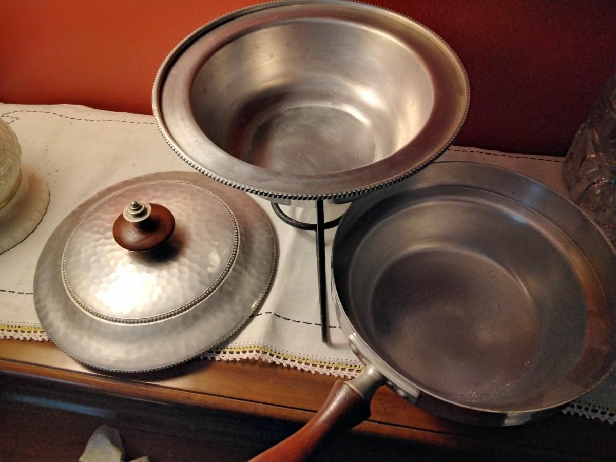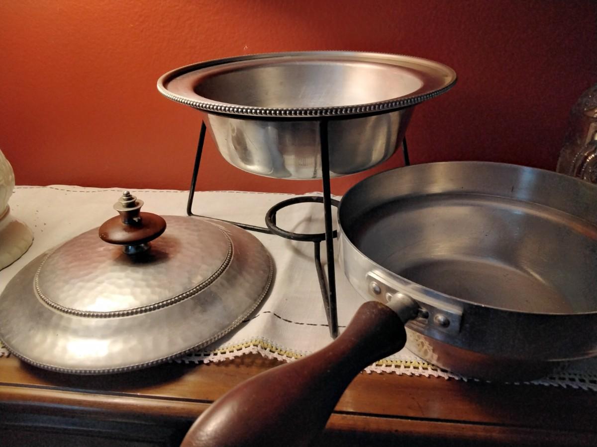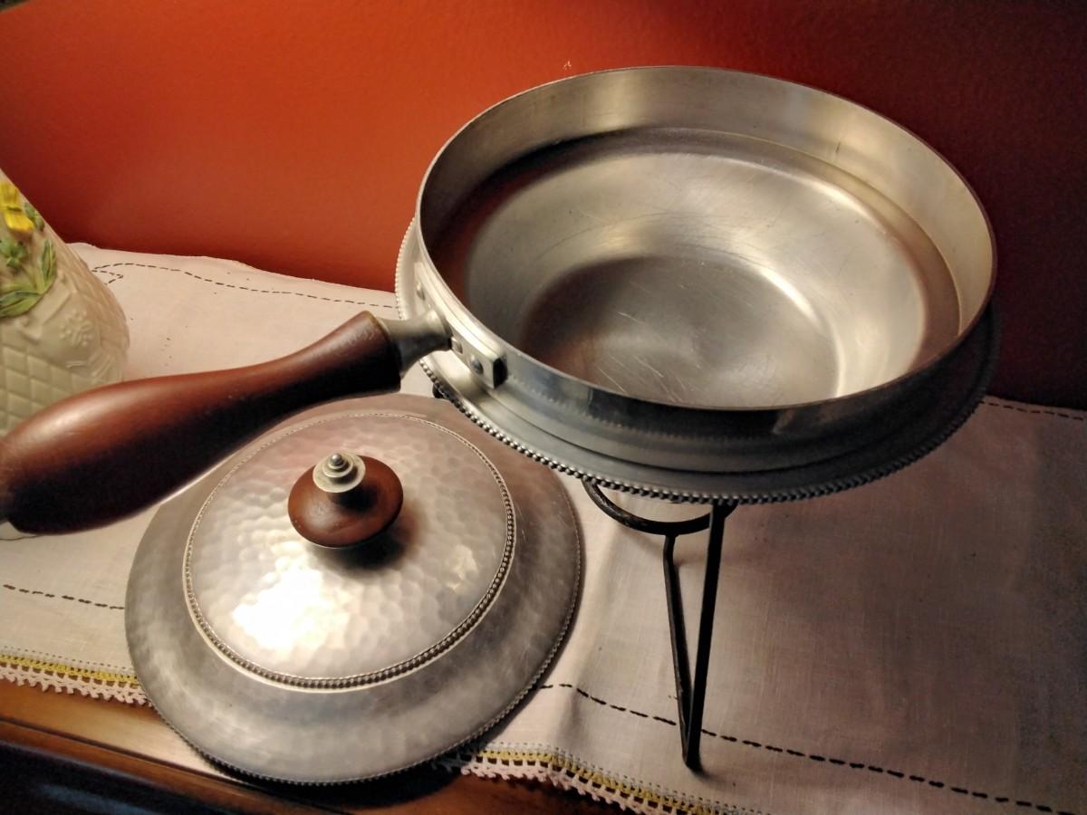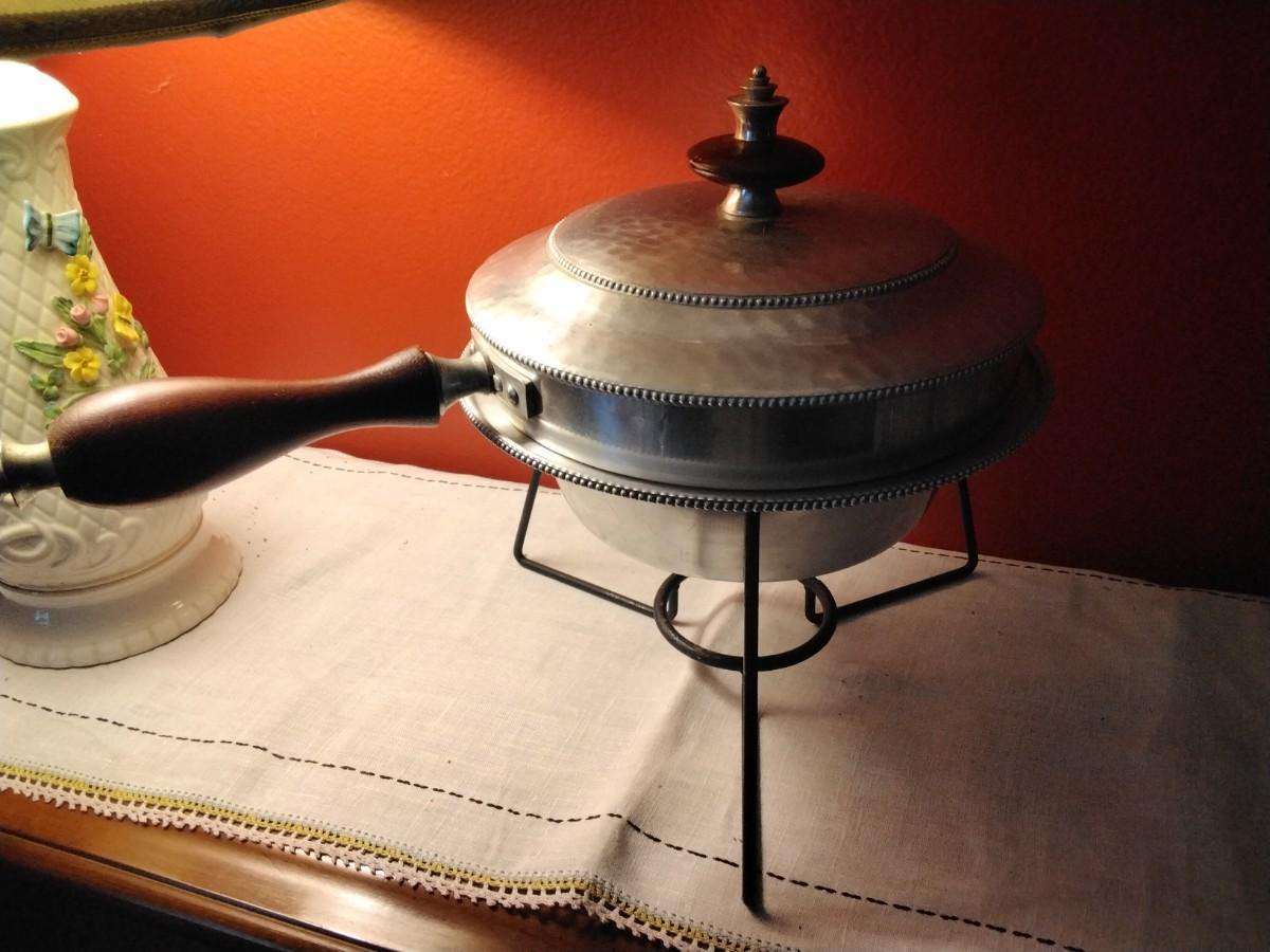 10" Tall from footing to top of handle, 15" Long from end of handle to pan, and 9" Wide. Item has light wear from use,