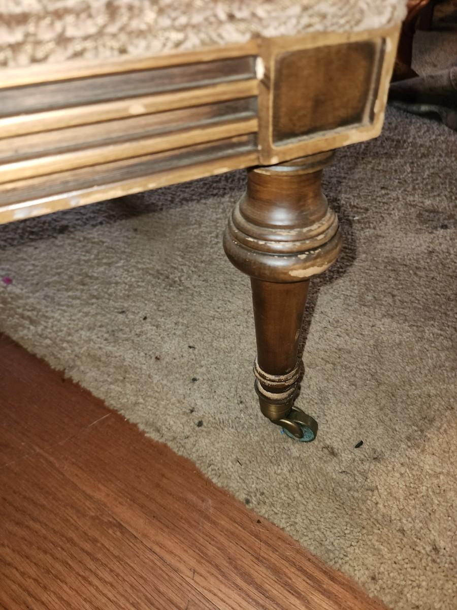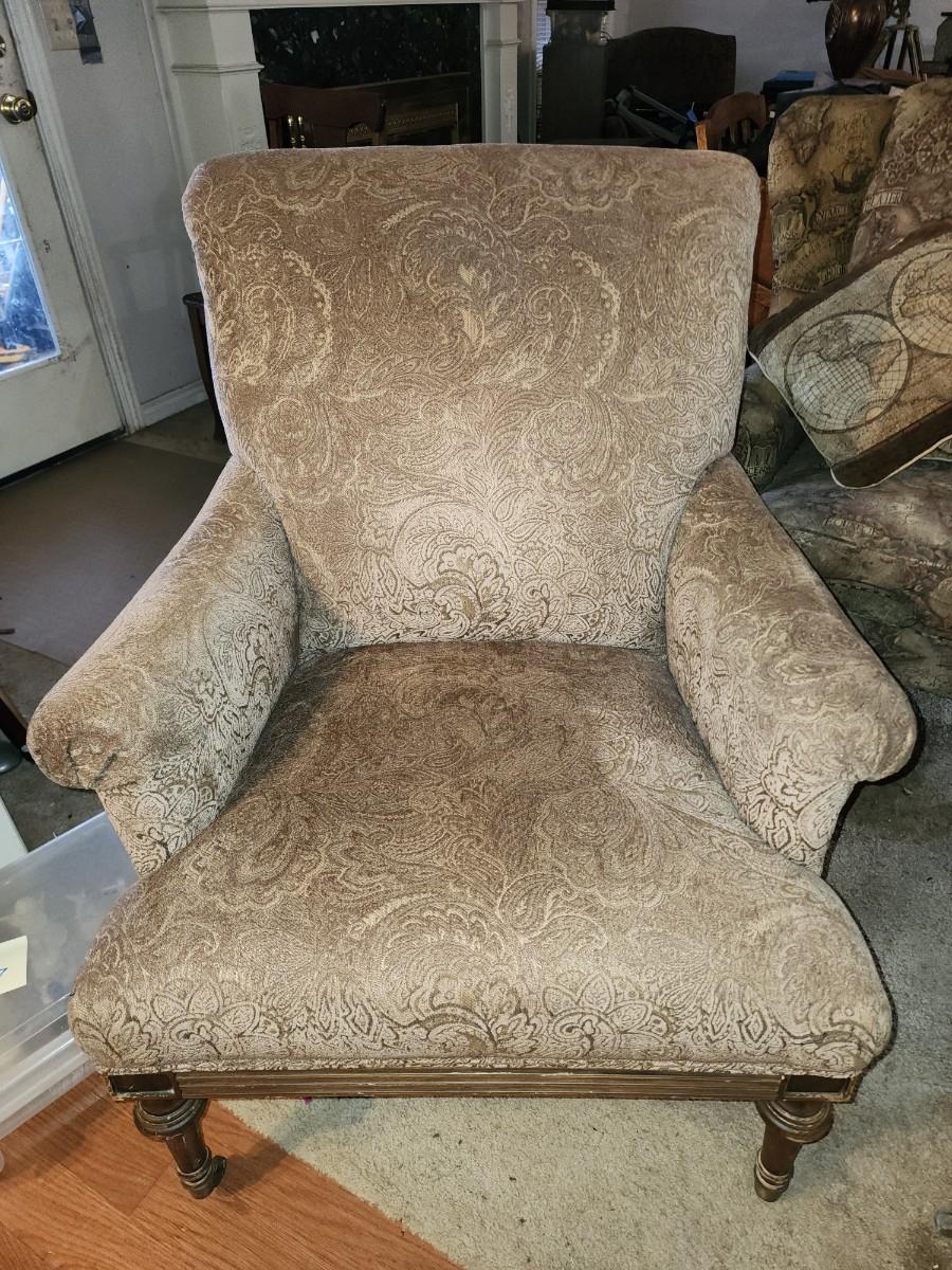 Decent condition with Chanel type fabric. Chair is on wheels. Owner did have dogs if you have any allergy.