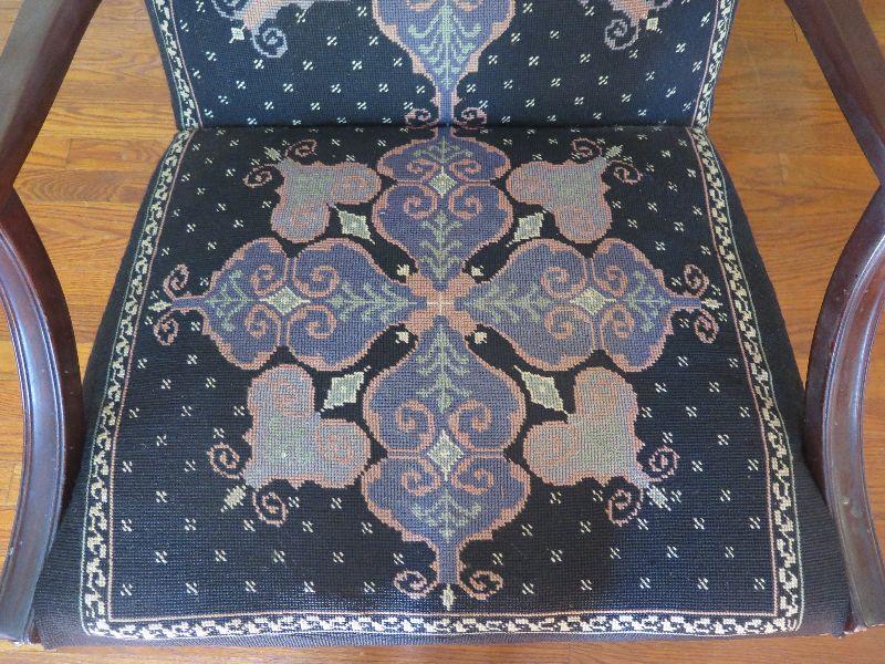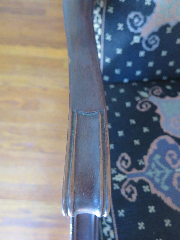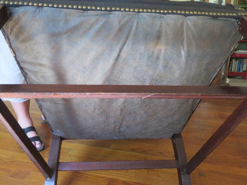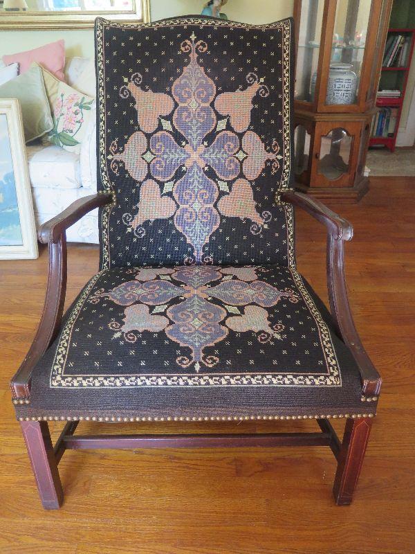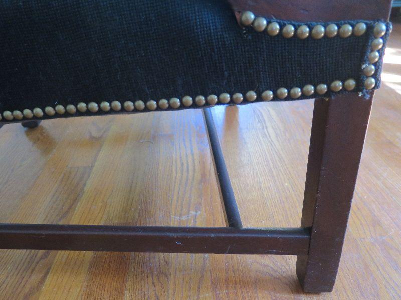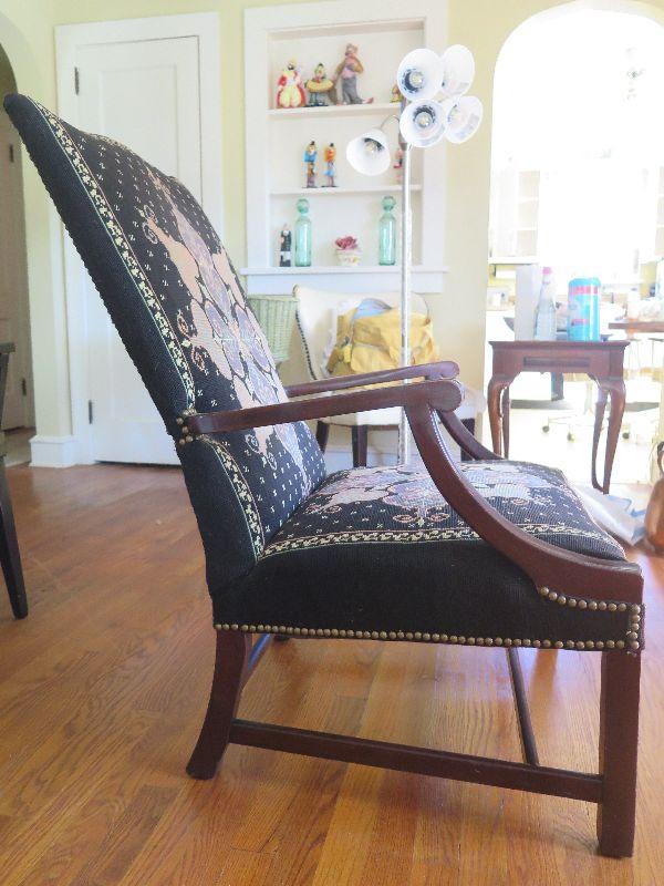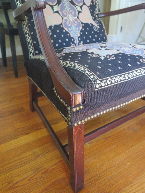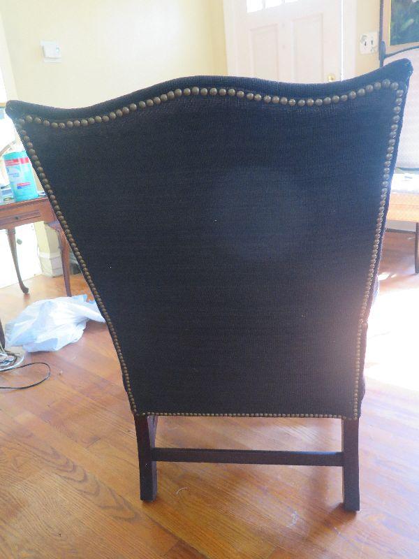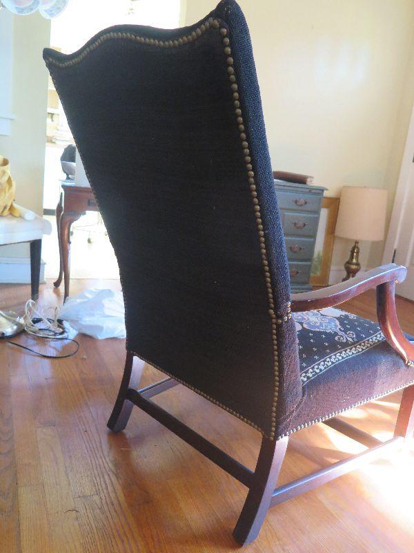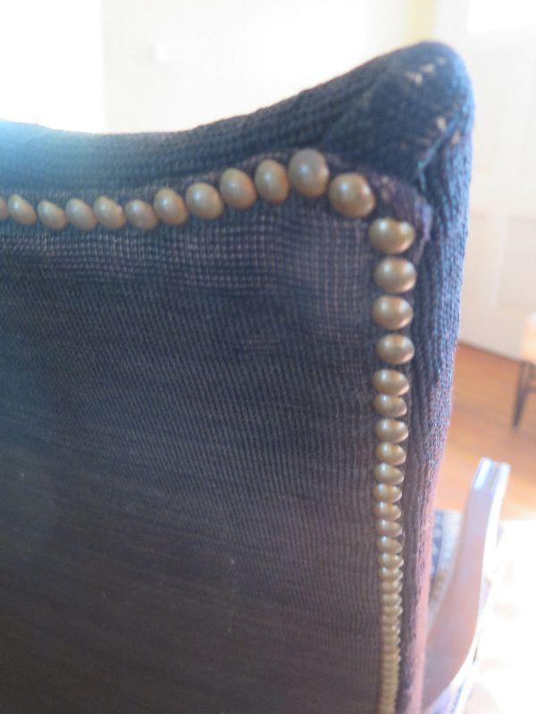 Mid Century chair reupholstered and finished with nail head trim. Stunning. 28x30x39. Bring help to move. Please read Terms and Conditions before placing a bid. Pick up is Saturday, November 30 from 9am to 3 pm in Bridgeton, NJ. All sales are final. All sales are as is, where is. Please review all photos. Any props included in photos are not included in listing. All measurements are approximate.