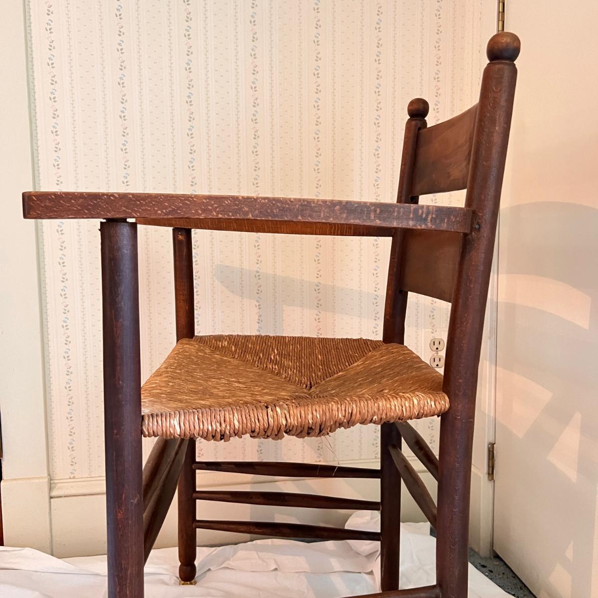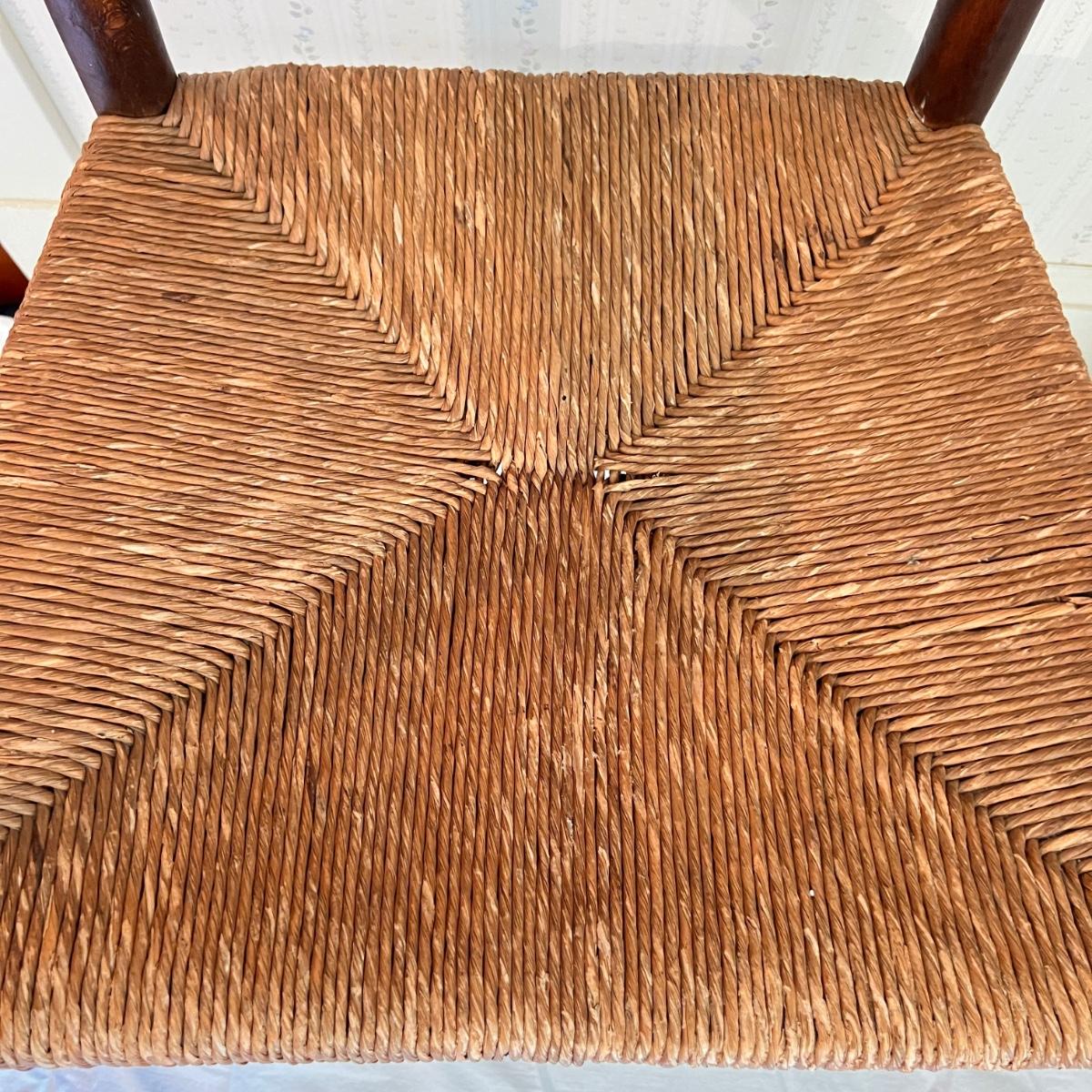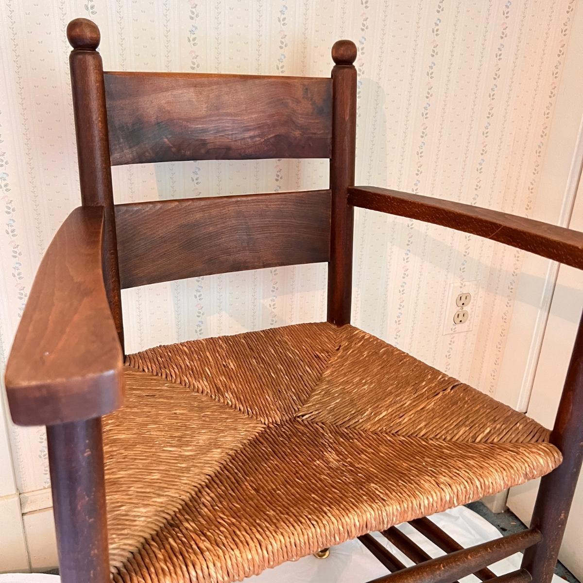 Solid wood with a wicker woven seat. In great vintage condition. Probably 1920's/30's. Someone added metal chair leg glides to protect the feet.