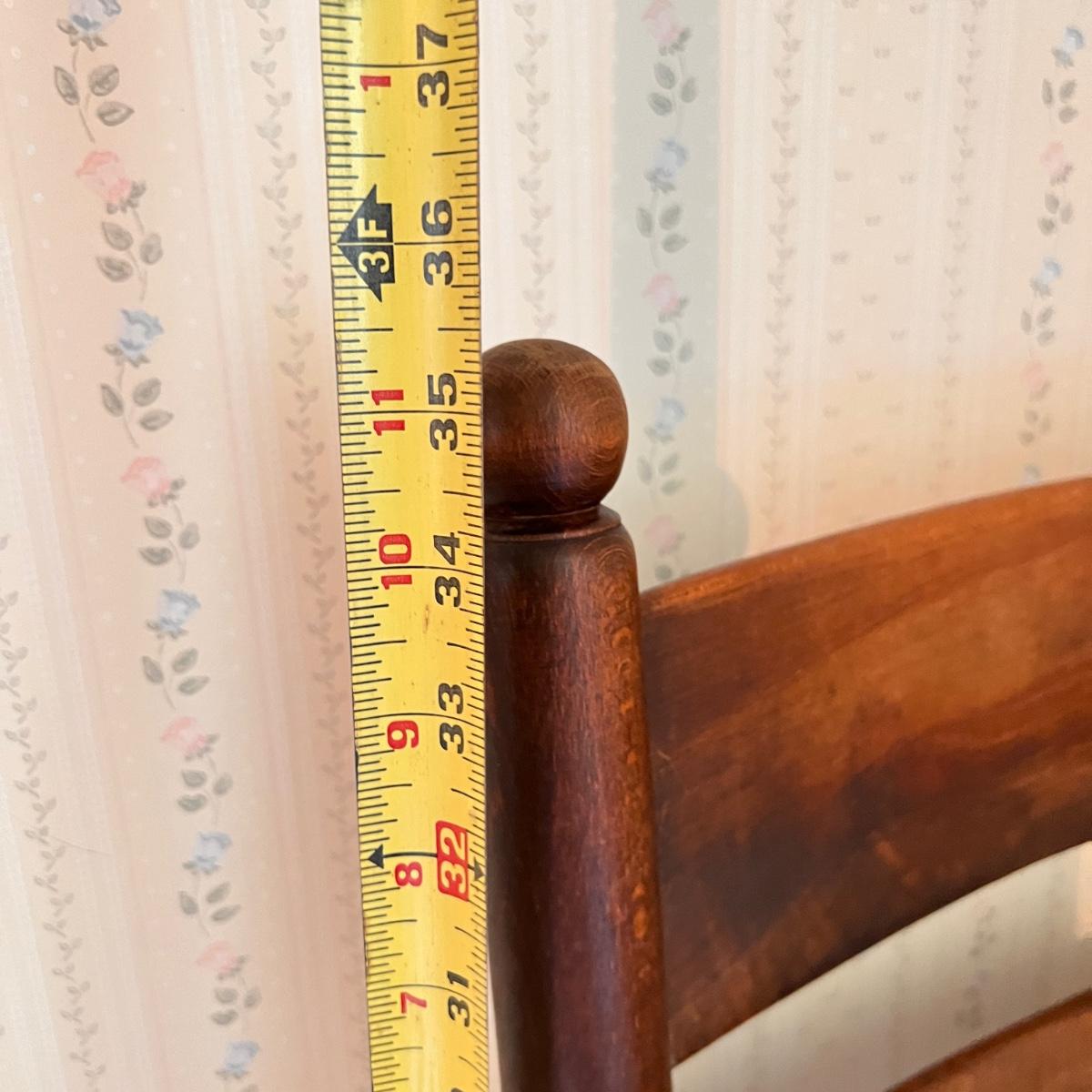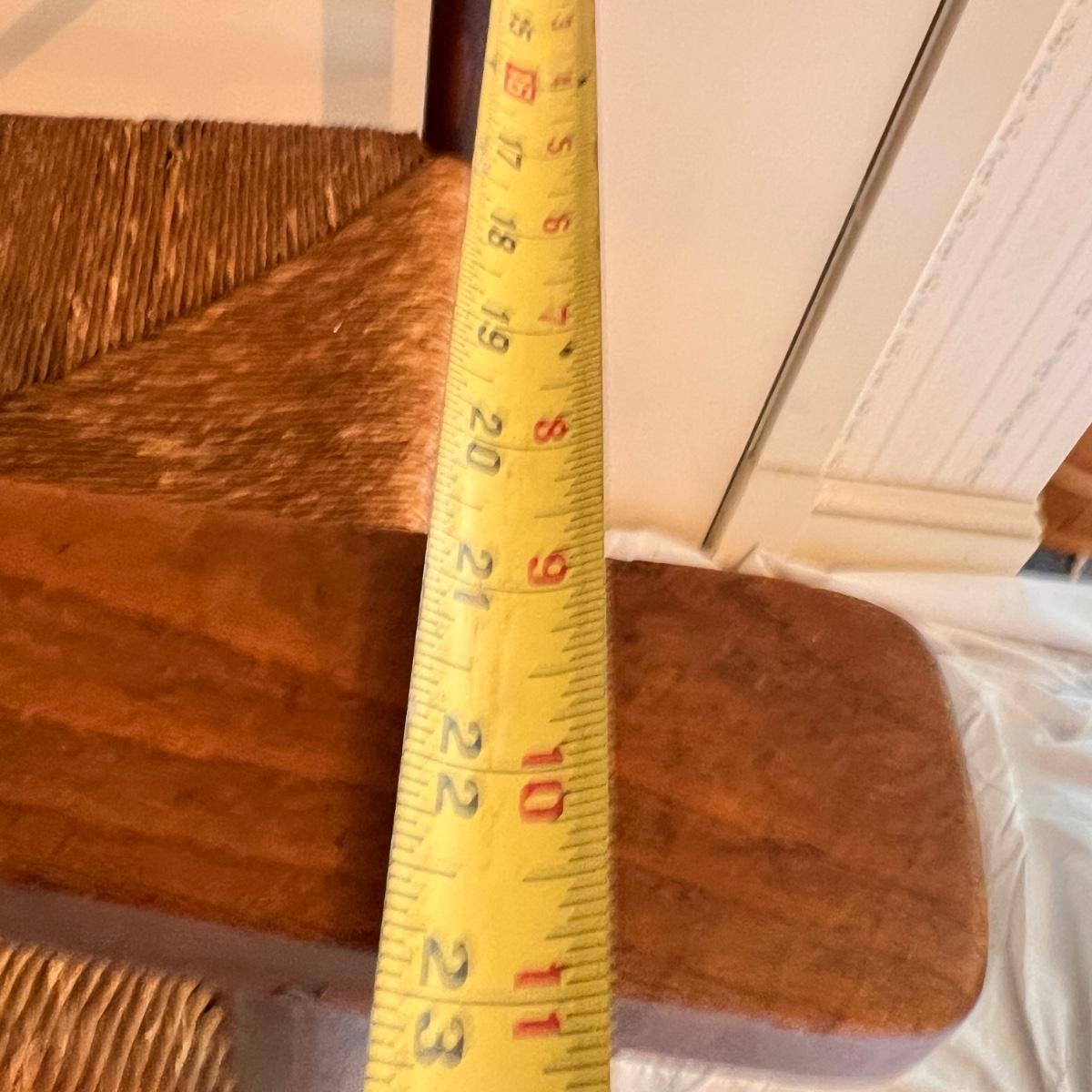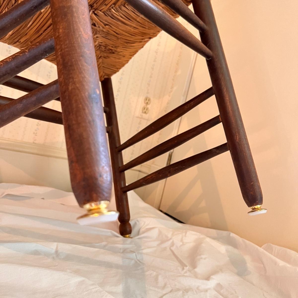 Solid wood with a wicker woven seat. In great vintage condition. Probably 1920's/30's. Someone added metal chair leg glides to protect the feet.