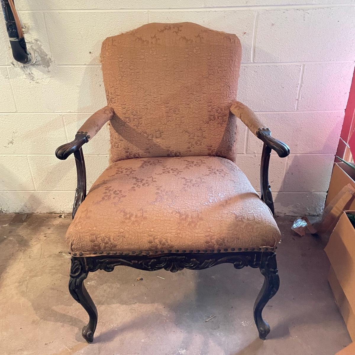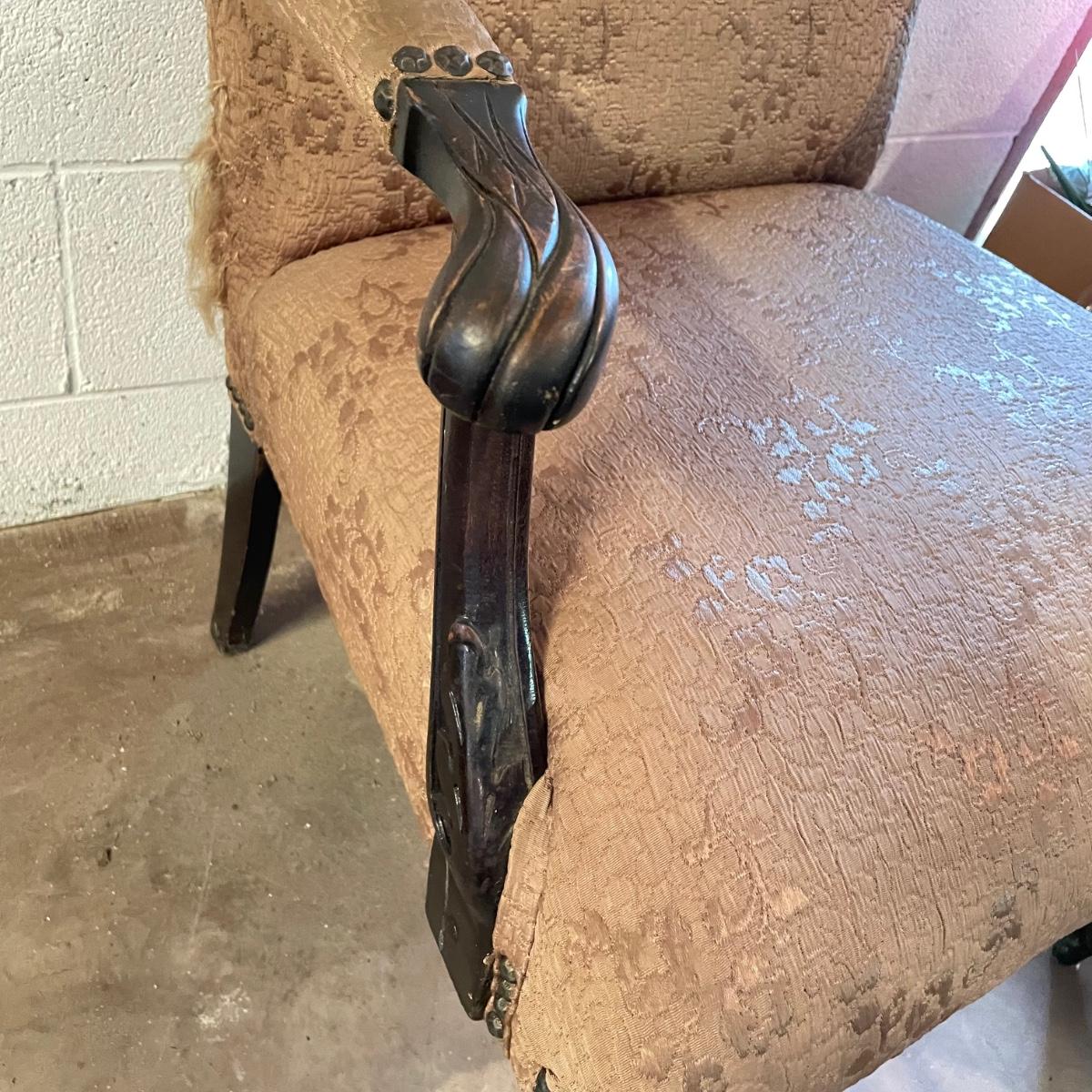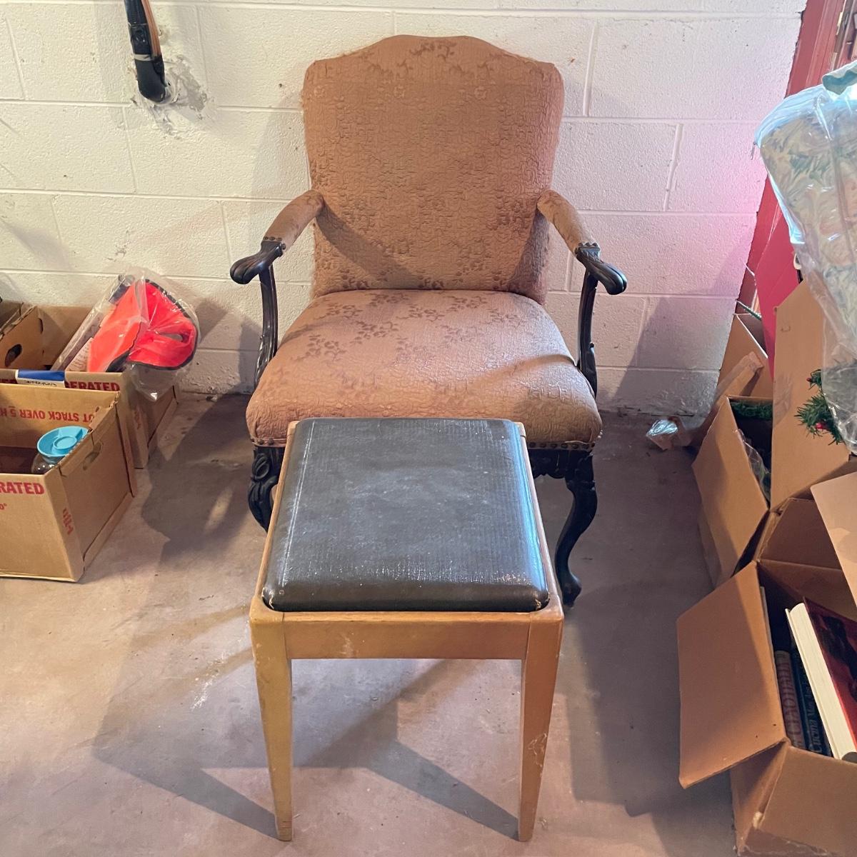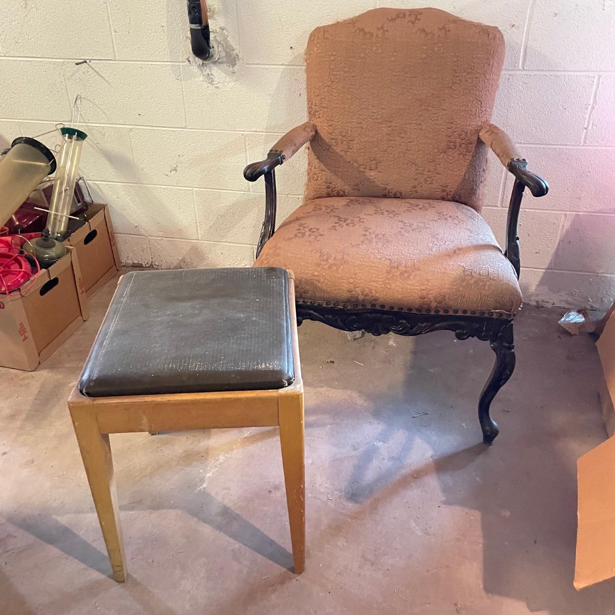 Stunning dark wood arm chair that appears to be antique. Nicely carved wood throughout, but the seat sinks down and the upholstery is very worn. The bones of the chair are very sturdy and this piece deserves to be upgraded with new upholstery and firmer seat cushion. Chair measures approximately 24” x 28” x 35” with a seat height at 18”. The next piece is a Singer Sewing bench with storage. The seat top is fairly stiff, no cushion under its vinyl cover. This piece is also very sturdy, measuring 17” x 15” x 19”. Local pick up only.