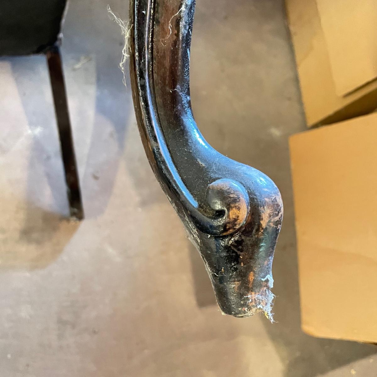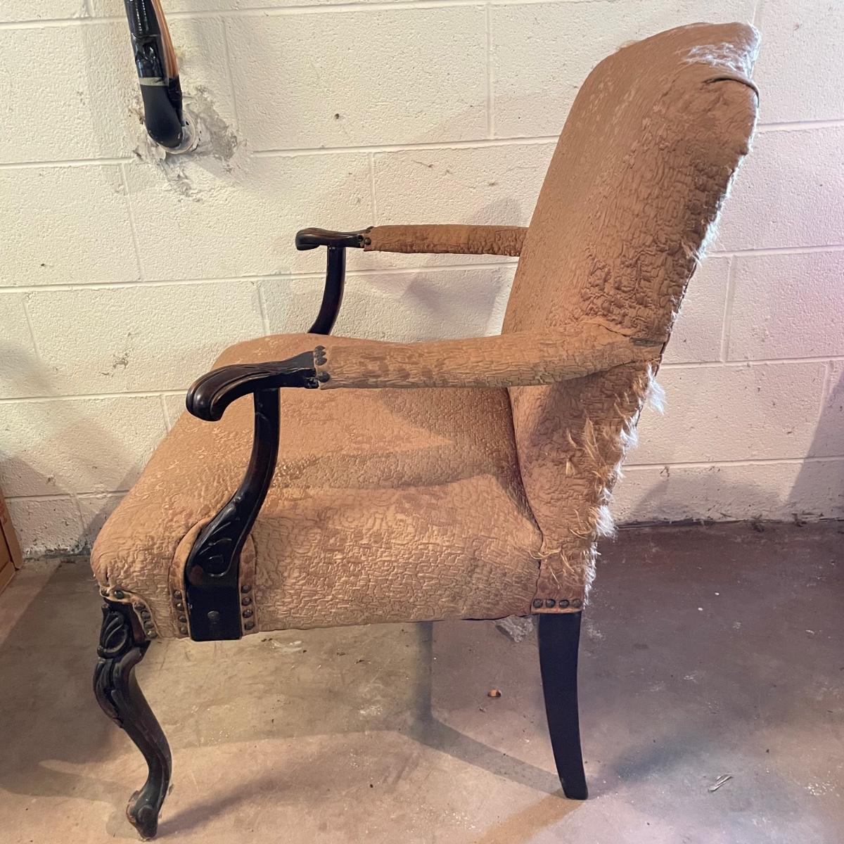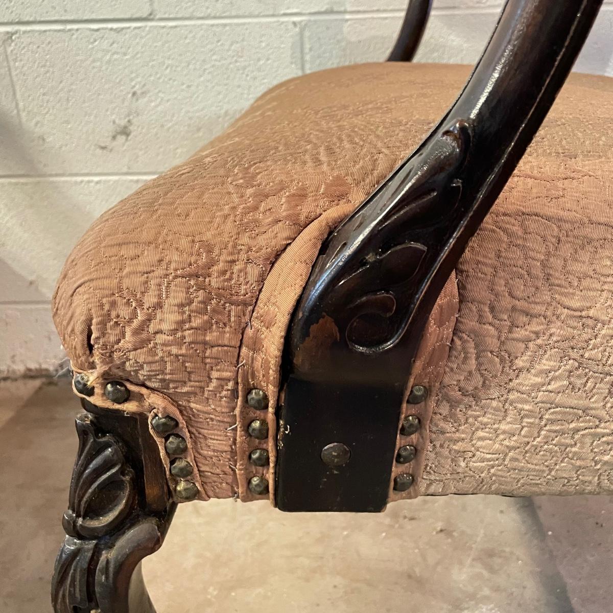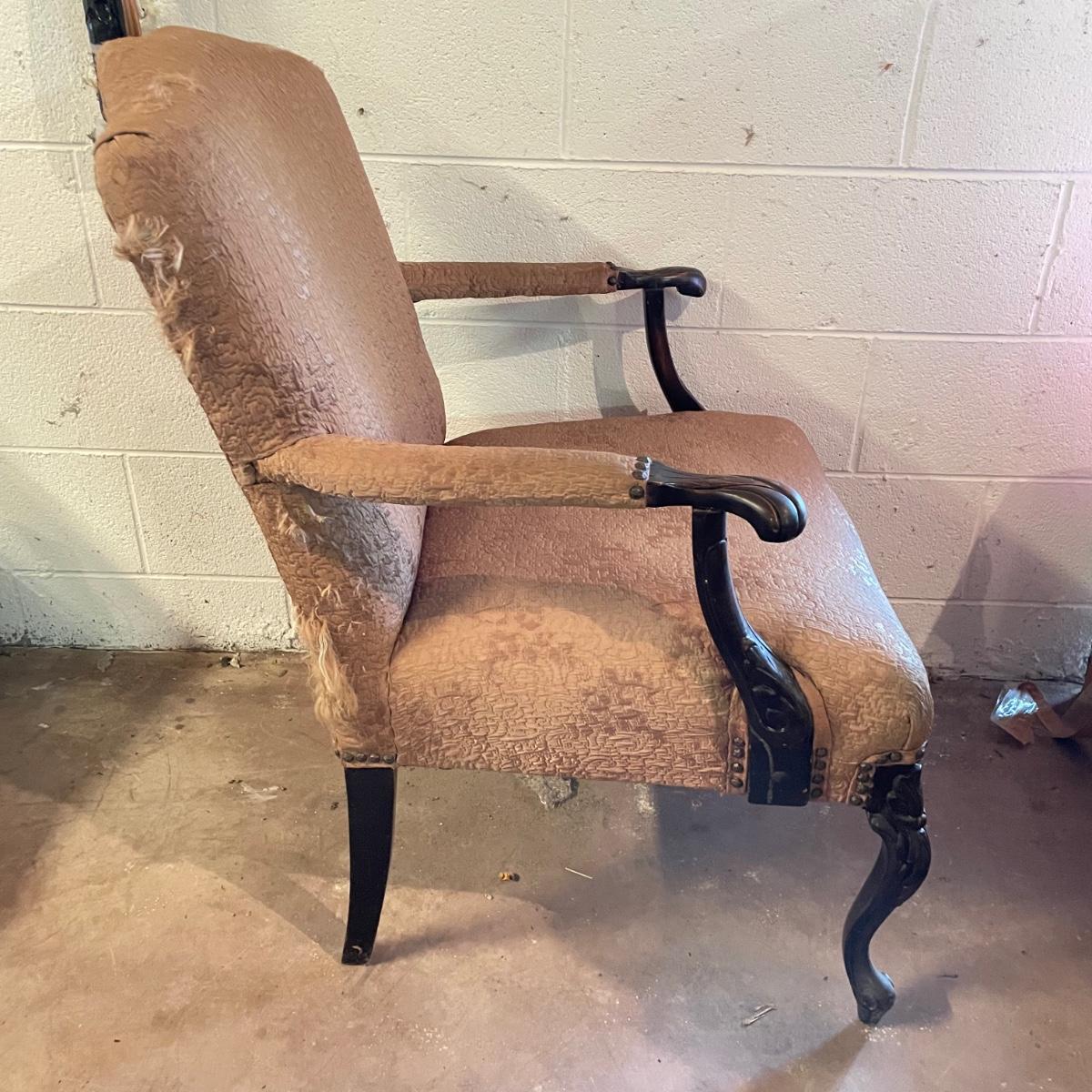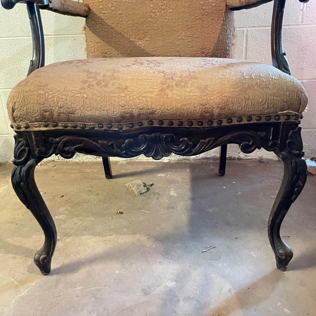 Stunning dark wood arm chair that appears to be antique. Nicely carved wood throughout, but the seat sinks down and the upholstery is very worn. The bones of the chair are very sturdy and this piece deserves to be upgraded with new upholstery and firmer seat cushion. Chair measures approximately 24” x 28” x 35” with a seat height at 18”. The next piece is a Singer Sewing bench with storage. The seat top is fairly stiff, no cushion under its vinyl cover. This piece is also very sturdy, measuring 17” x 15” x 19”. Local pick up only.
