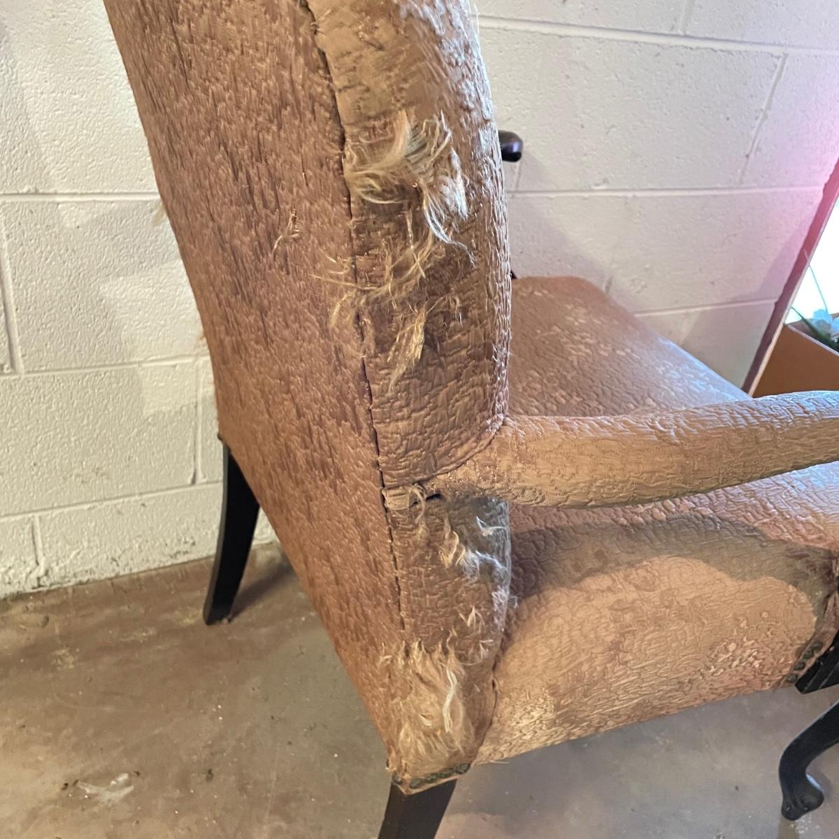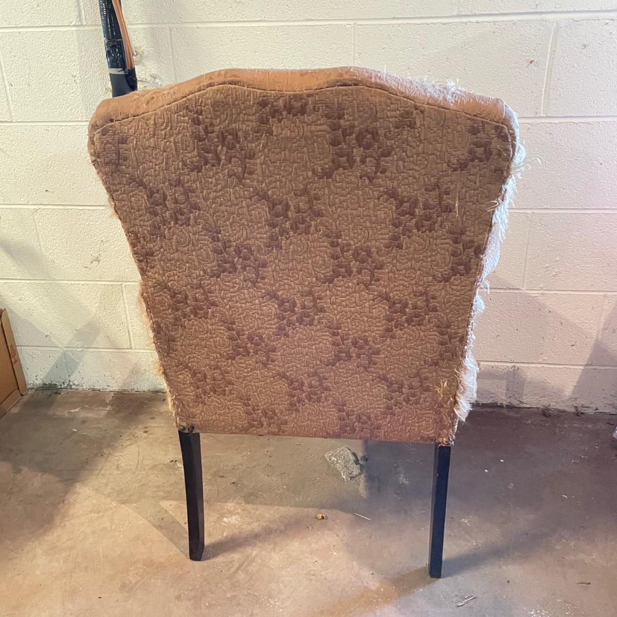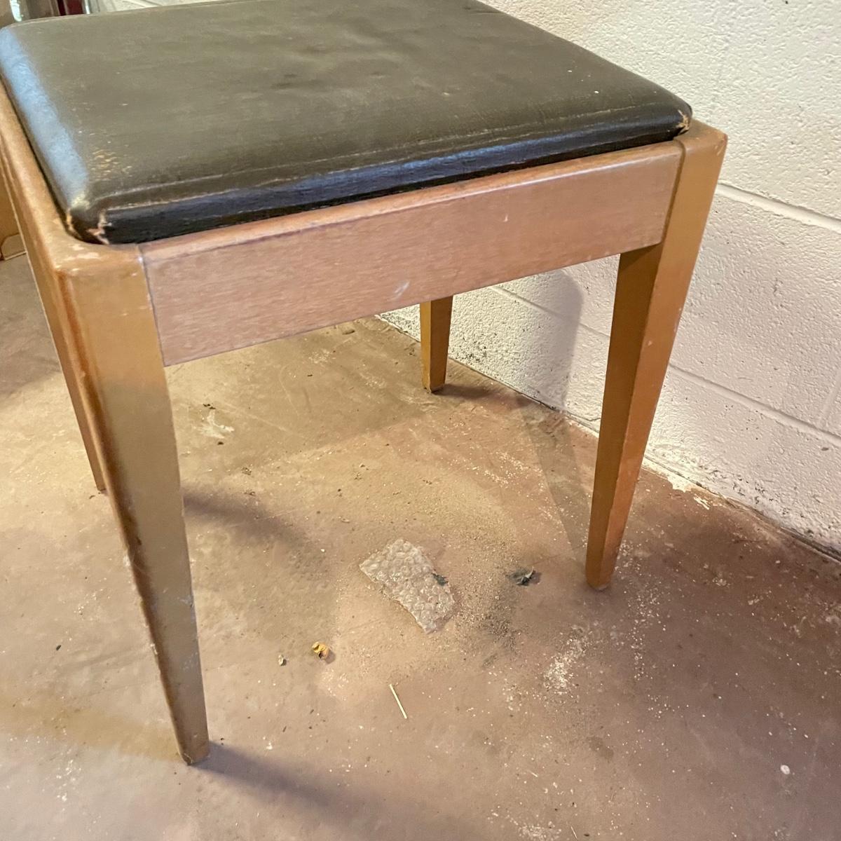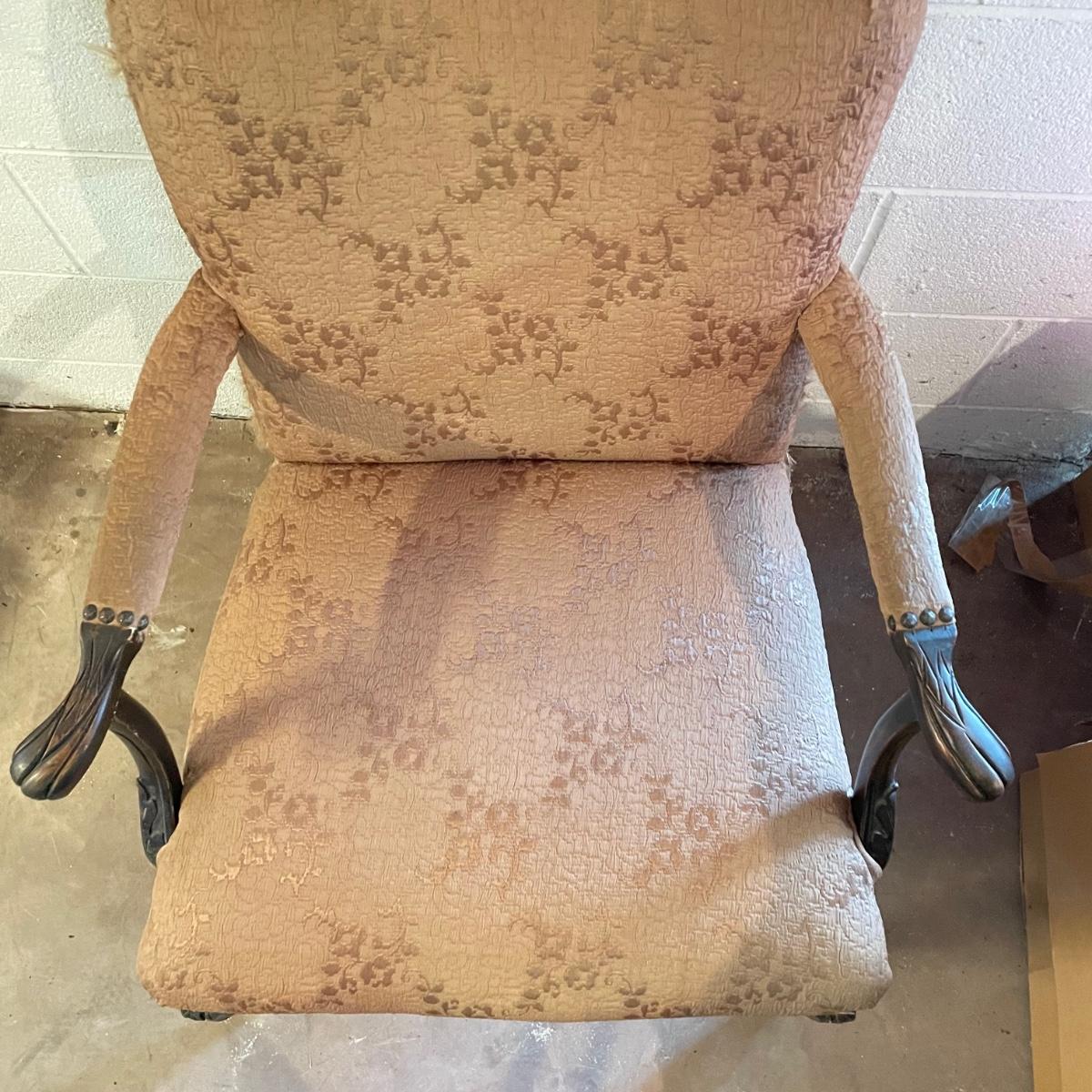 Stunning dark wood arm chair that appears to be antique. Nicely carved wood throughout, but the seat sinks down and the upholstery is very worn. The bones of the chair are very sturdy and this piece deserves to be upgraded with new upholstery and firmer seat cushion. Chair measures approximately 24” x 28” x 35” with a seat height at 18”. The next piece is a Singer Sewing bench with storage. The seat top is fairly stiff, no cushion under its vinyl cover. This piece is also very sturdy, measuring 17” x 15” x 19”. Local pick up only.