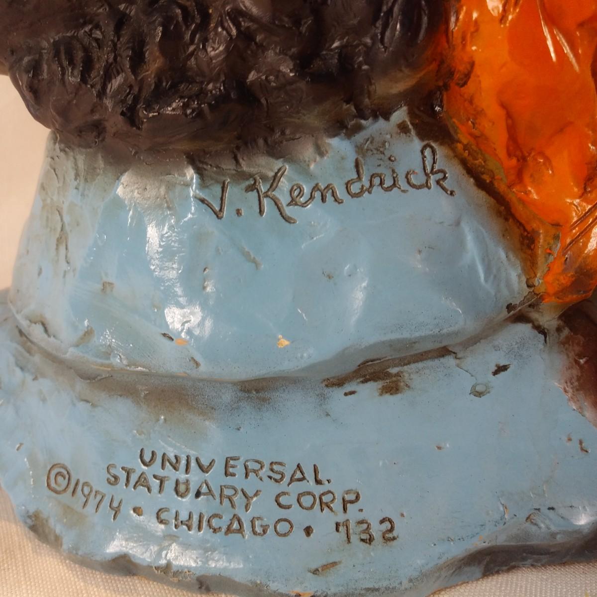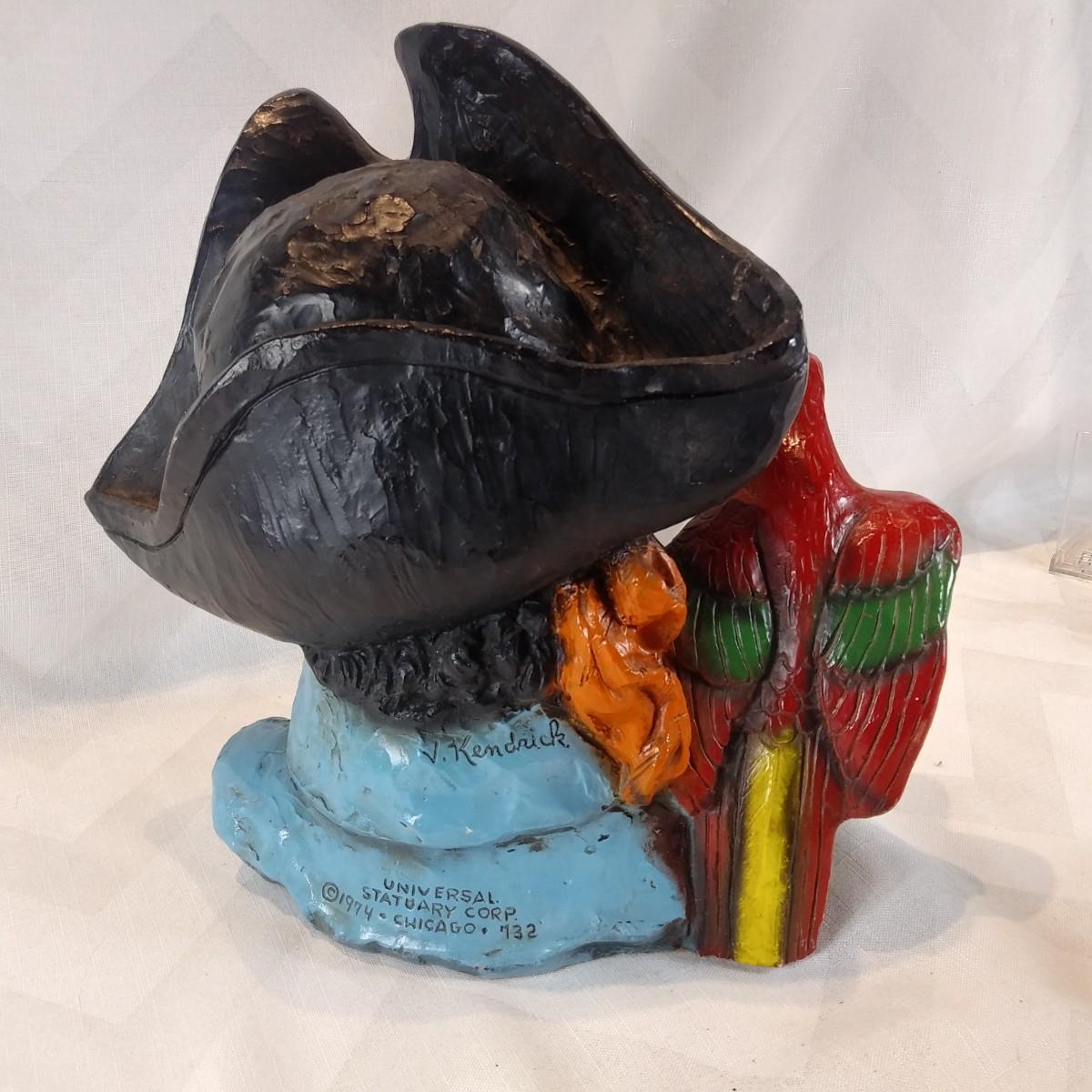 This auction lot is for a very heavy Chalk Pirate which is marked Universal Statuary Corp. - 1977 - Chicago #732. Signed by J. Kendrick. The bottom is felted and statue is in very good condition. It stands about 11-inches tall. Universal Statuary made many of the chalk items given as prizes at Fountain Ferry. Could this be one? NOTE: LOCAL PICK UP ONLY.