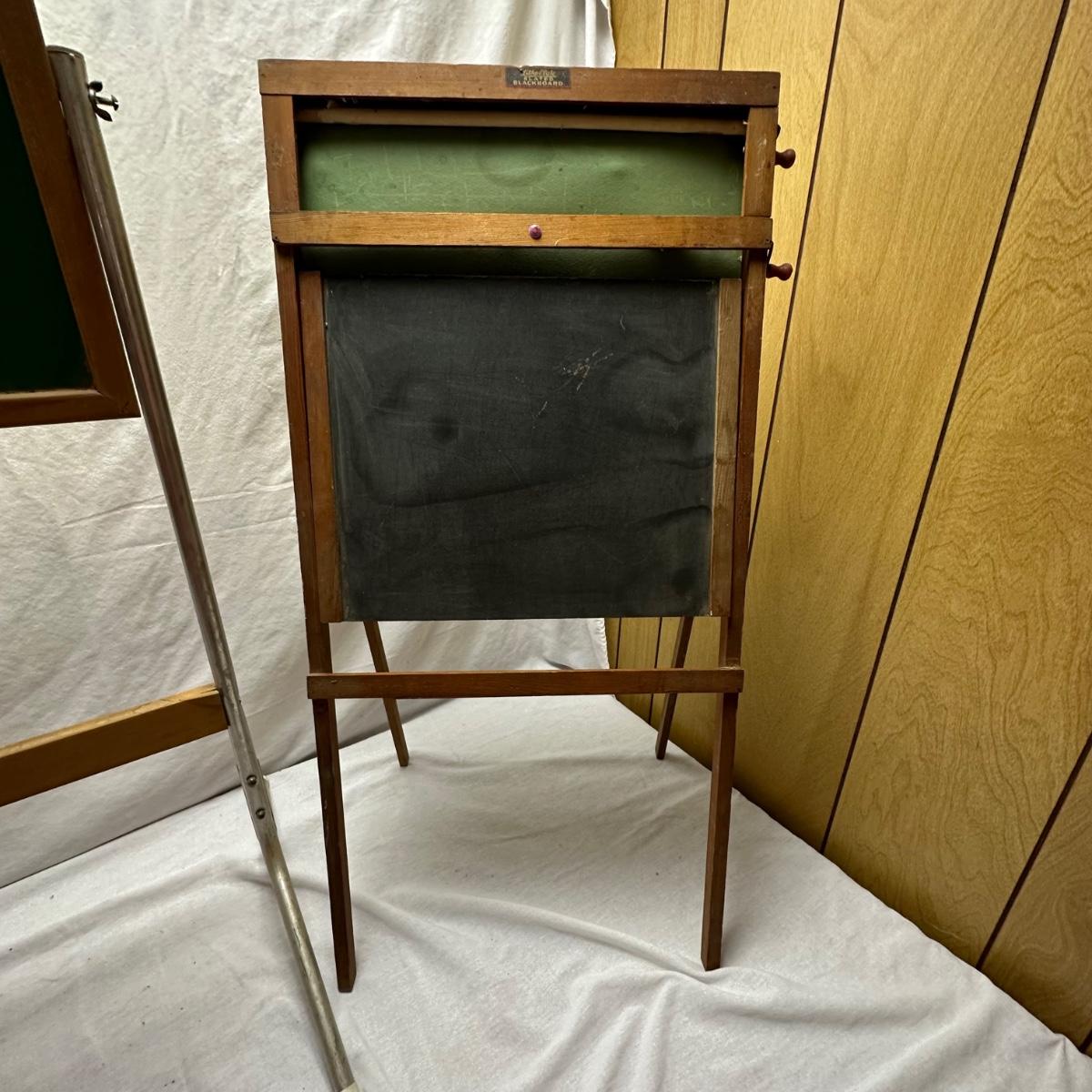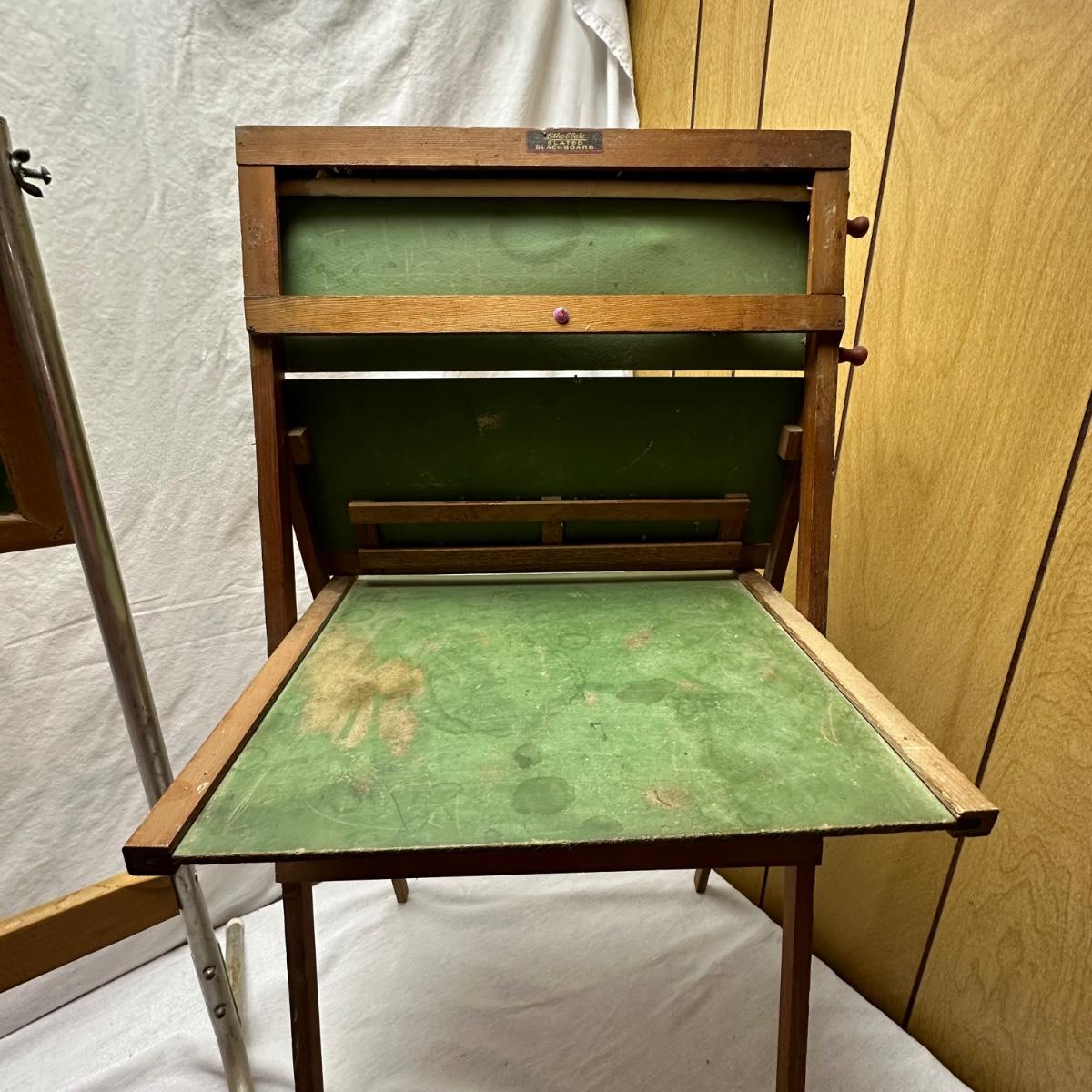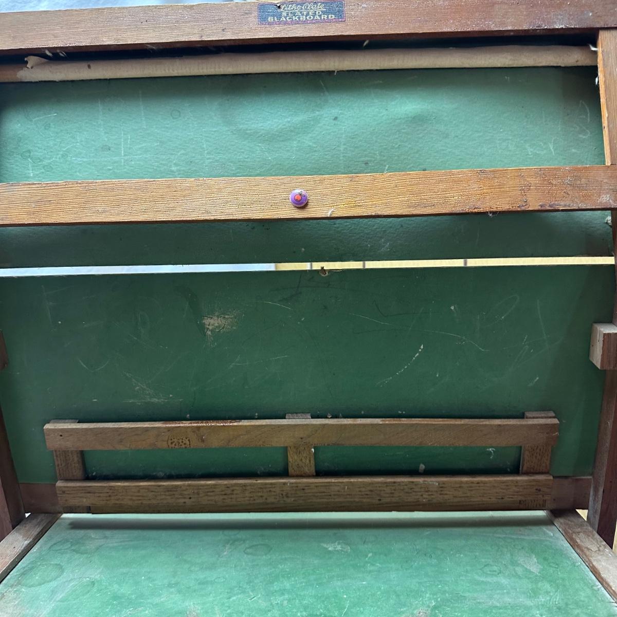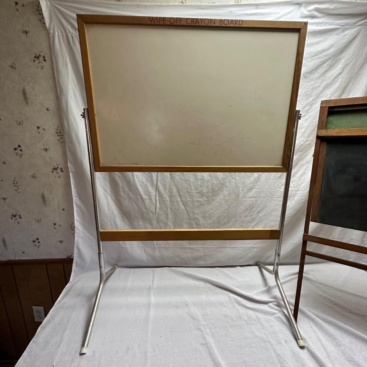 Little Plate Slated Blackboard opens out into desk top and scrolling easel. Measures 18” x 13.5” x 36”H. Double sided chalkboard with wipe off crayon board measures 31” x 19” x 46”H. Local pickup only.