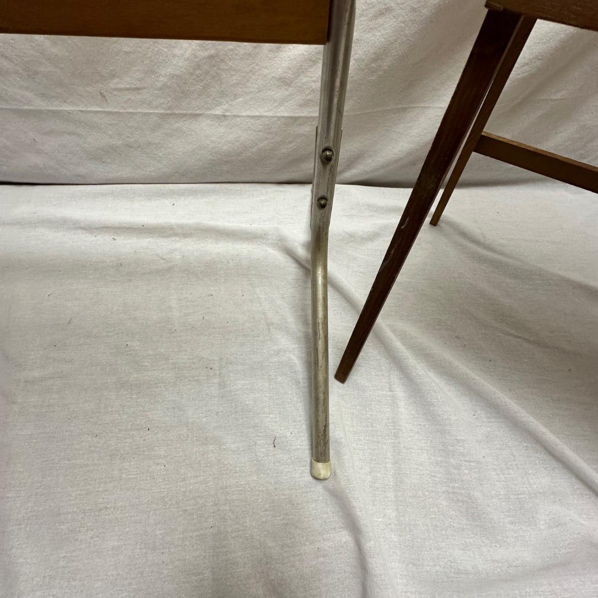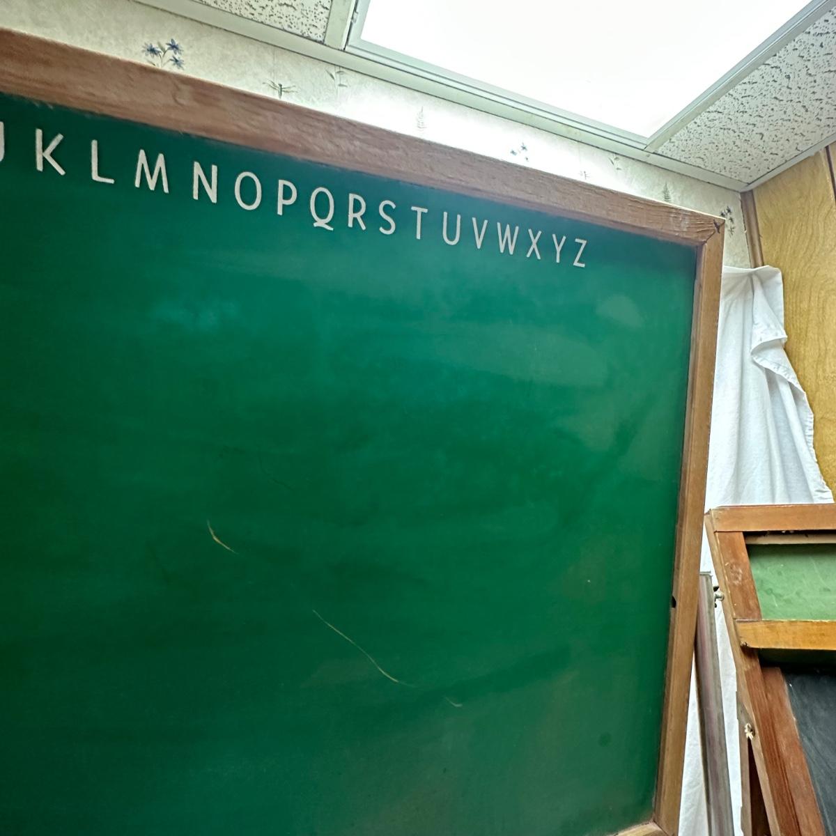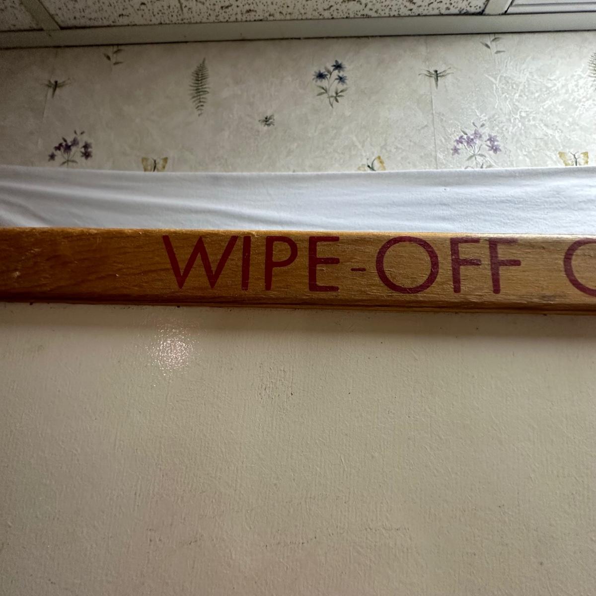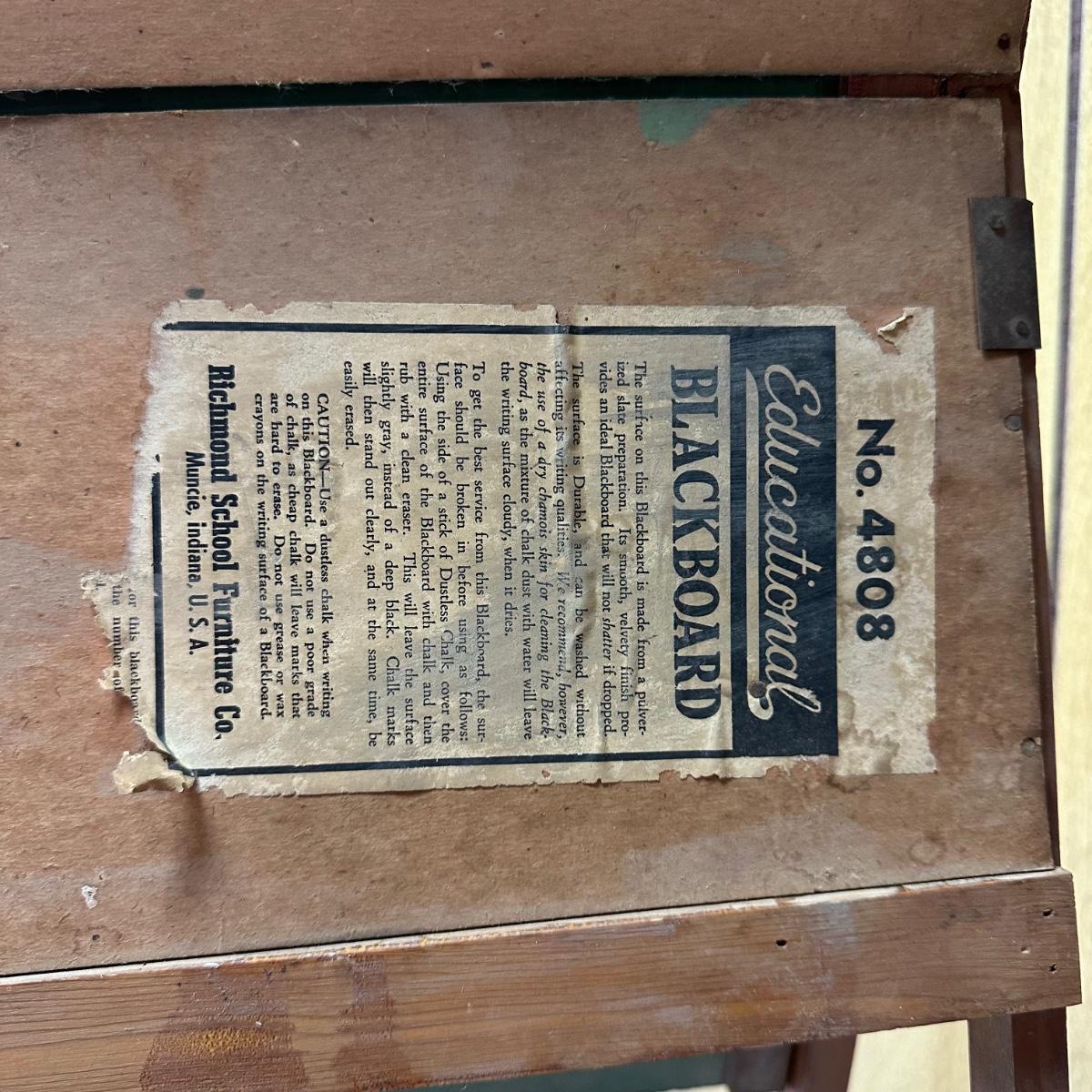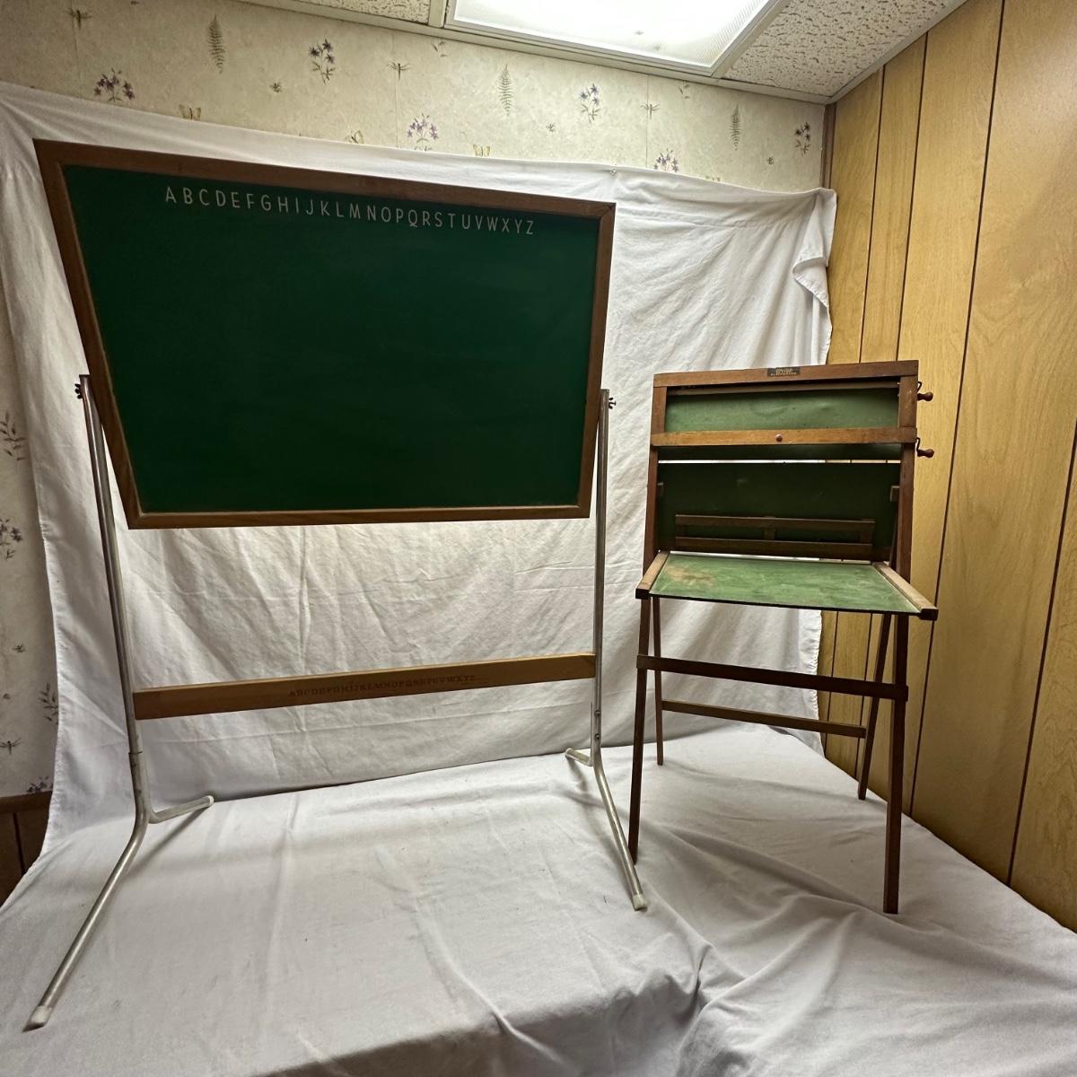 Little Plate Slated Blackboard opens out into desk top and scrolling easel. Measures 18” x 13.5” x 36”H. Double sided chalkboard with wipe off crayon board measures 31” x 19” x 46”H. Local pickup only.