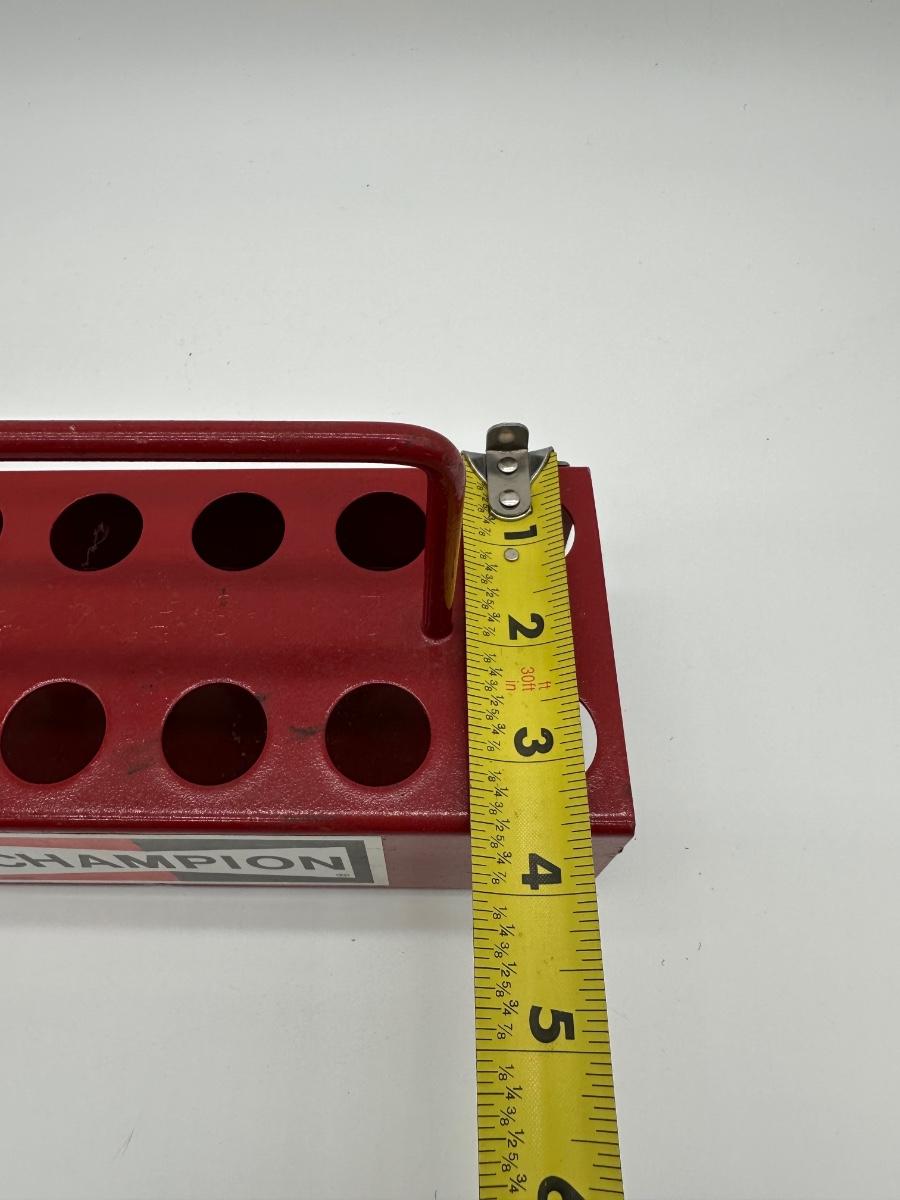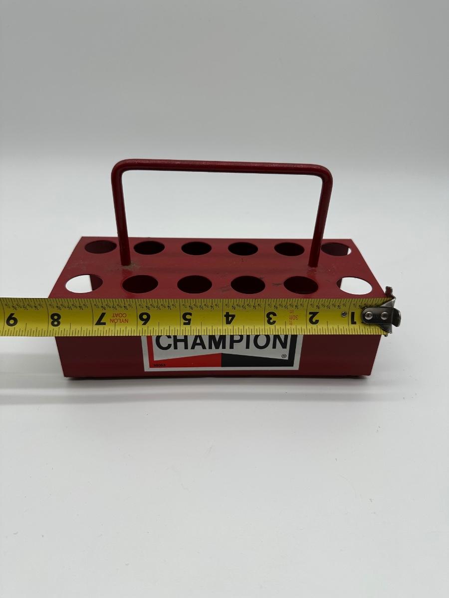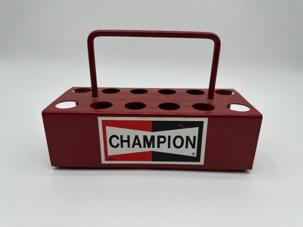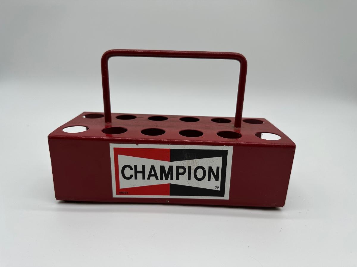 Vintage Champion metal spark plug caddy featuring the classic red Champion logo. Heavy-duty painted steel construction with integrated carry handle and multiple round holes designed for spark plugs, small tools, or shop organization. Commonly used in auto garages, service stations, and race shops. Shows honest wear from age and use, adding to its authentic vintage character. Great display piece for automotive, gas & oil, or garage décor collections.