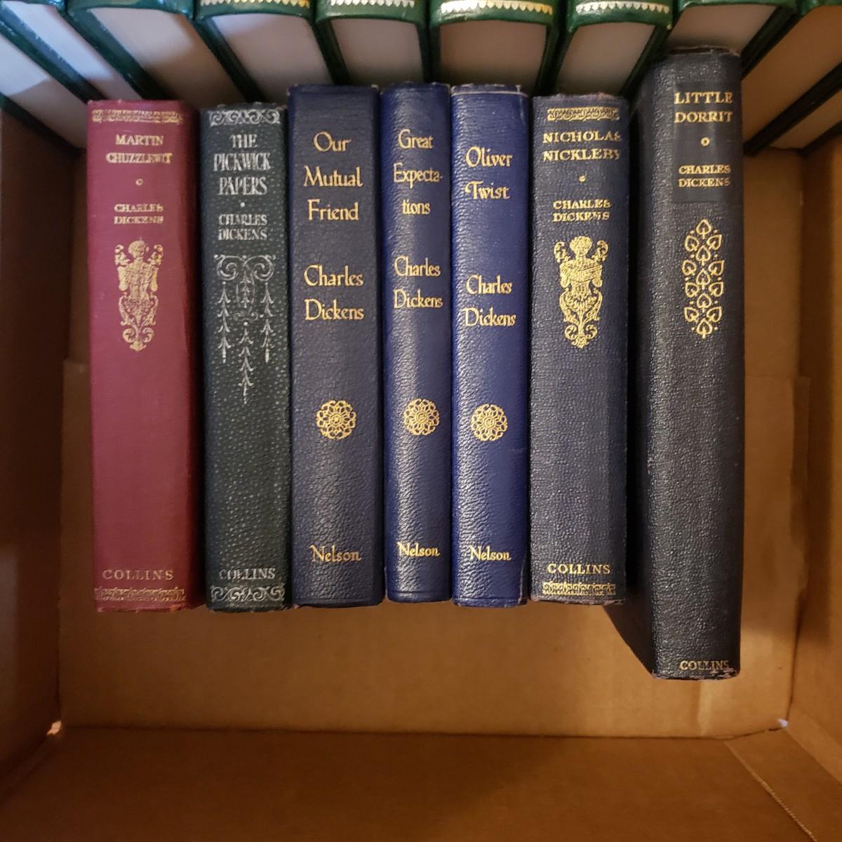 This vintage book lot has a variety of Charles Dickens books, see pictures for titles. For their age the books appear to be in good condition with unbroken bindings. The Guild Publishing books from England have a variety of authors and titles, see pictures. This series are hard bound green with gold accents.