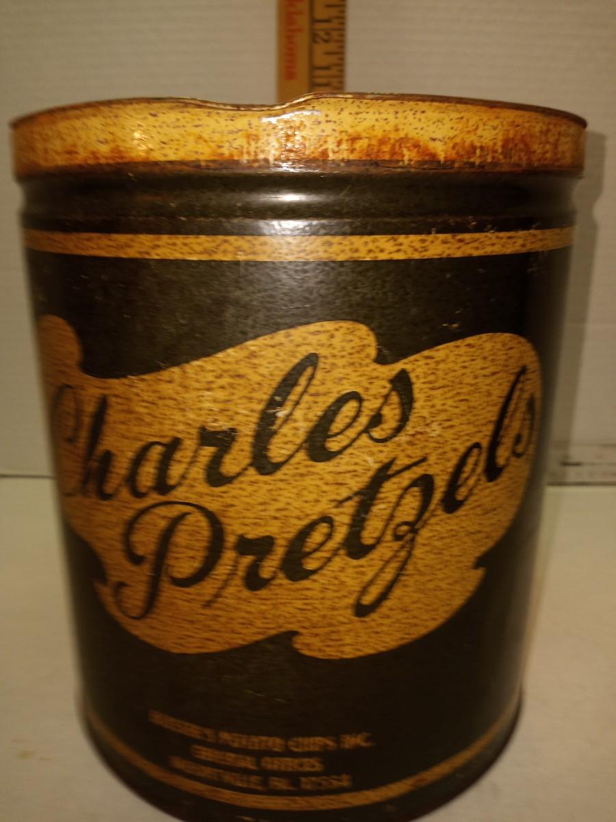 VINTAGE CHARLES PRETZELS TIN - MOUNTVILLE PA ADVERTISING - PRIMITIVE DECOR