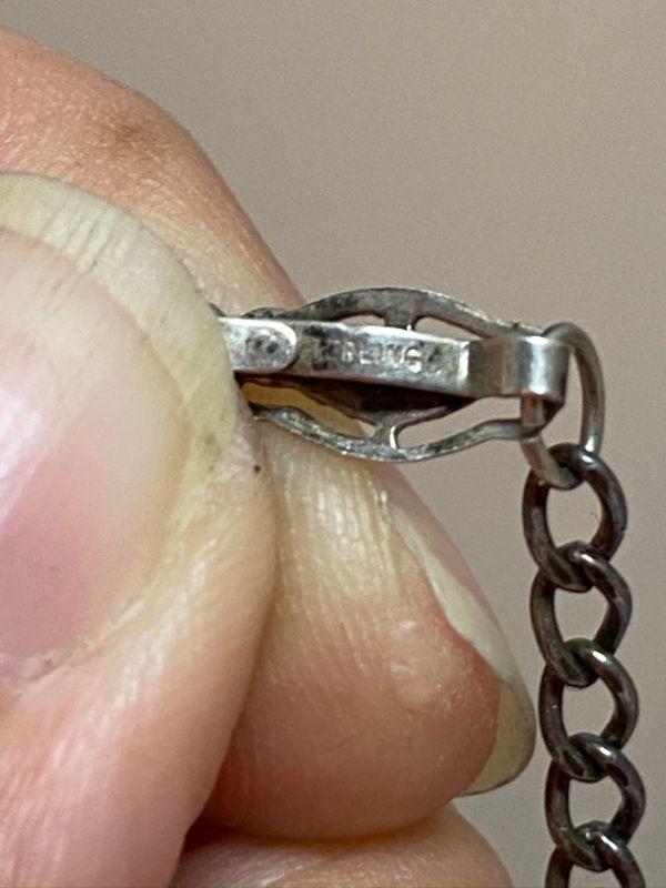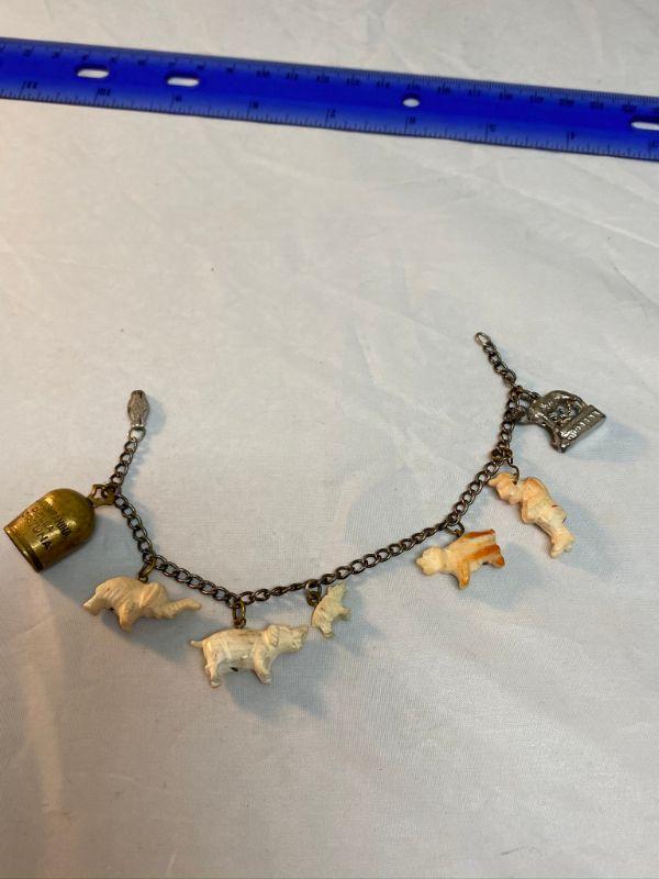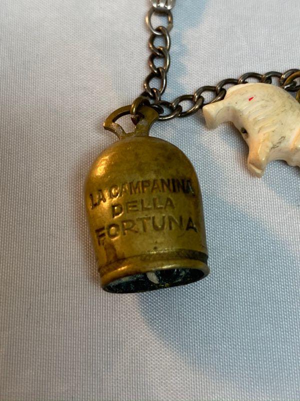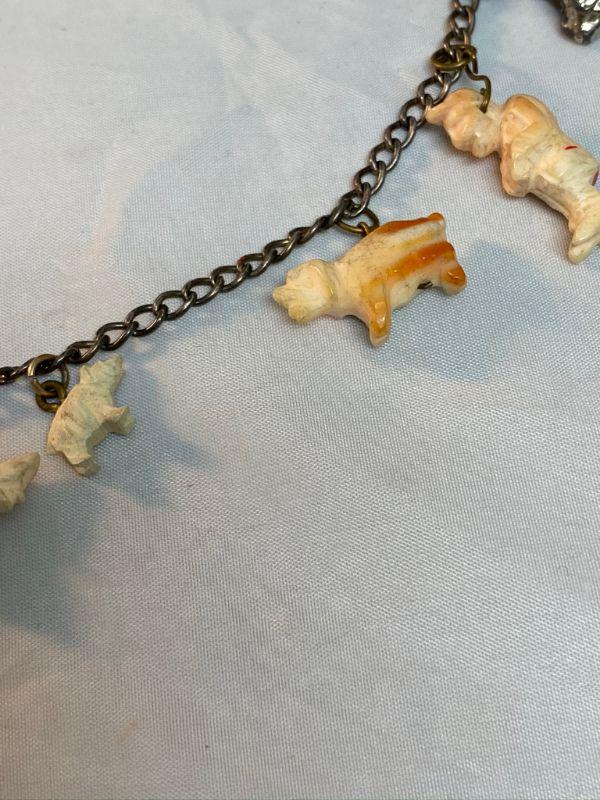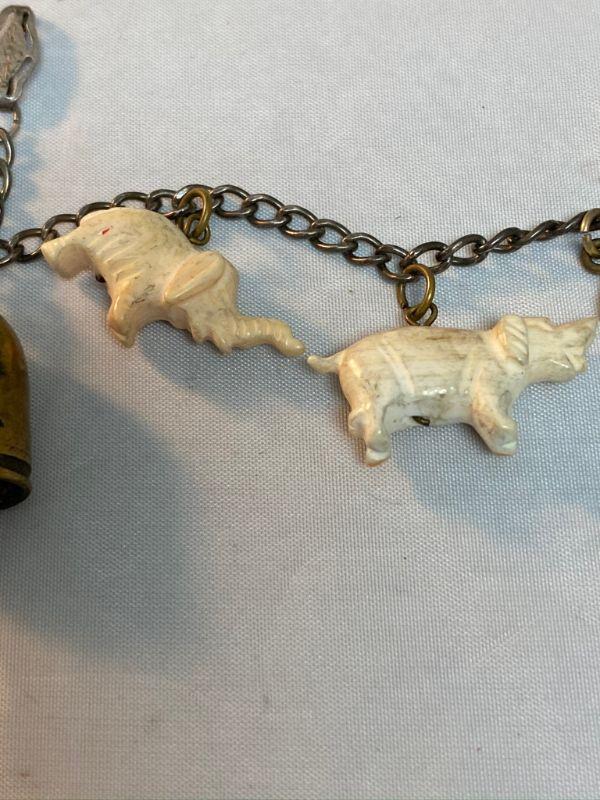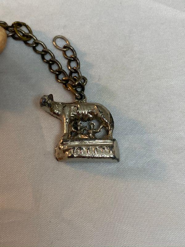 Vintage Charm Bracelet. Has 7 charms hanging from it. One is a small brass bell from Capri, 5 are carved from stone, the last is silvertone metal that says Roma. Unsure of age, looks old. The clip clasp says sterling.
