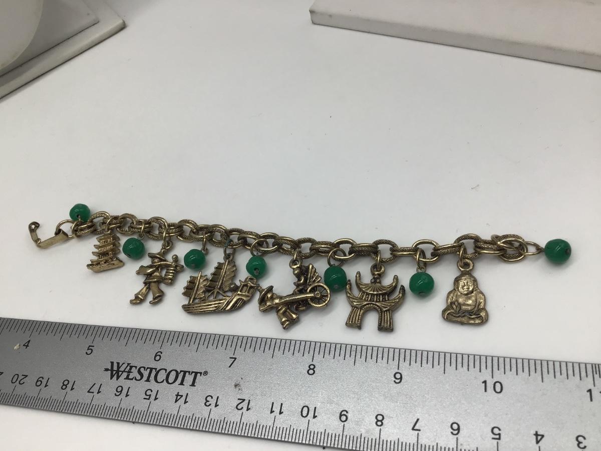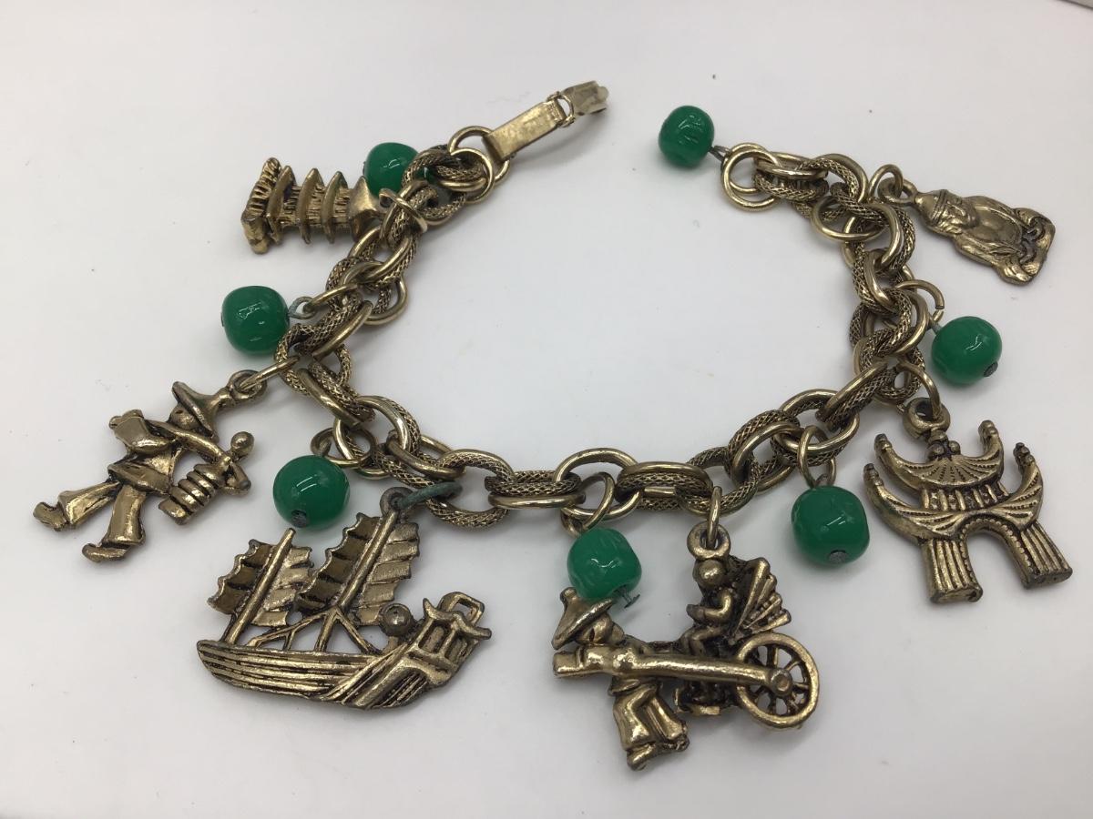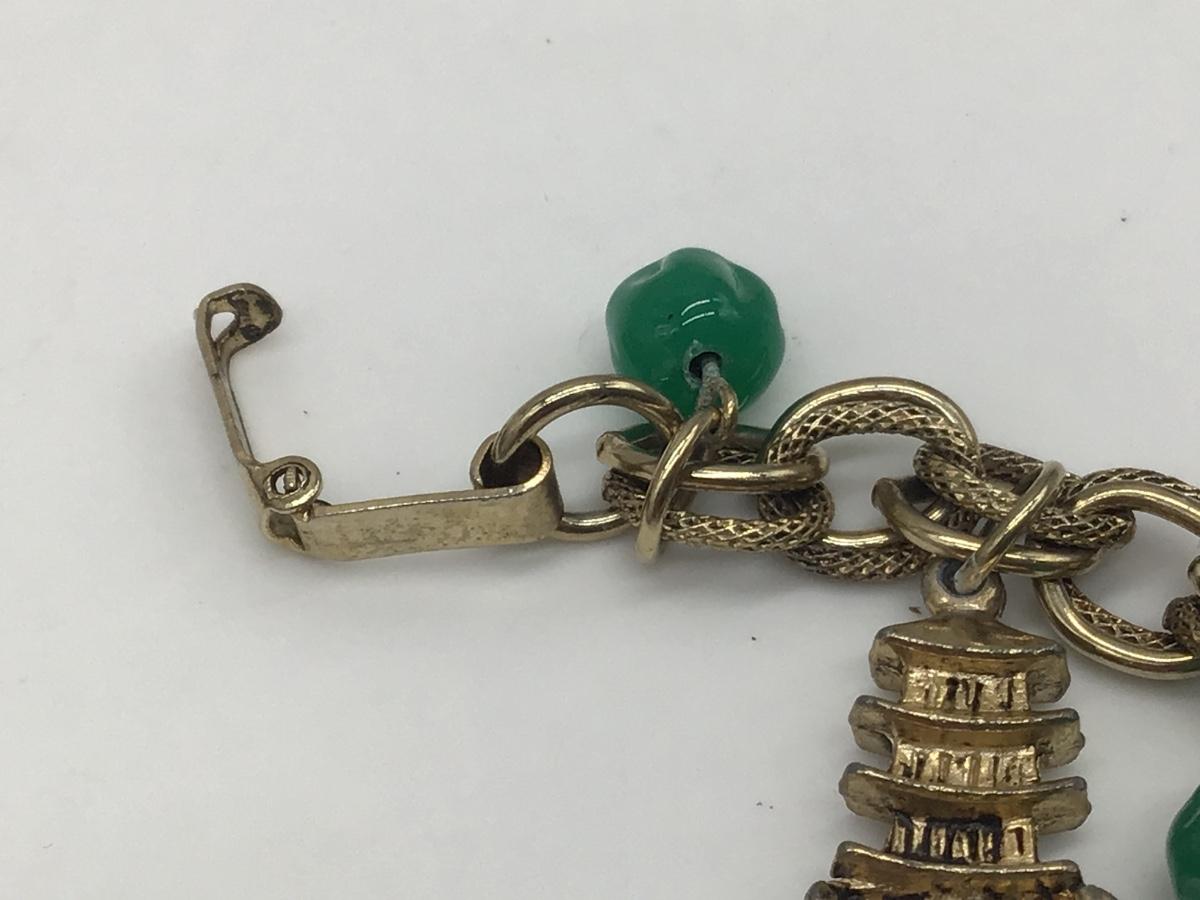 Vintage Charm Bracelet Gold Tone Link Asian Green Glass Beads