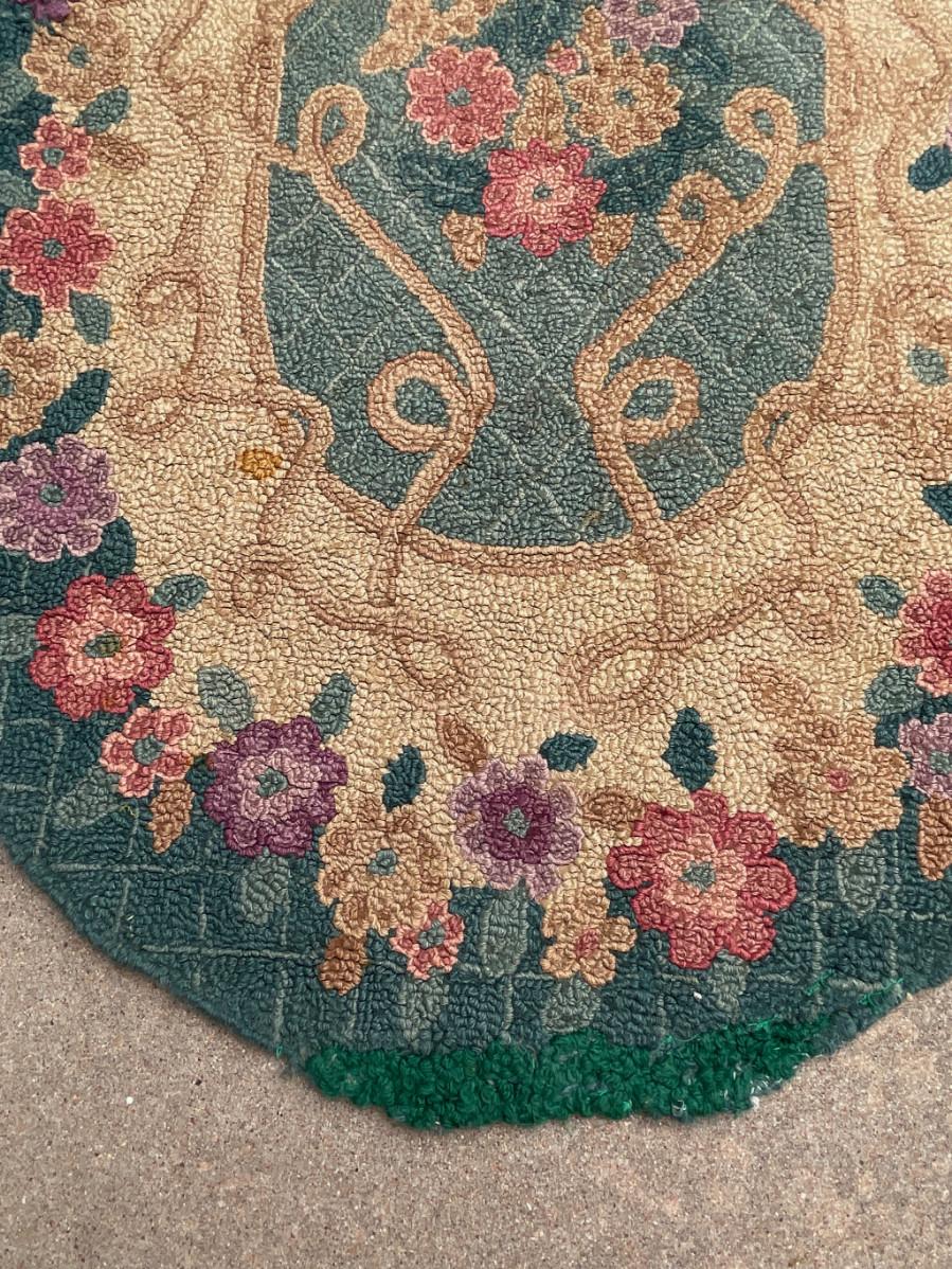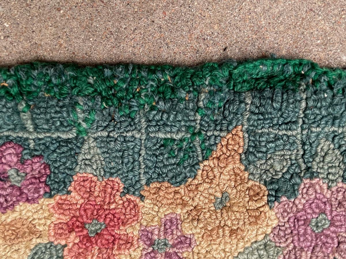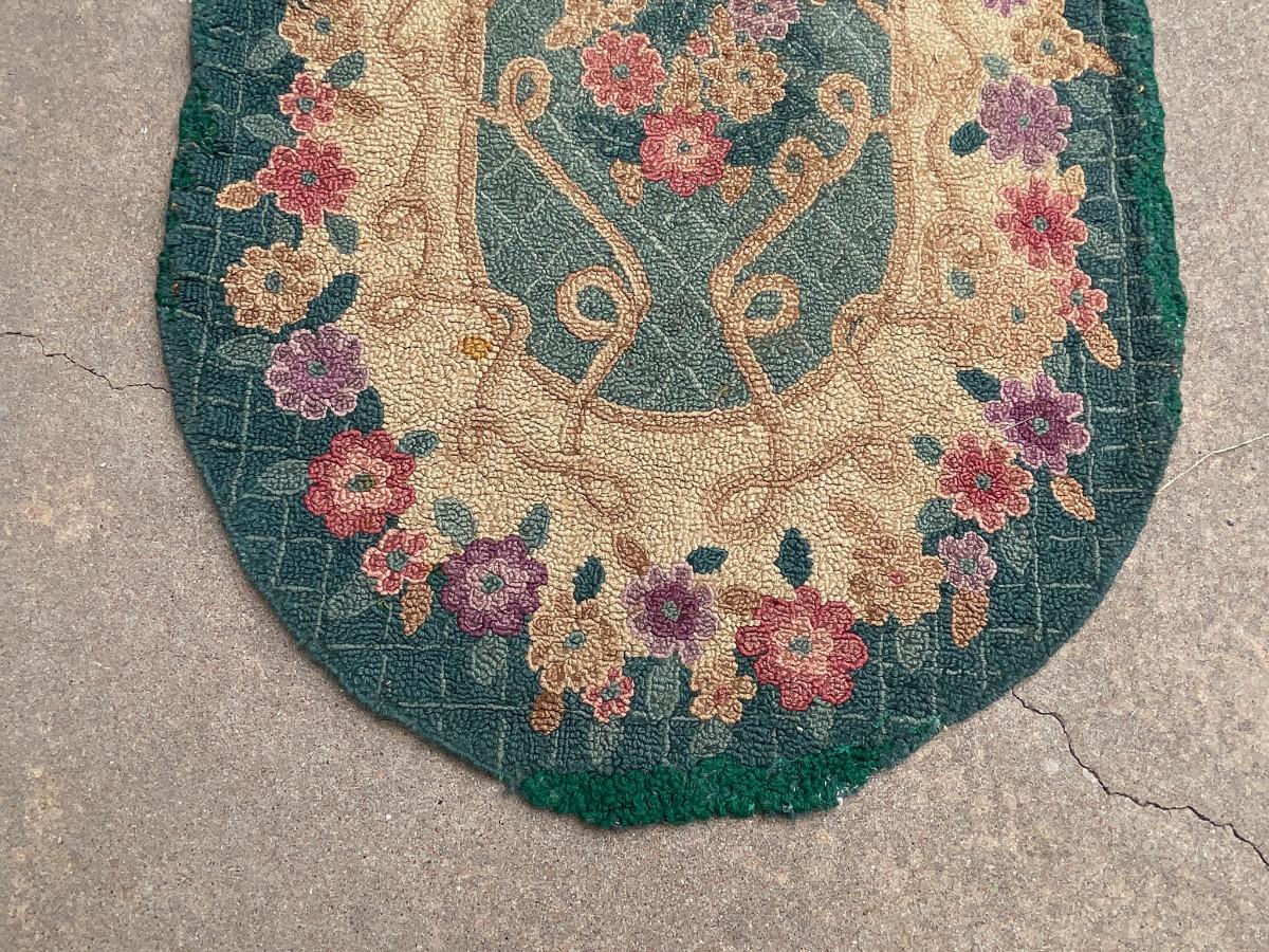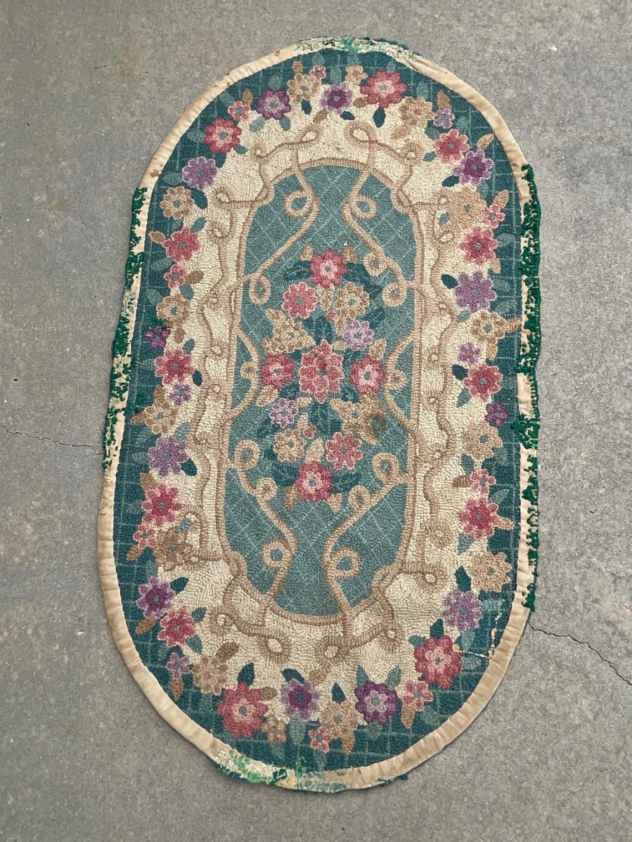 DESCRIPTION: The subject item is a vintage, oval, flower garden patterned hook rug detailed with a meandering rope pattern framing and woven into a central floral bouquet framed in a floral border. The time-muted colors of this rug are sure to pleasantly dress a cozy cabin corner.