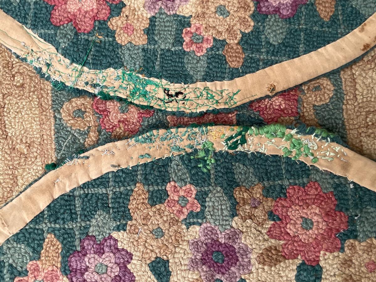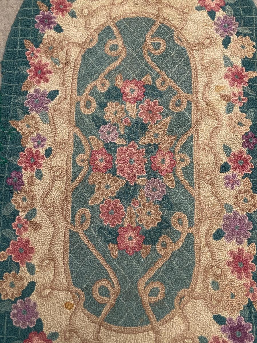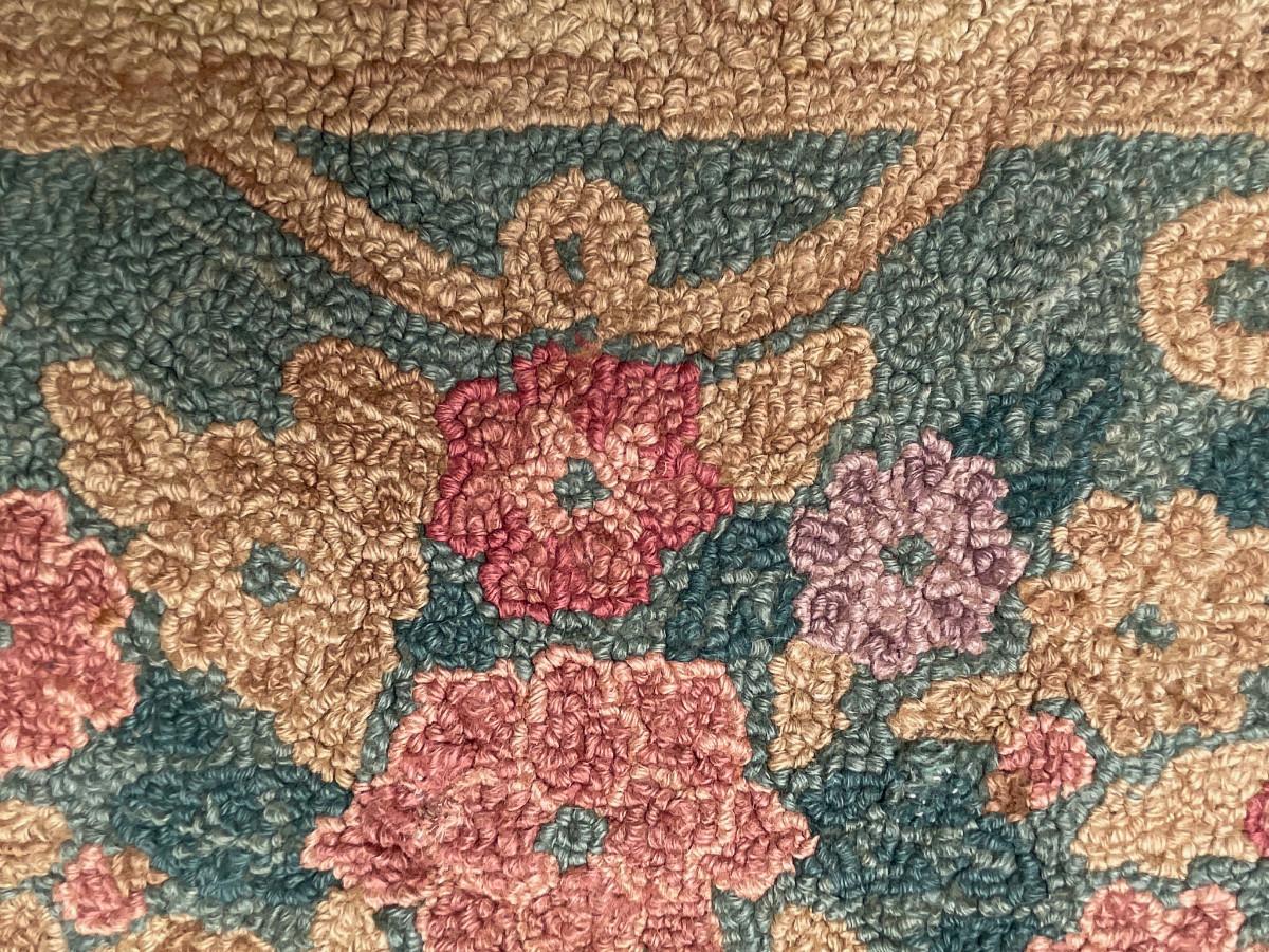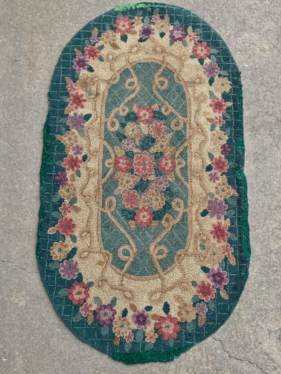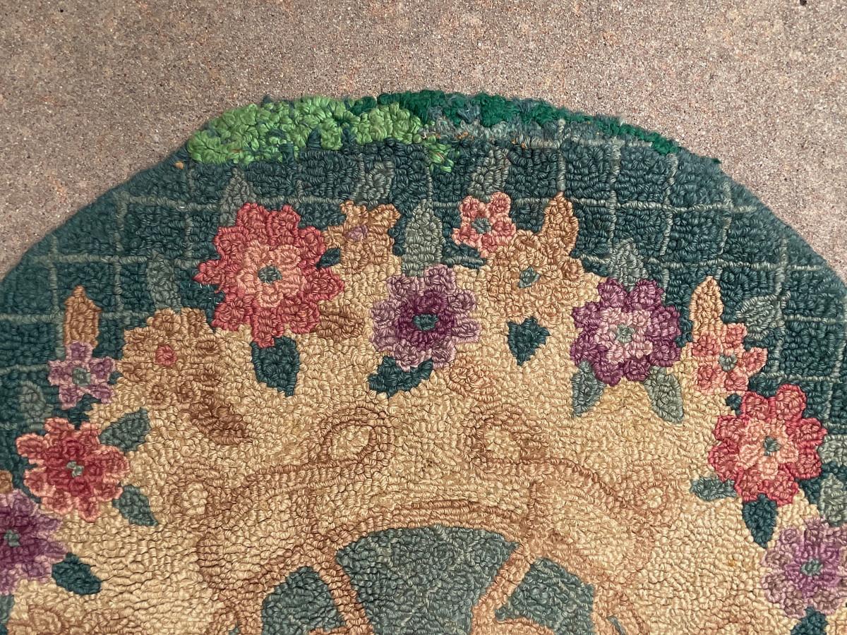 DESCRIPTION: The subject item is a vintage, oval, flower garden patterned hook rug detailed with a meandering rope pattern framing and woven into a central floral bouquet framed in a floral border. The time-muted colors of this rug are sure to pleasantly dress a cozy cabin corner.