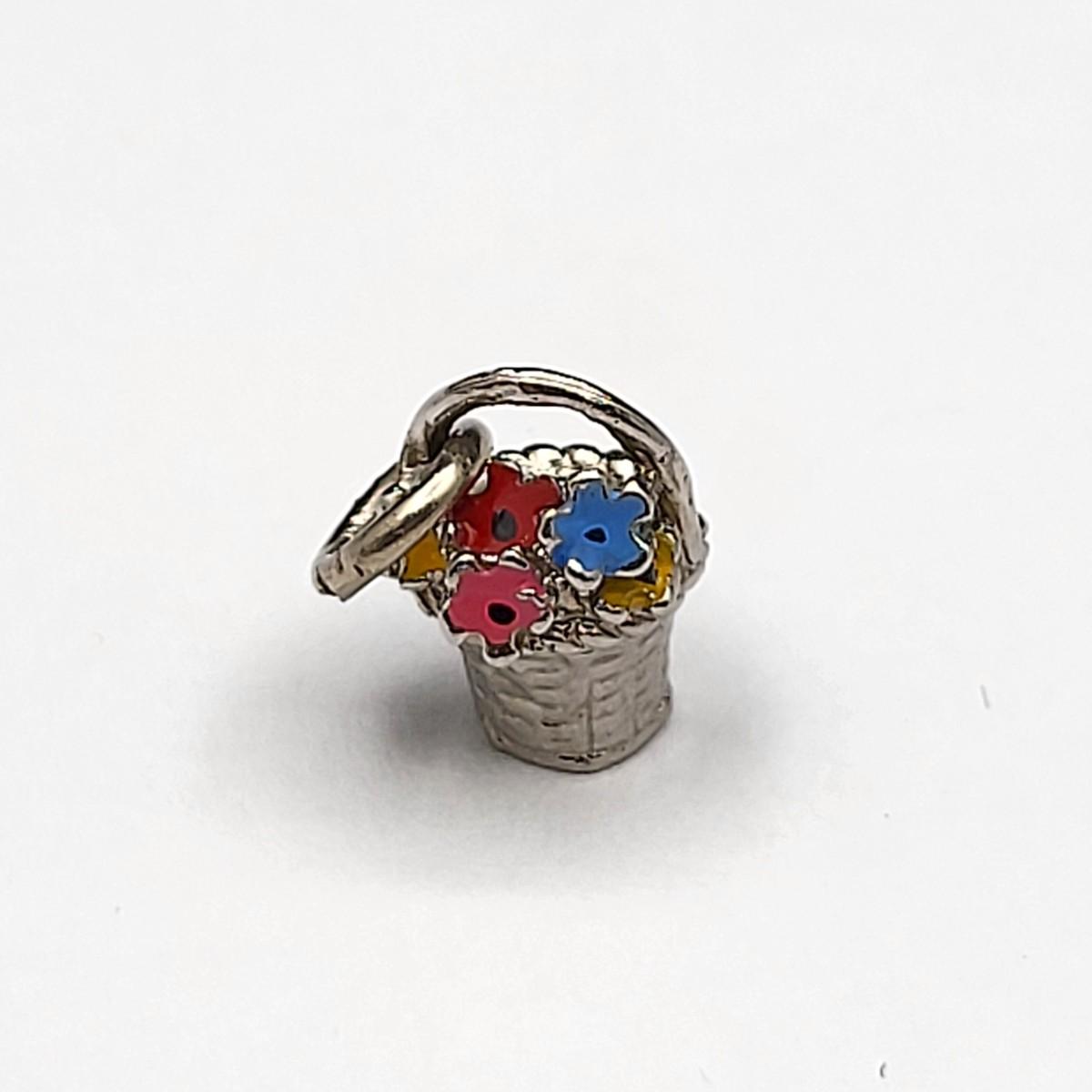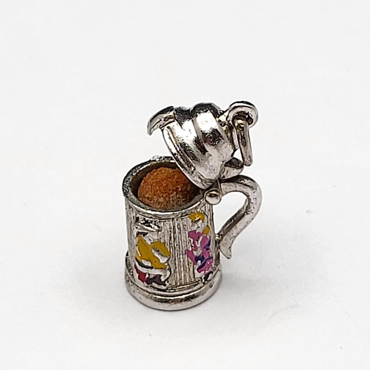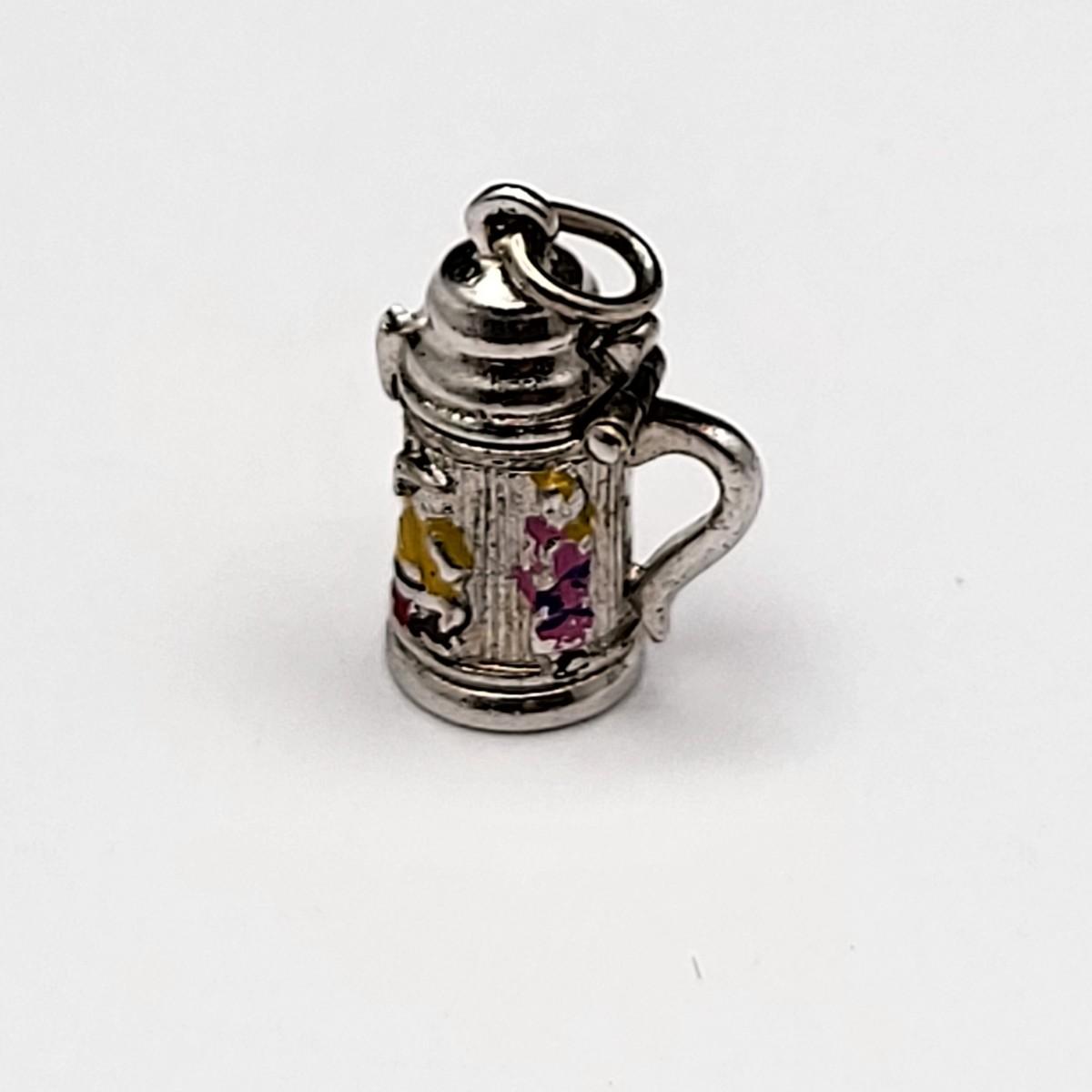 Lot of five vintage charms: Three have 925 or Sterling mark, two do not, but appear to be sterling. Cocktail still on original card, pineapple, windmill, enameled flowers in basket, enameled beer stein.
