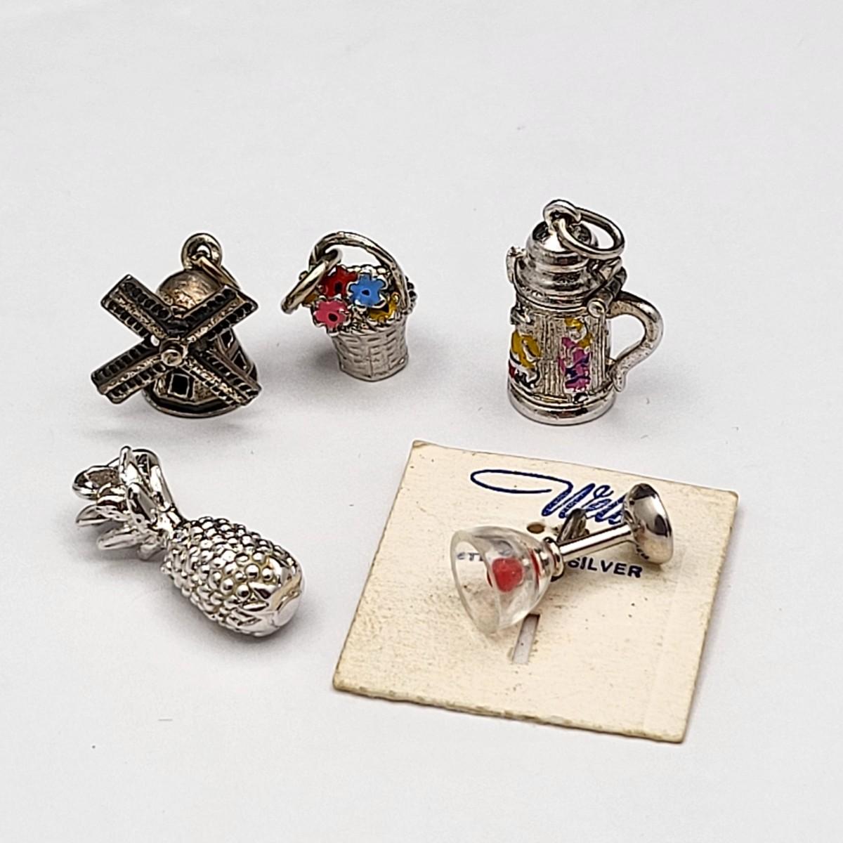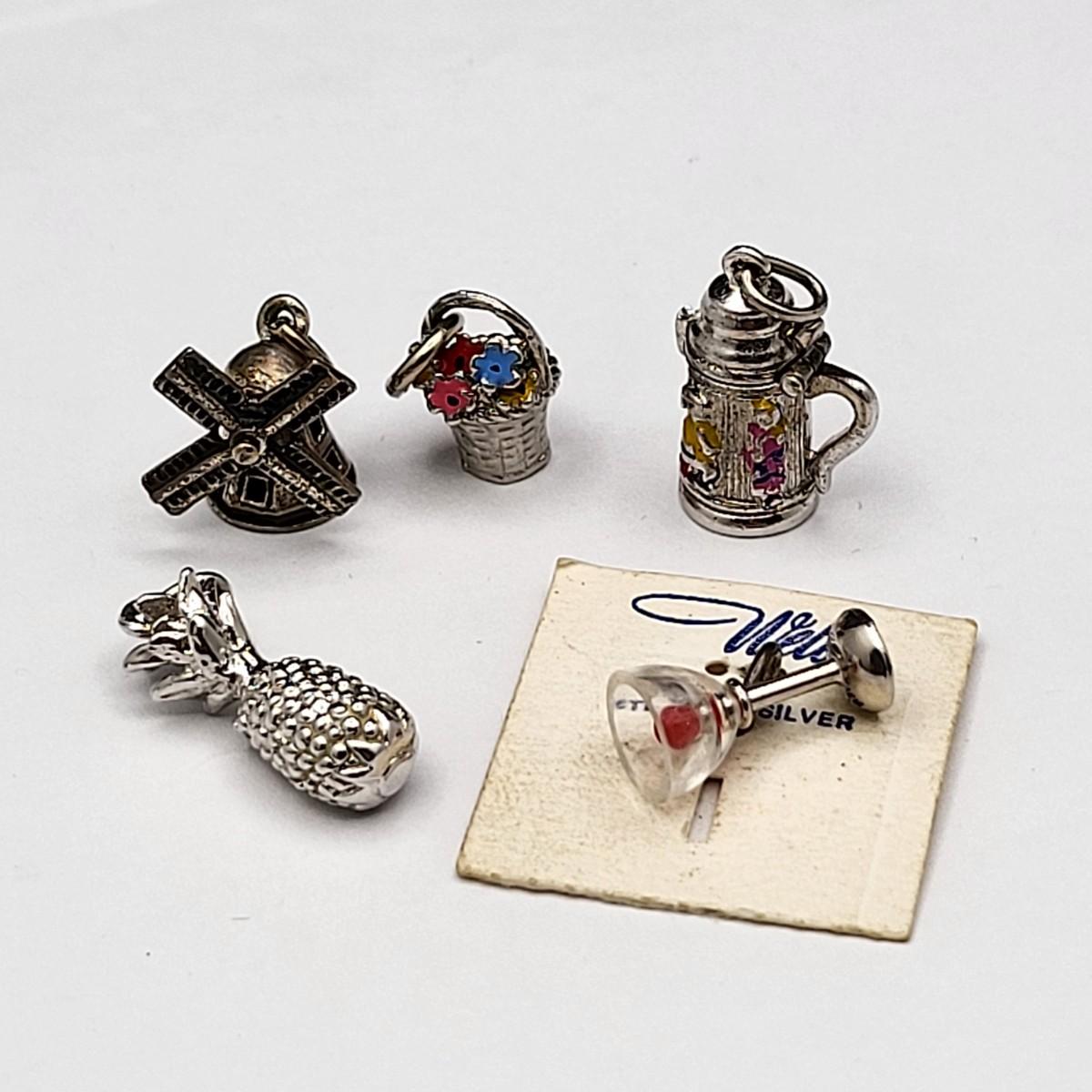 Lot of five vintage charms: Three have 925 or Sterling mark, two do not, but appear to be sterling. Cocktail still on original card, pineapple, windmill, enameled flowers in basket, enameled beer stein.