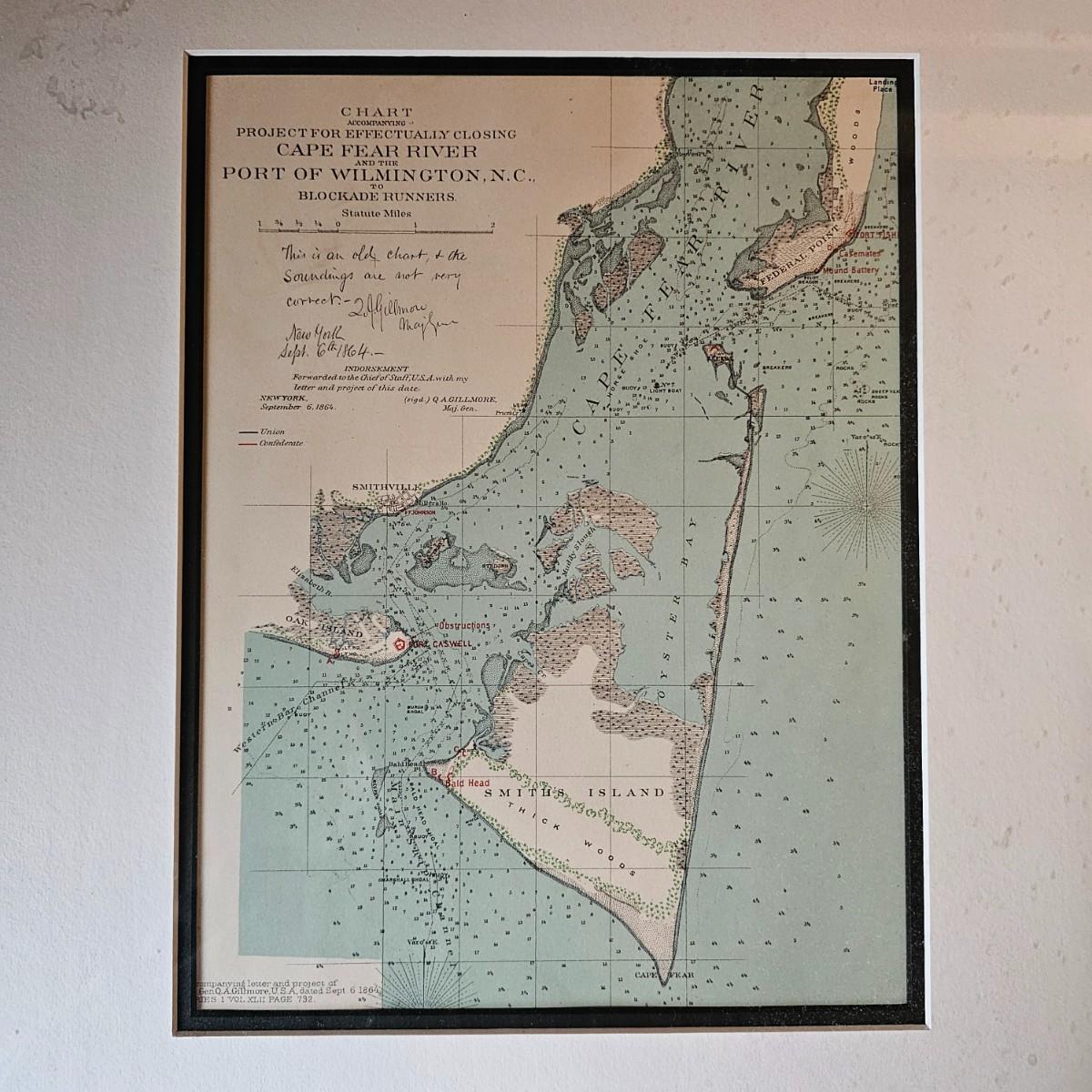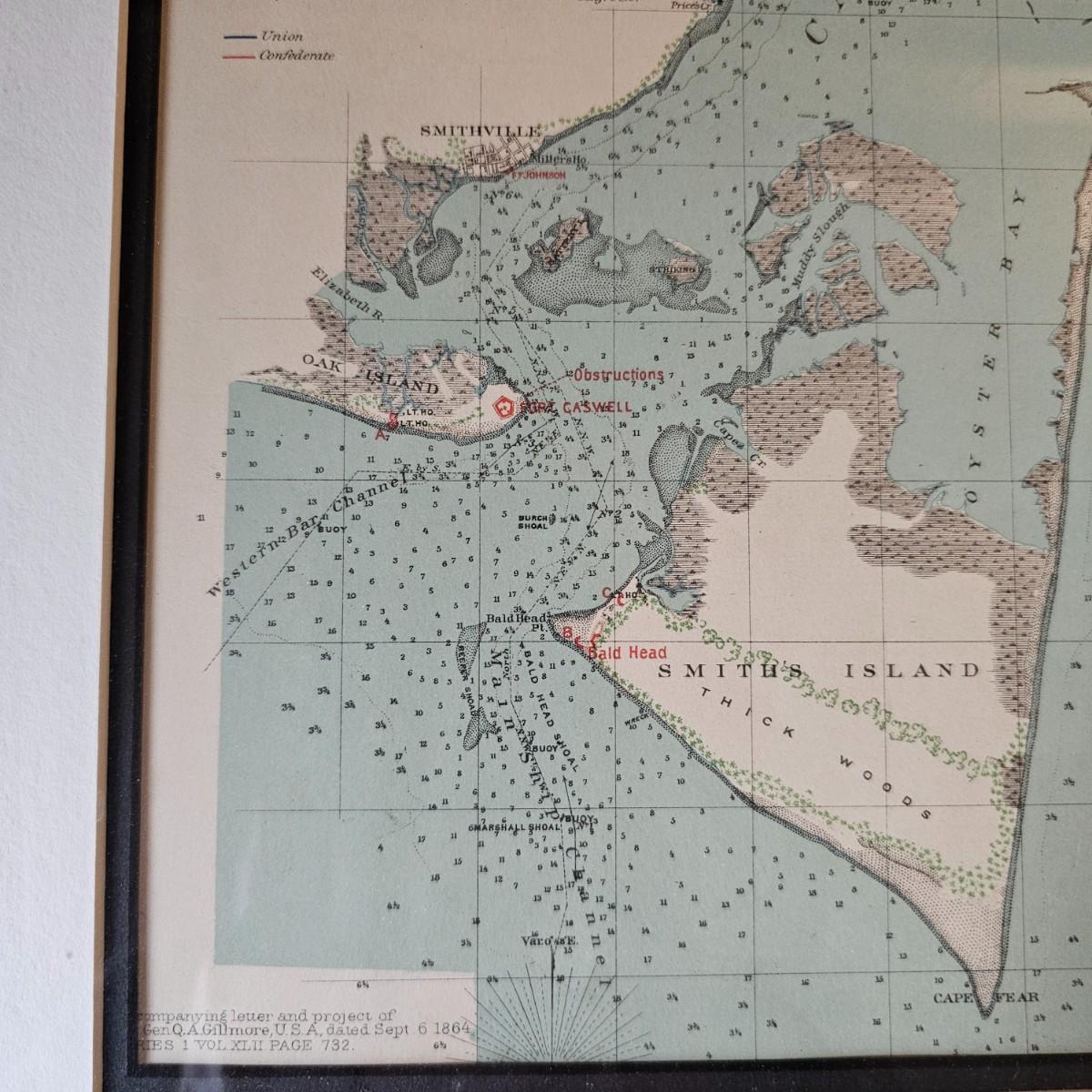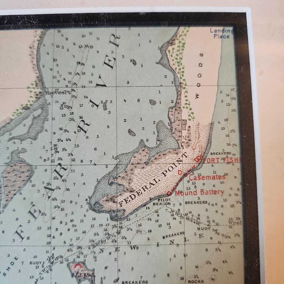 Naval chart showing 1895 Cape Fear River area with markings for blockading the river and the port of Wilmington N.C. A project for the Civil War effort showing Union and Confederate positions and strongholds. Chart is matted and framed, measures 18.5" x 22.5"H, has some blemishes on mat. A certificate from the issuing company is provided on the back. See photos for details. Shipping available. Shipping can be costly. We suggest contacting our preferred local shipping provider, Postage Express, with dimensions and getting an estimate before bidding: (828) 255-9250 or shipping@postageexpressnc.com.