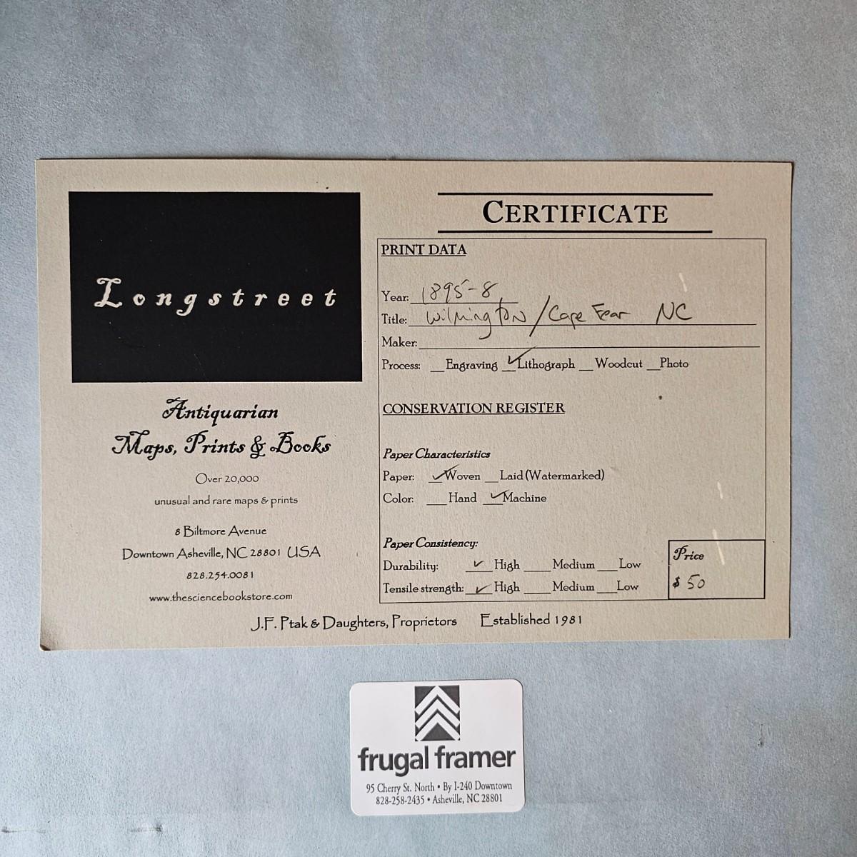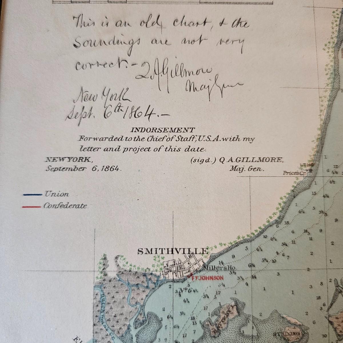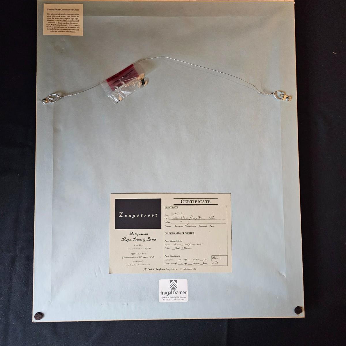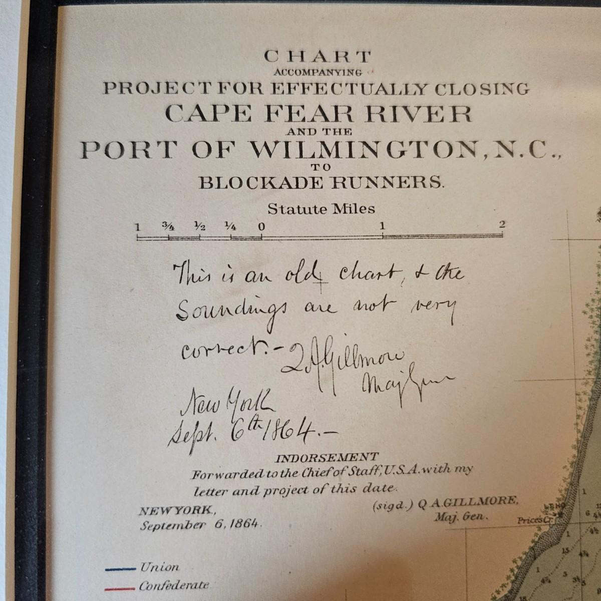 Naval chart showing 1895 Cape Fear River area with markings for blockading the river and the port of Wilmington N.C. A project for the Civil War effort showing Union and Confederate positions and strongholds. Chart is matted and framed, measures 18.5" x 22.5"H, has some blemishes on mat. A certificate from the issuing company is provided on the back. See photos for details. Shipping available. Shipping can be costly. We suggest contacting our preferred local shipping provider, Postage Express, with dimensions and getting an estimate before bidding: (828) 255-9250 or shipping@postageexpressnc.com.