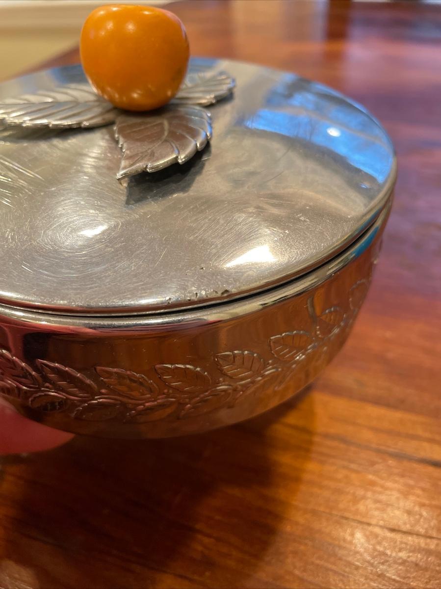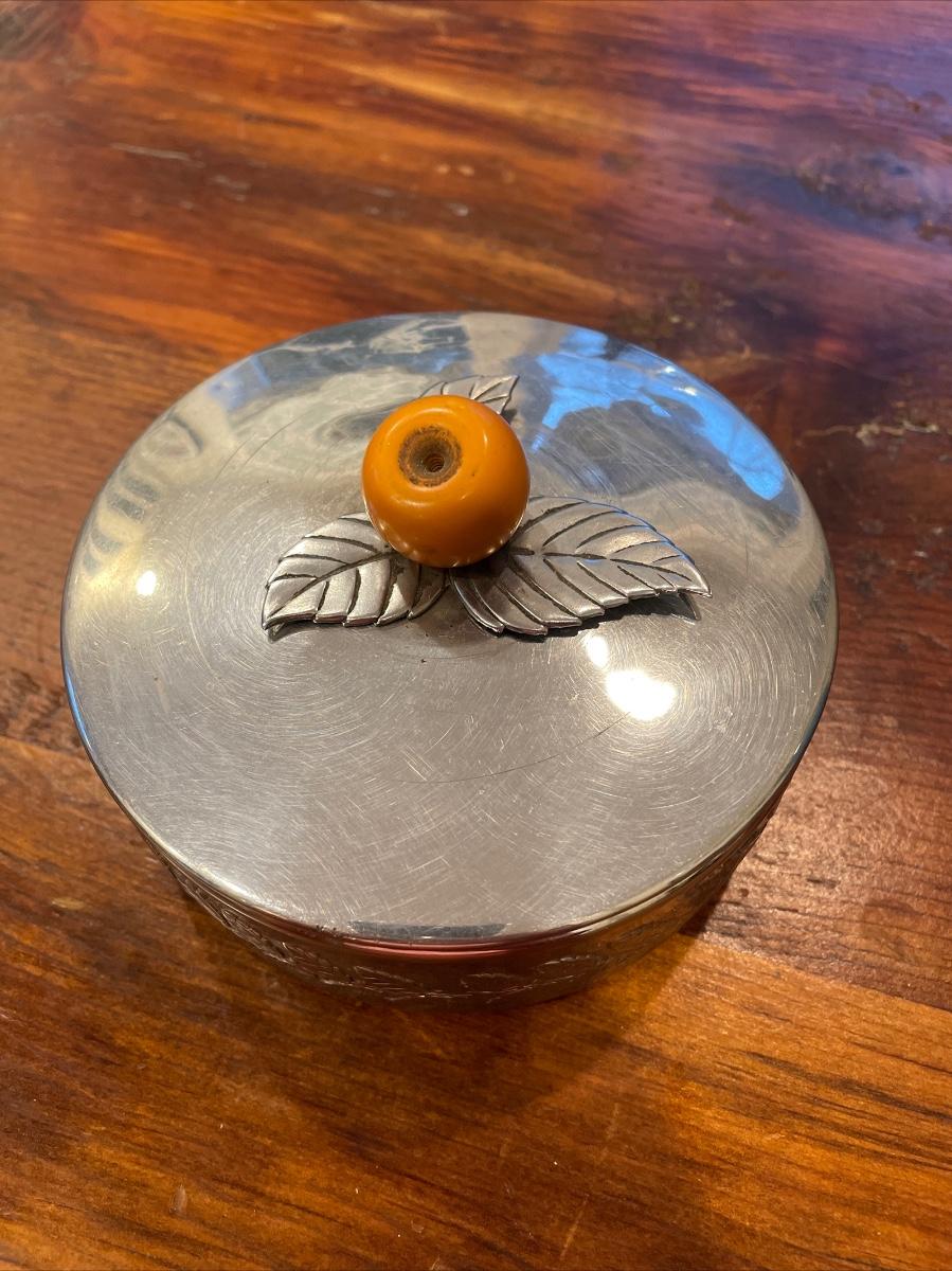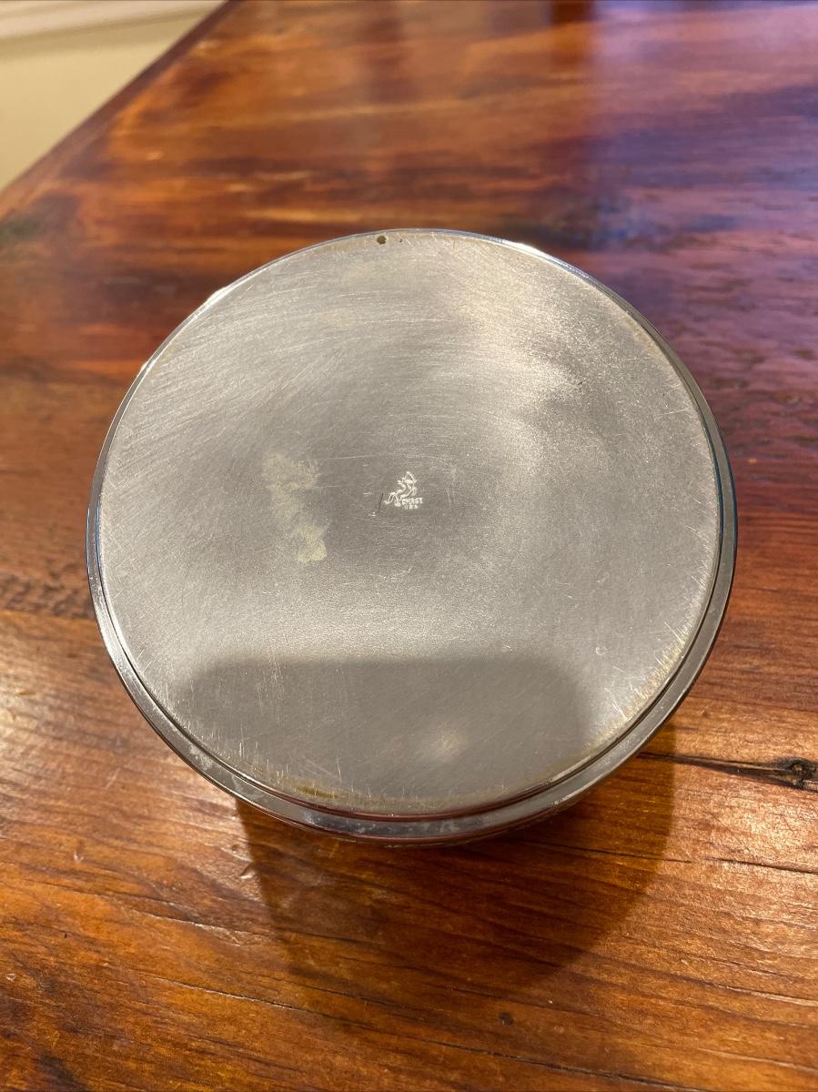 Vintage powder jar with what appears to be a bakelite handle, this is not guaranteed. It does have scratching and a few small dents which I have shown.