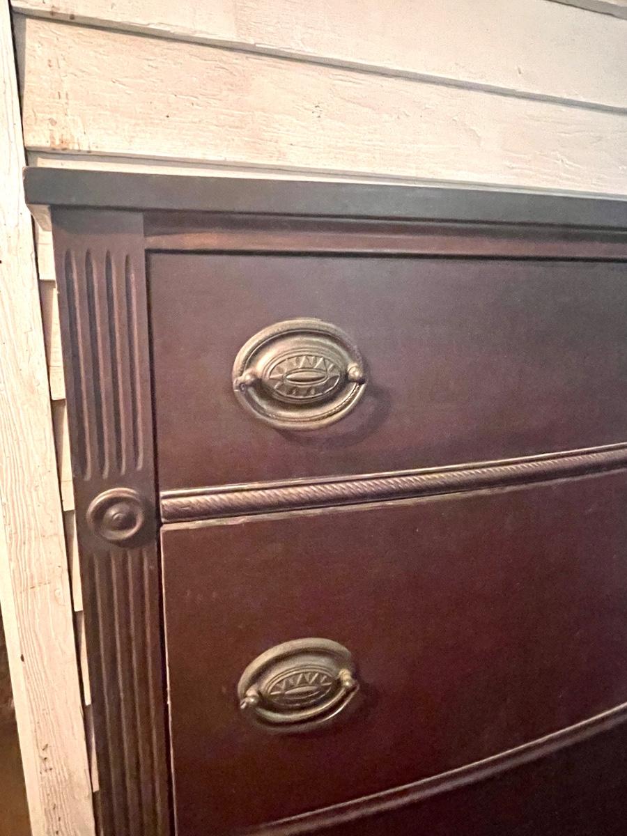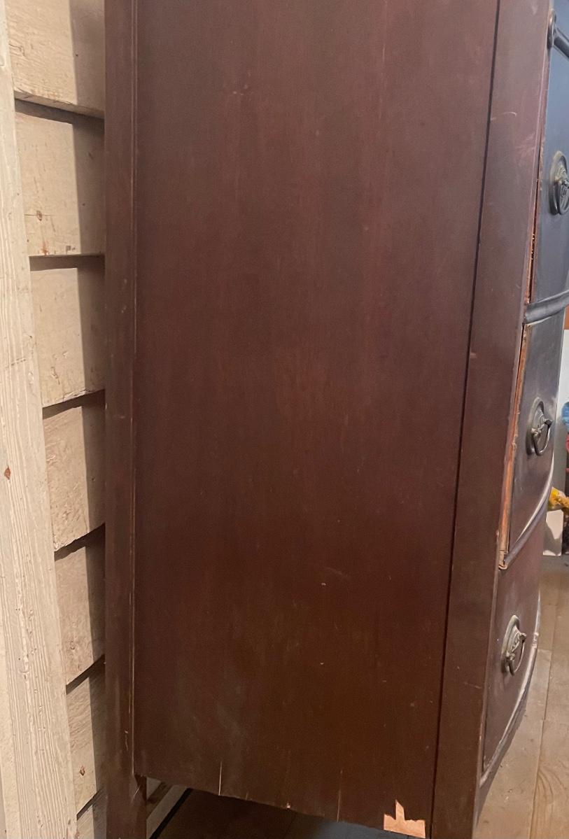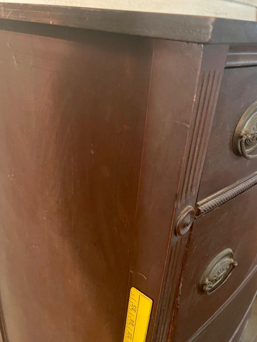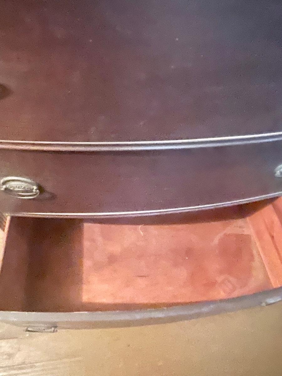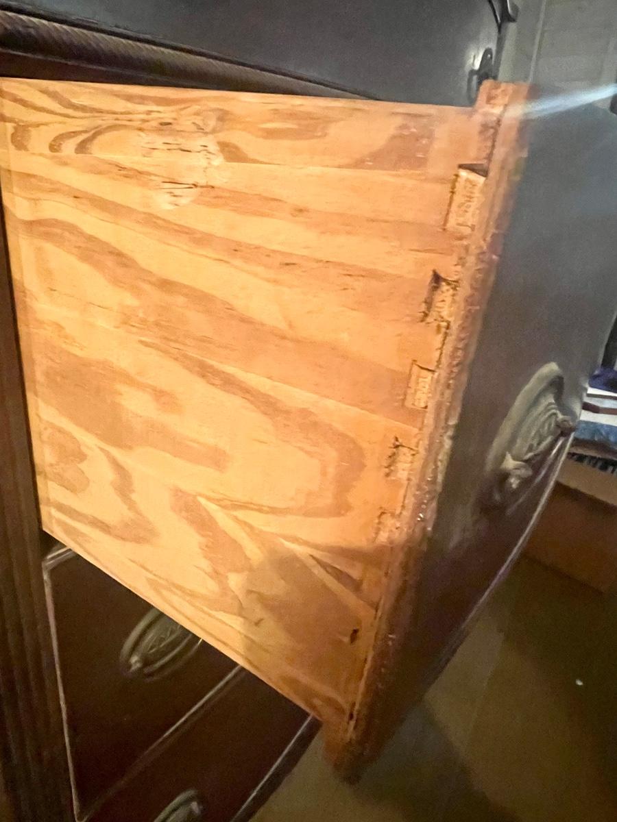 Good project piece. Nice hardware. Some veneer separation on bottom and on some drawer faces, but great bones!