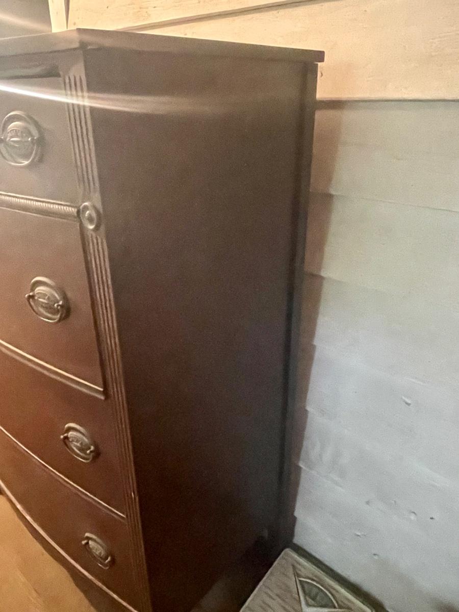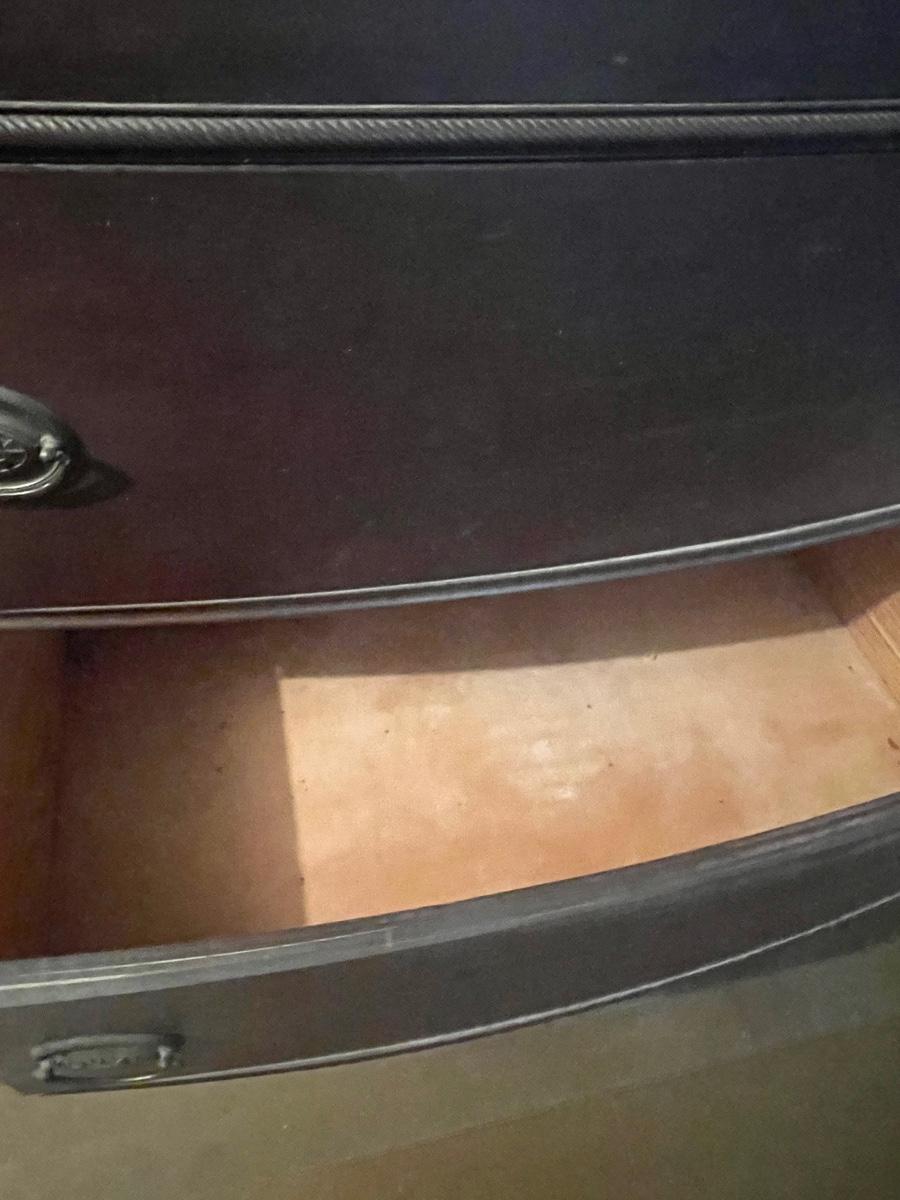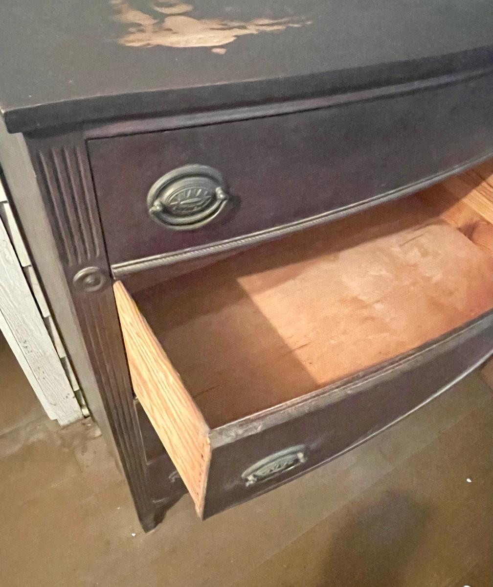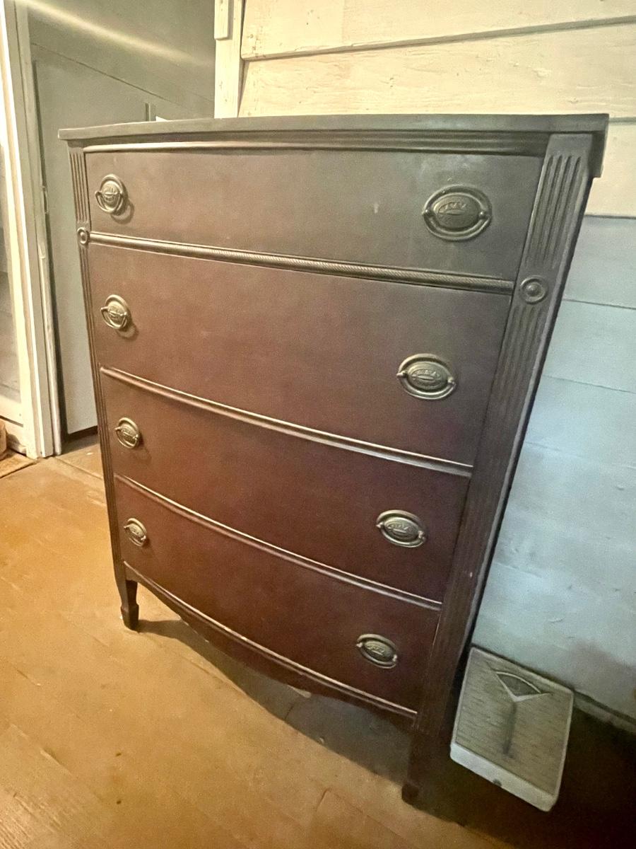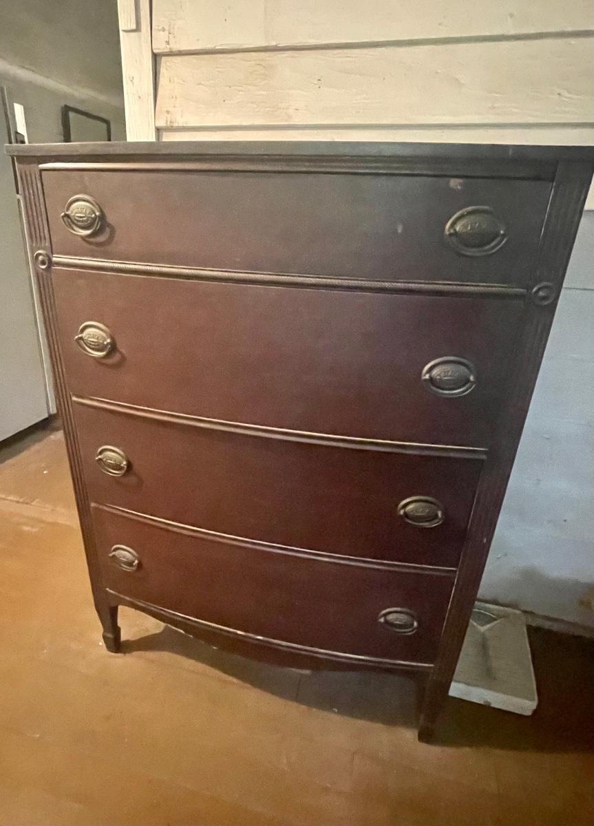 Good project piece. Nice hardware. Some veneer separation on bottom and on some drawer faces, but great bones!
