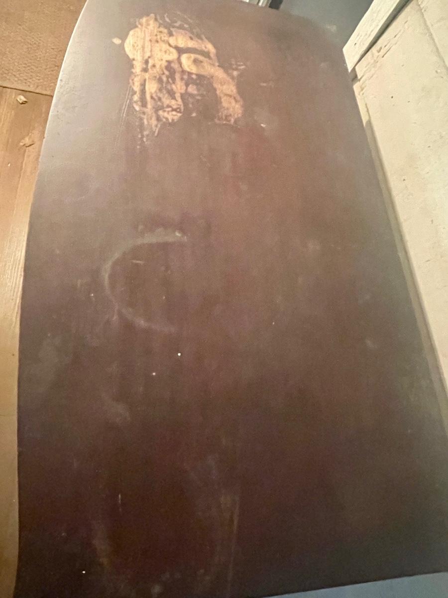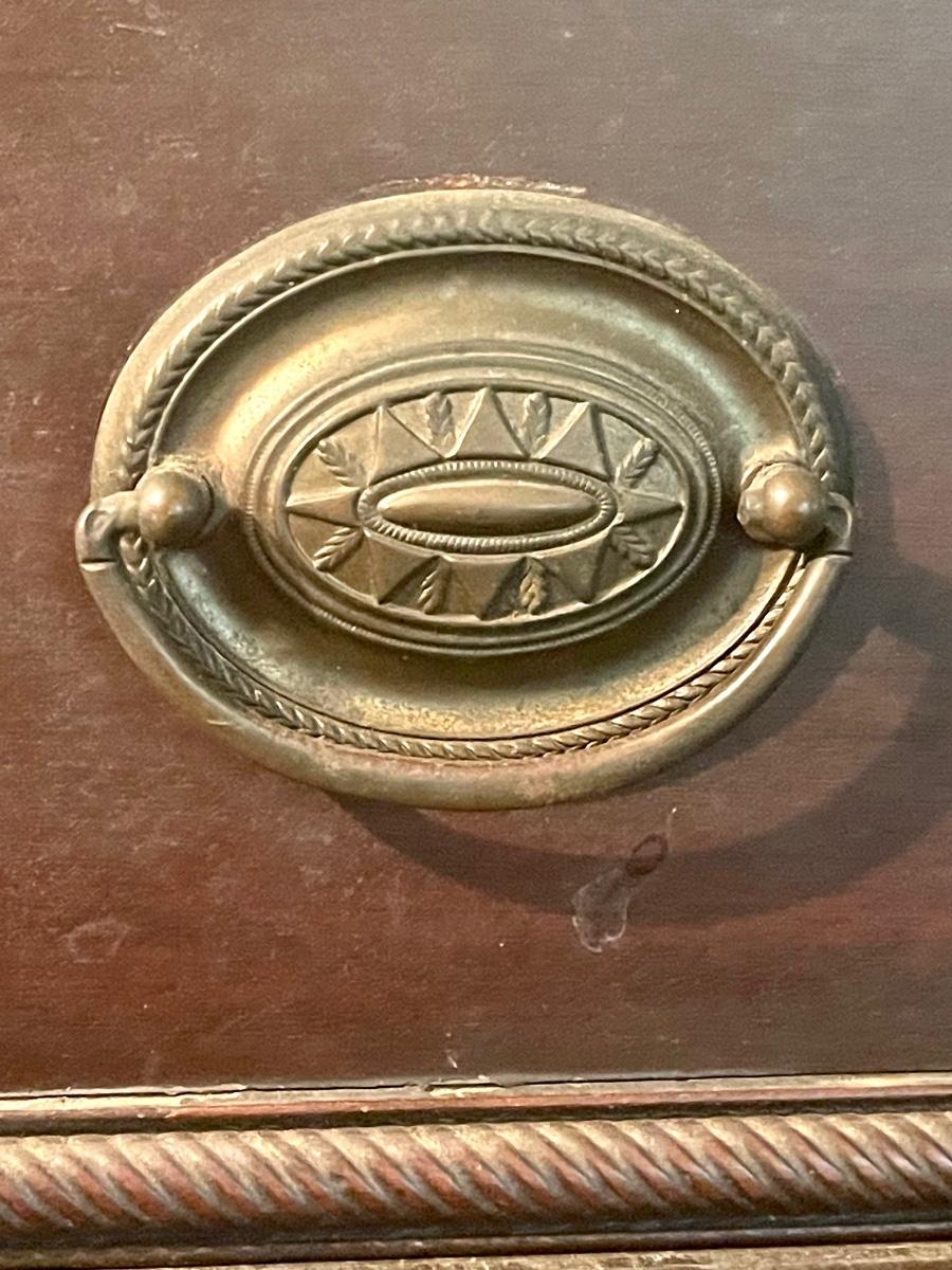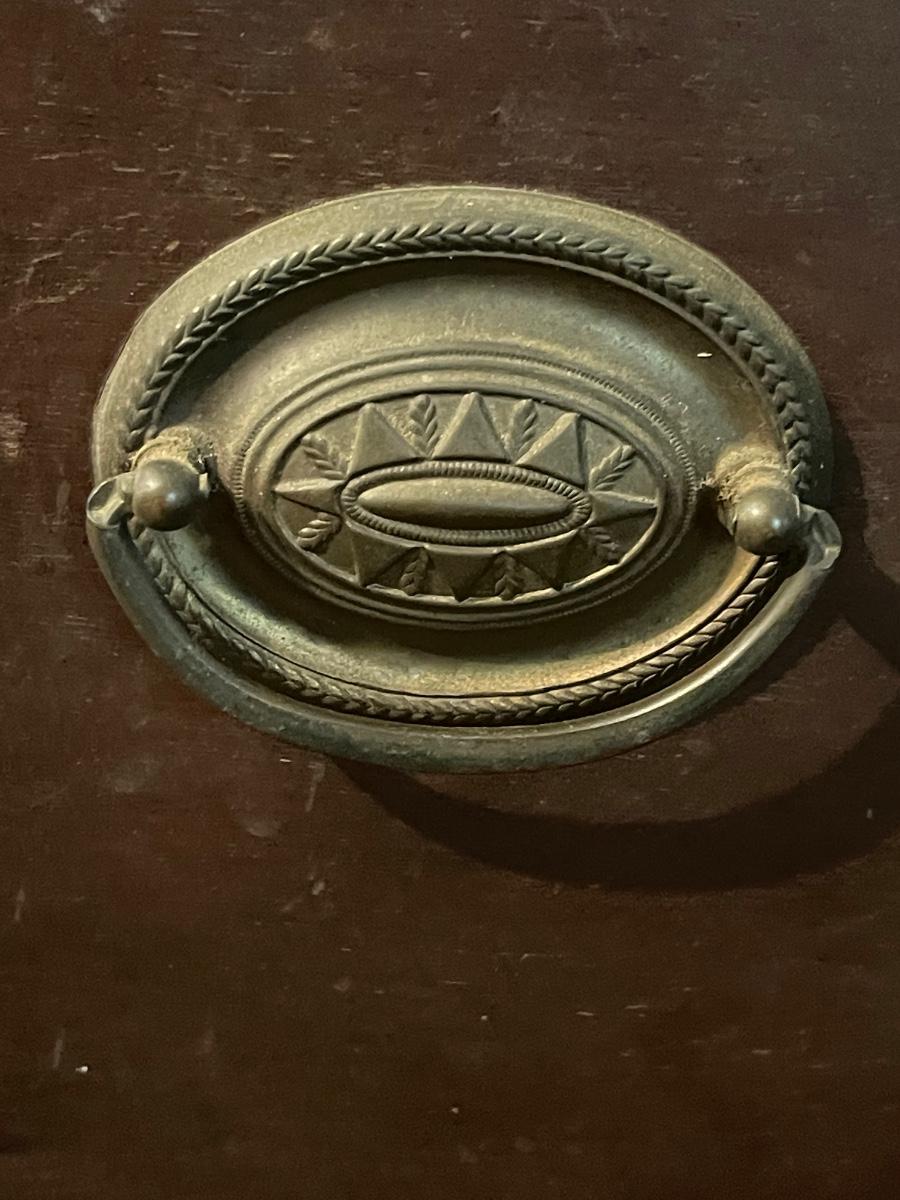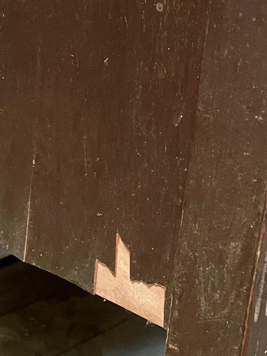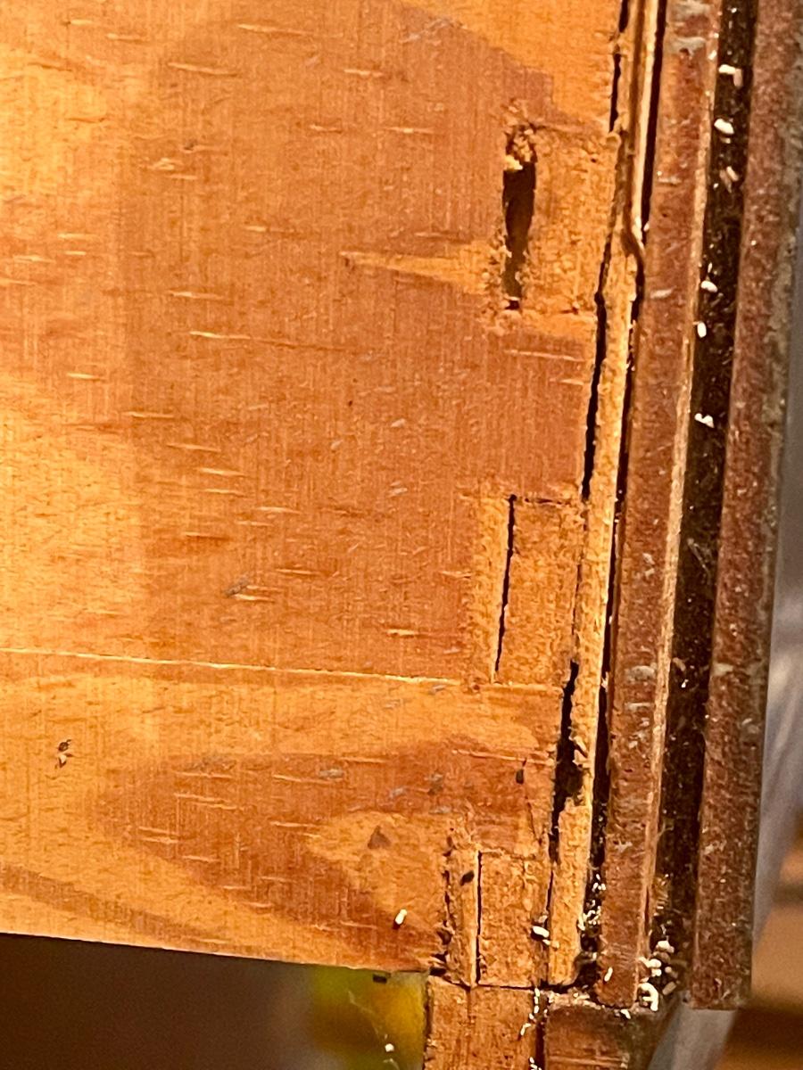 Good project piece. Nice hardware. Some veneer separation on bottom and on some drawer faces, but great bones!