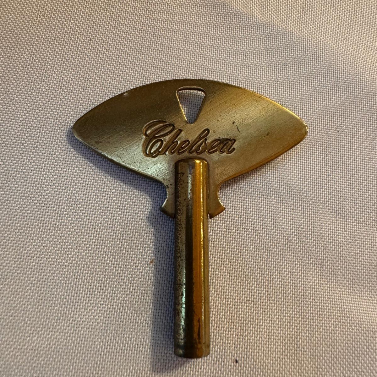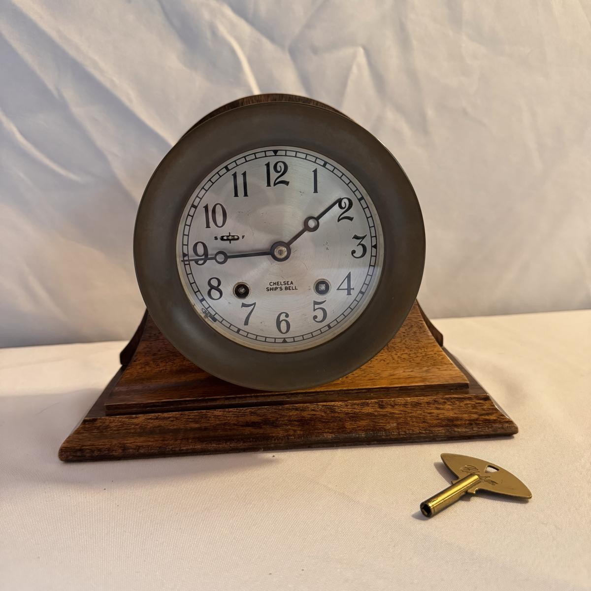This lot includes one vintage Chelsea Ship’s Bell Clock. The clock comes with a Chelsea Key that can be inserted once the face of the clock is removed. The clock is wooden with brass features. It measures 9.5” x 4” x 7”H. Tested and appears to keep time. Shipping available.