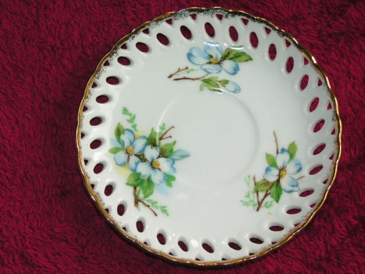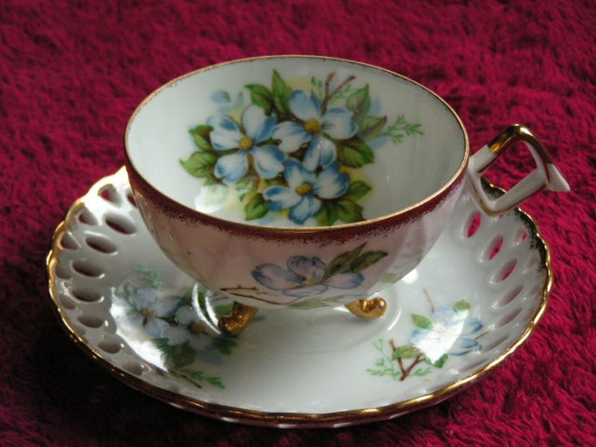 Vintage Cherry China (Japan) footed teacup & reticulated saucer, blue flowers, gold trimmed.