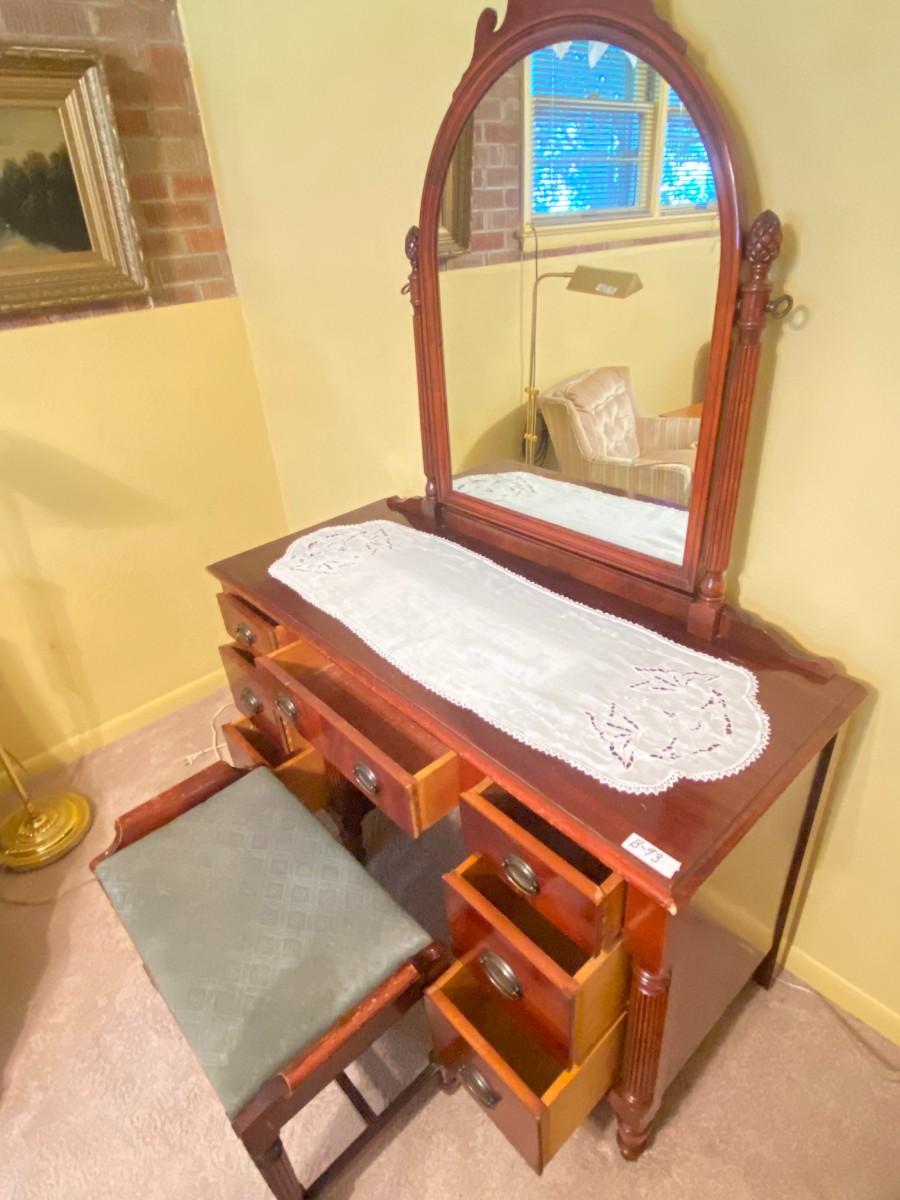 Vintage Cherry Finish Duncan Phyfe Vanity with Bench Beautiful Acorn Accent