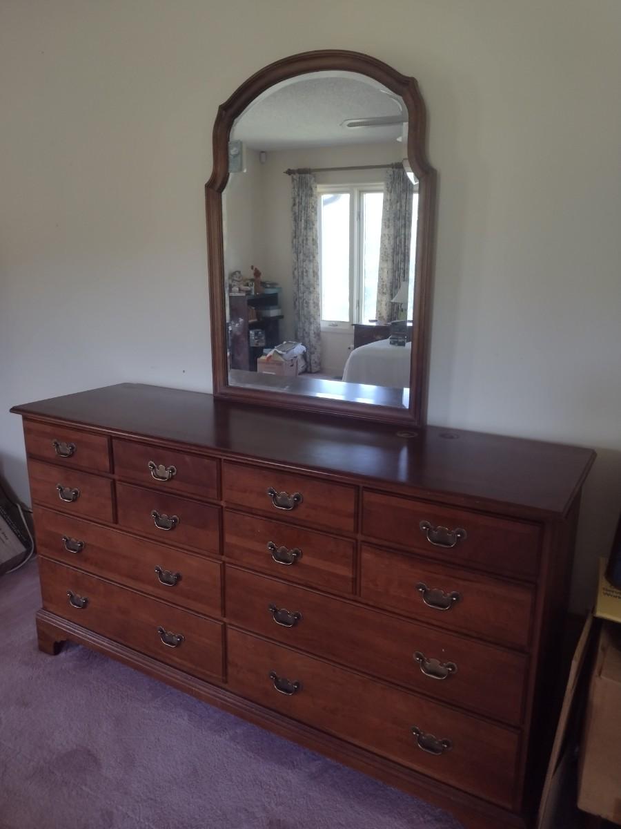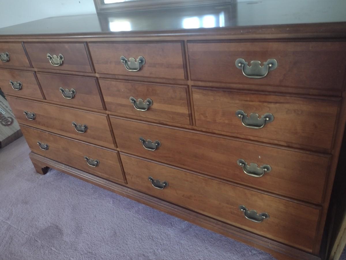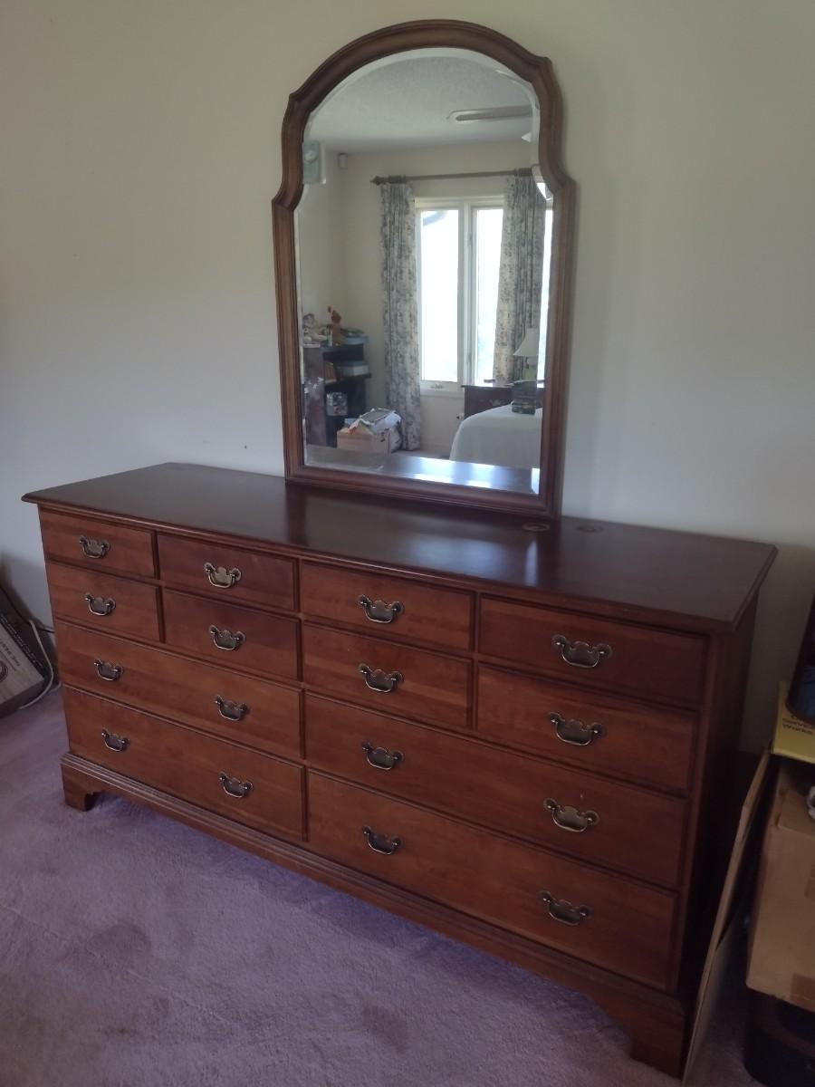 Vintage Cherry Wood Finish 12 Drawer Stretch Dresser with Mirror some wear and staining on finish as shown.