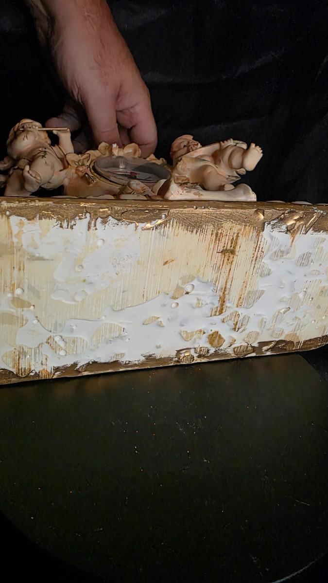 This vintage cherub mantel clock is a breathtaking embodiment of Old World artistry and romantic European charm. Cast in heavy ceramic or resin with a distressed ivory finish and accented with soft blush roses and sage-toned leaves, it draws inspiration from Rococo and Victorian design. Two cherubs rest gracefully on either side—one serenading with a flute, the other strumming a lute—framing a classic Roman numeral quartz clock trimmed in gold.