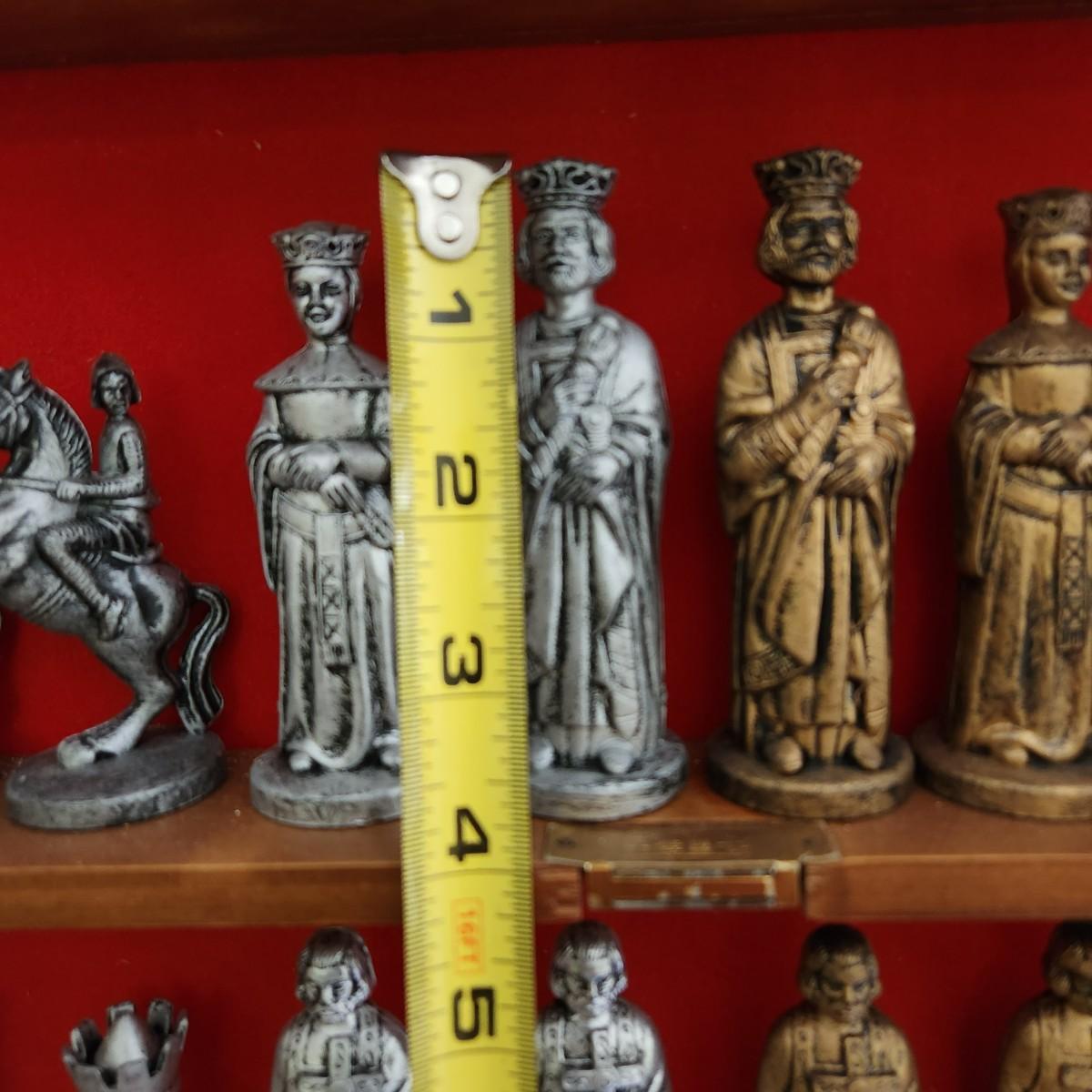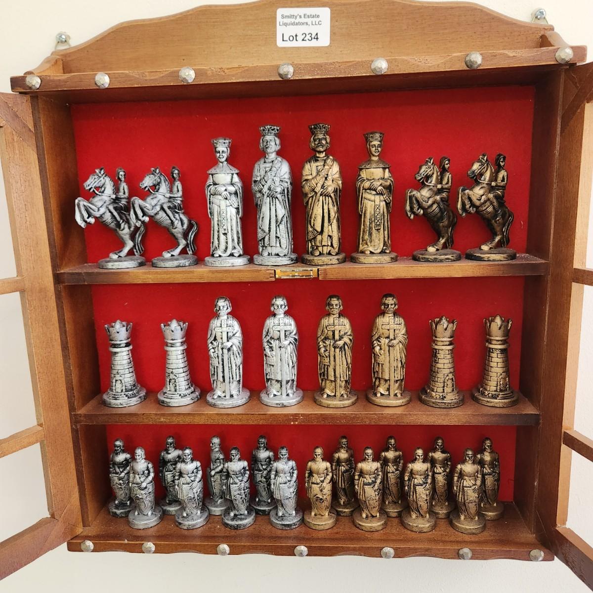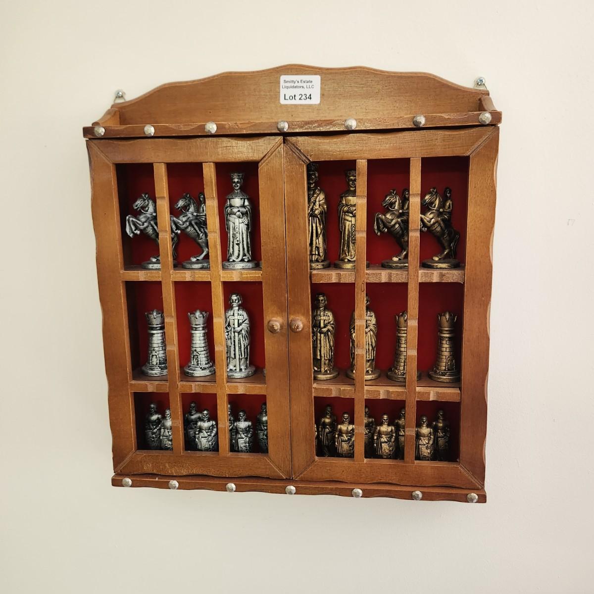 Vintage Chess Set of Plastic Chessmen in Wall Display Cabinet 4" King