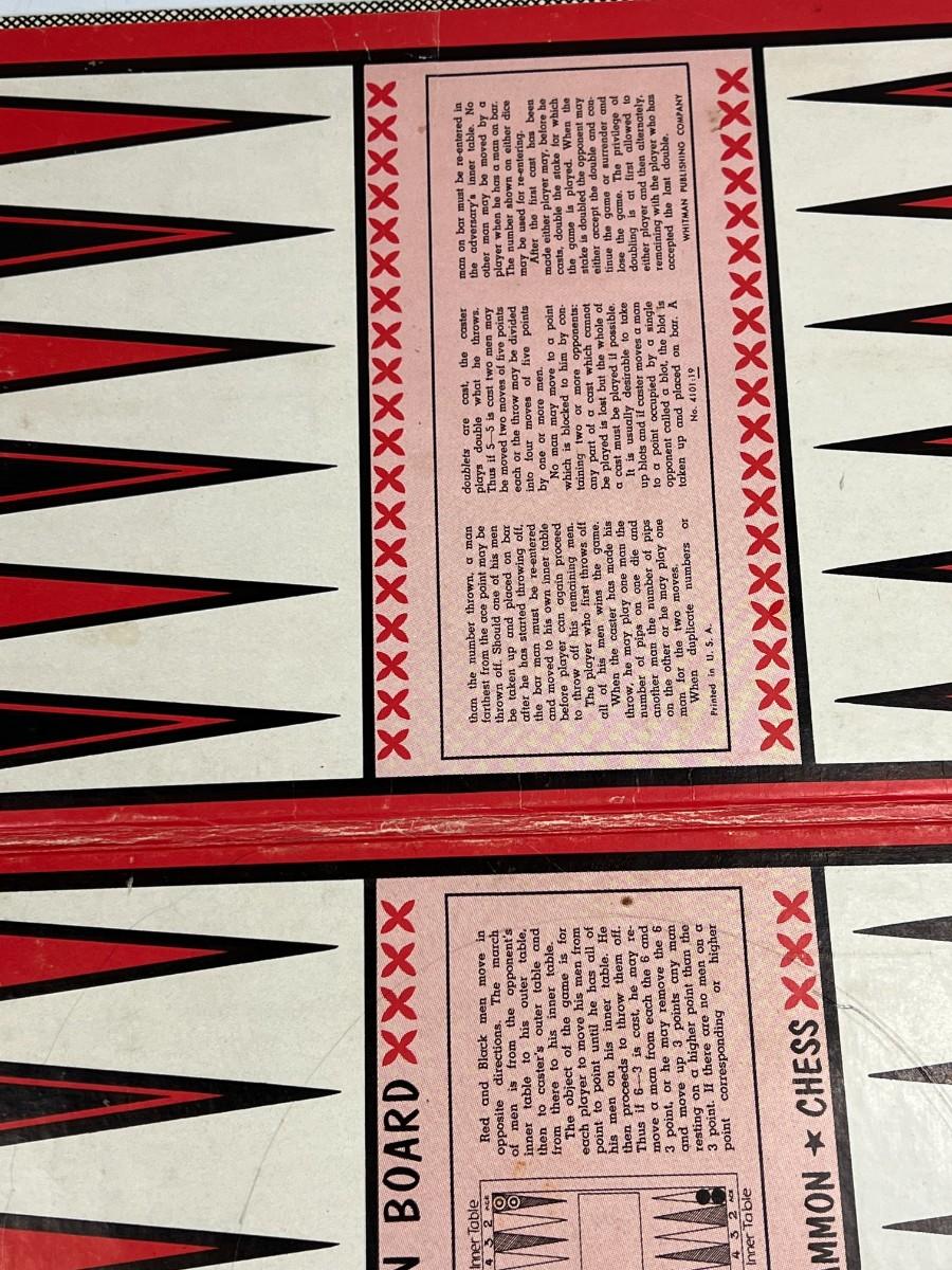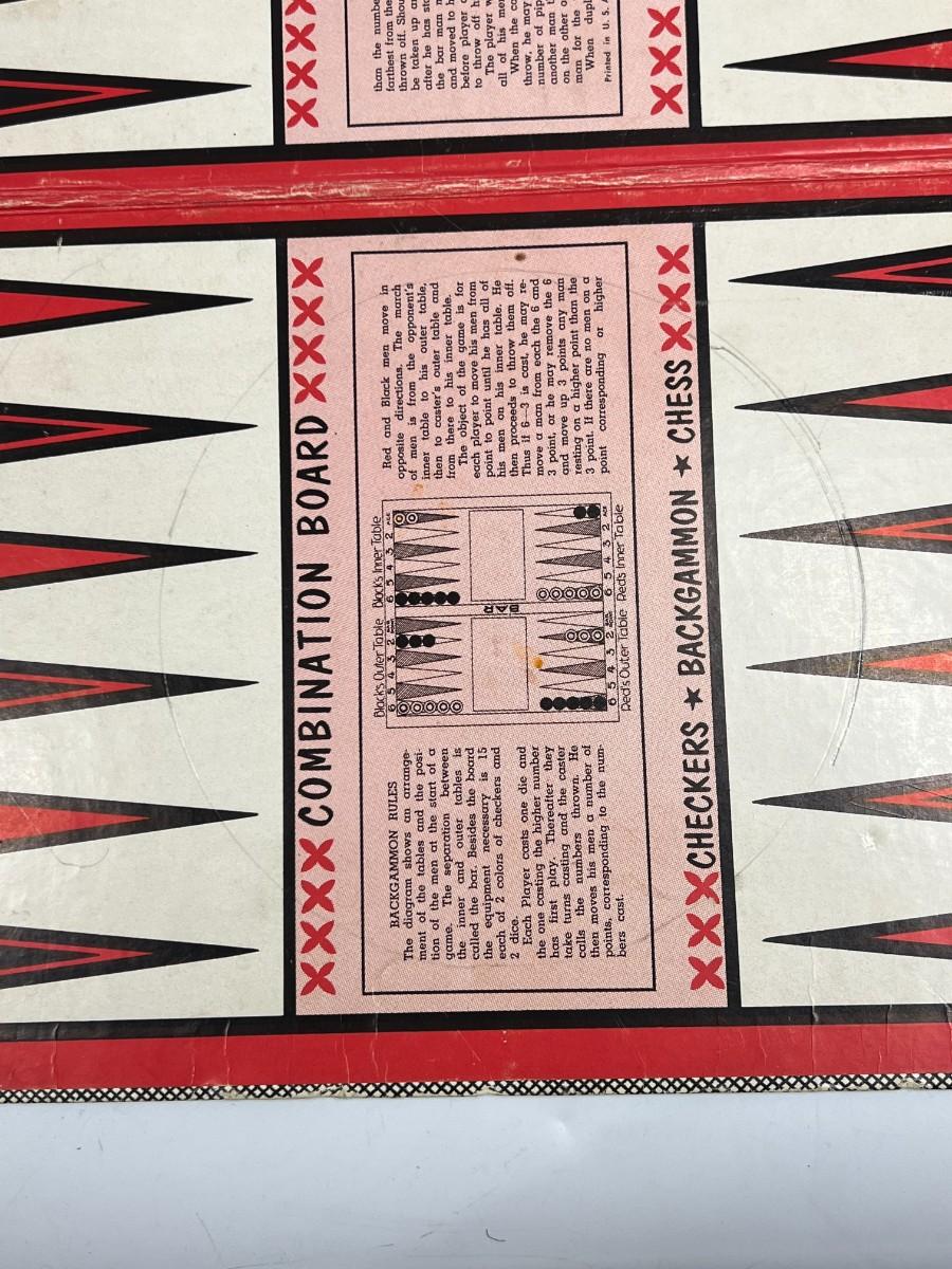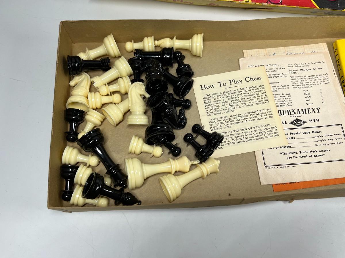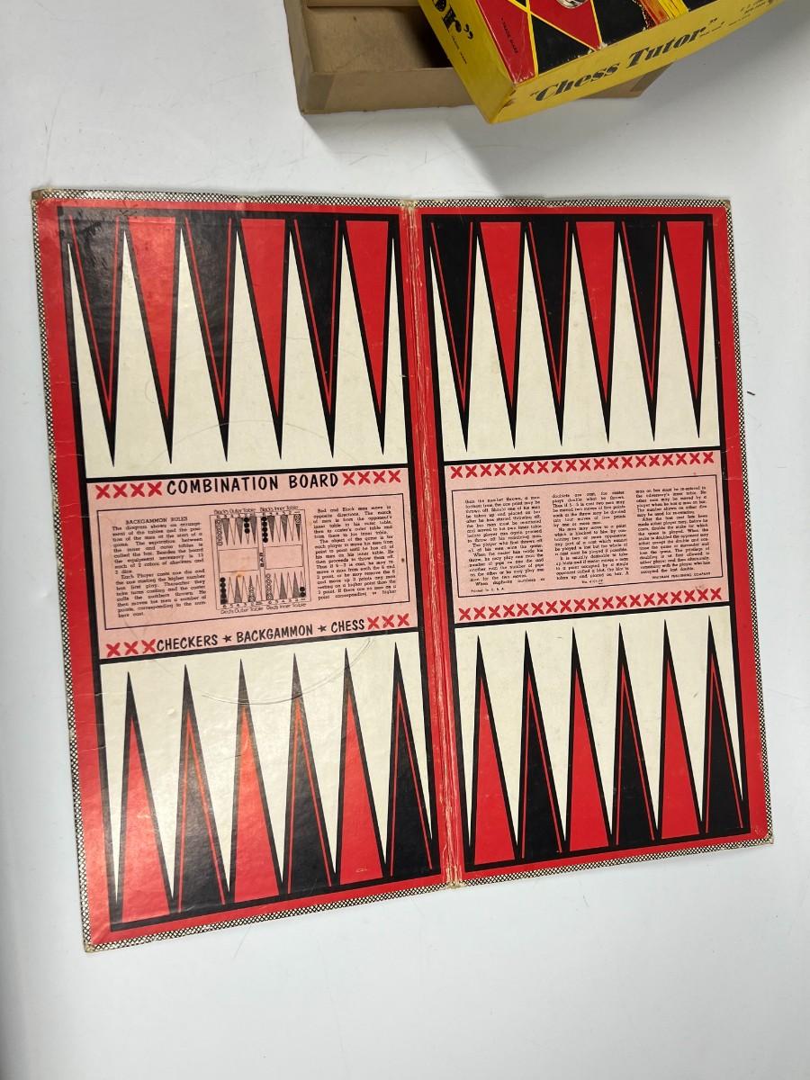 Vintage Chess Tutor Step by Step Instructions on Game Play Board Set. Comes with board, pieces, and instructions. Board can be used for chess, checkers, and backgammon.