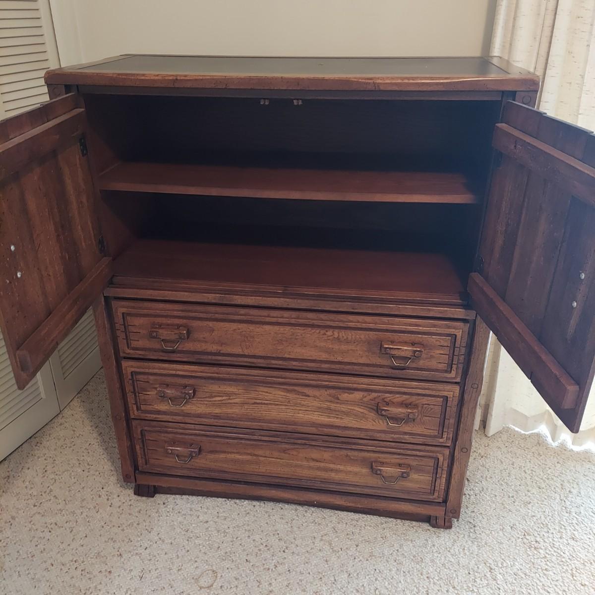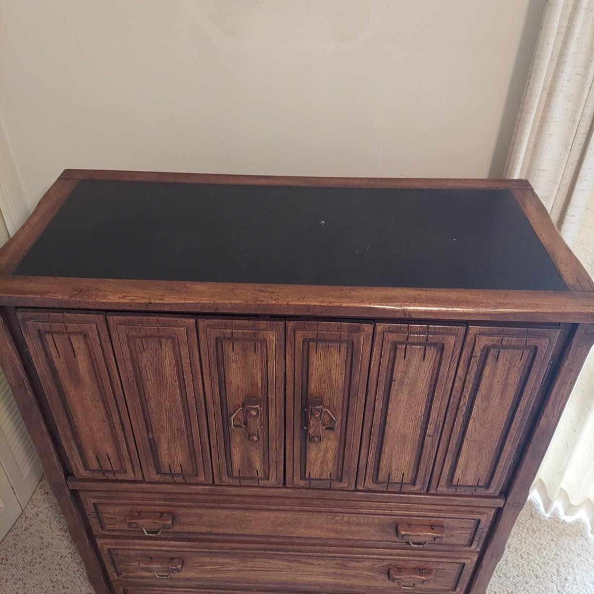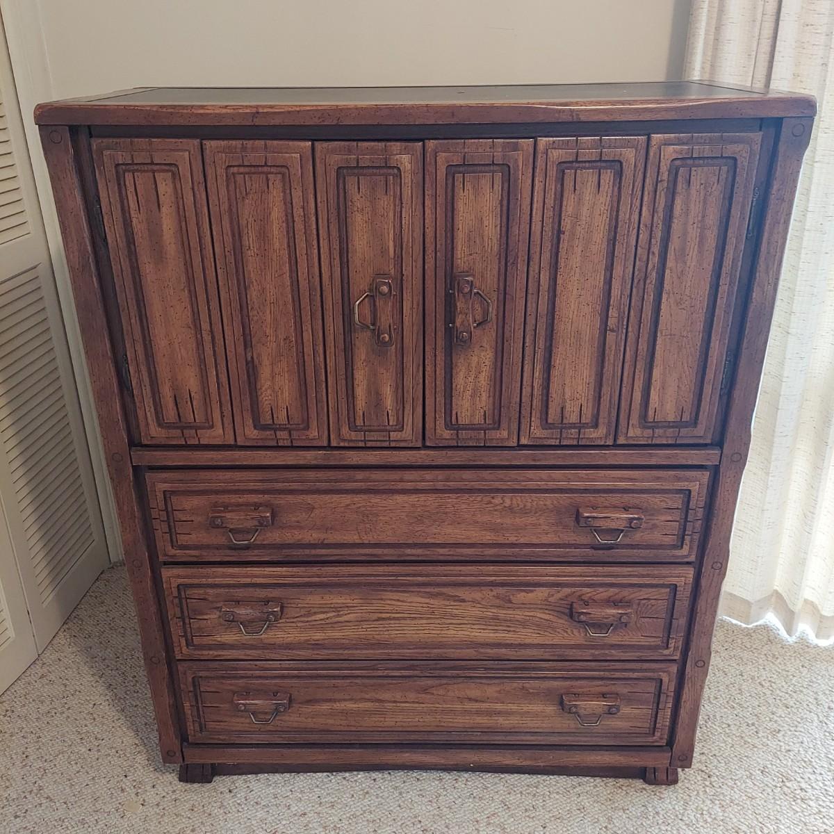 Solid wood armoire style dresser with doors up top and three drawers on bottom. The top has a faux slate accent. Piece measures 40” x 18” x 50"H. Please see photos for details. Local Pickup Only. Winning bidder must bring assistance to help move and load this item due to its weight and/or size. It's located on the basement level that has an external entrance.