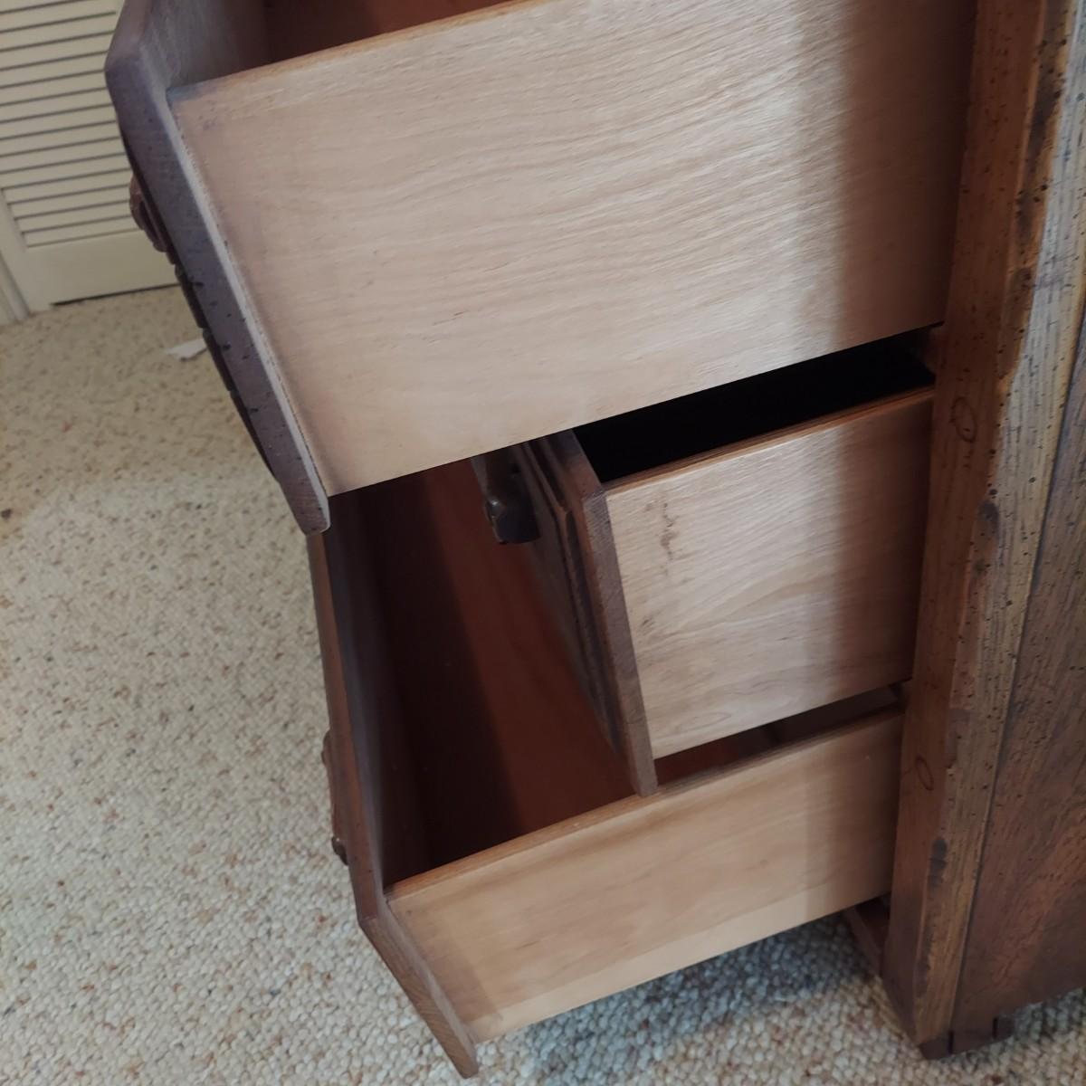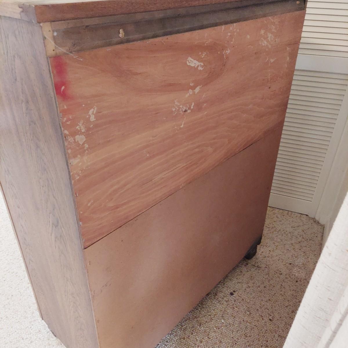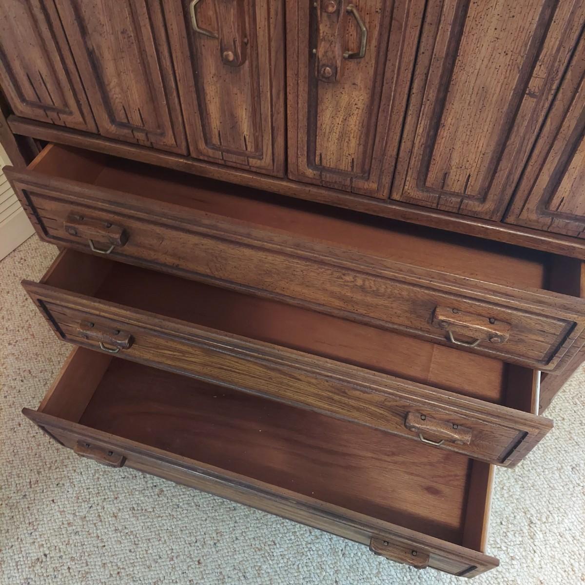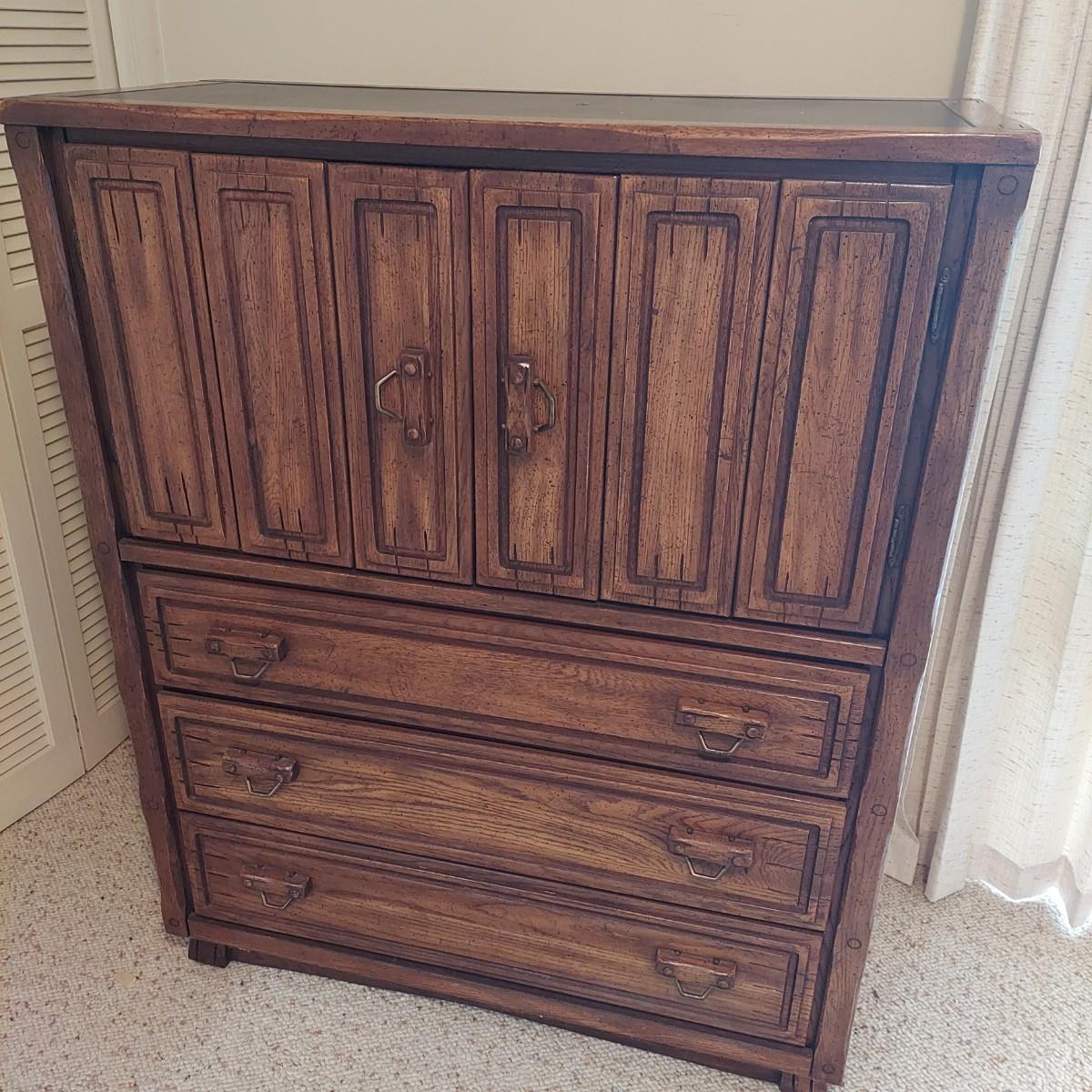 Solid wood armoire style dresser with doors up top and three drawers on bottom. The top has a faux slate accent. Piece measures 40” x 18” x 50"H. Please see photos for details. Local Pickup Only. Winning bidder must bring assistance to help move and load this item due to its weight and/or size. It's located on the basement level that has an external entrance.