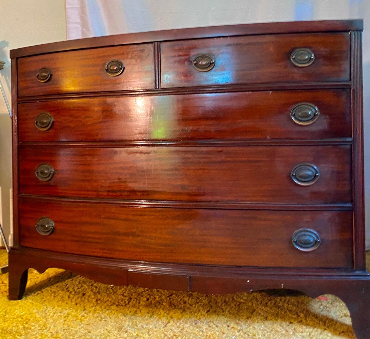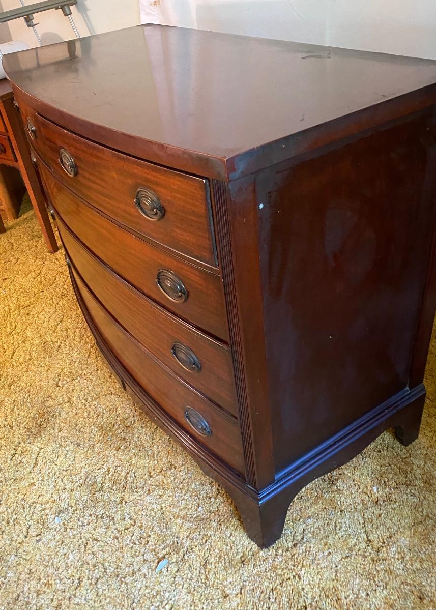 Nice classic mahogany chest of drawers from the 1920s-40s era. Slight bow front , three low drawers, two top drawers, footed apron. Typical age wear.