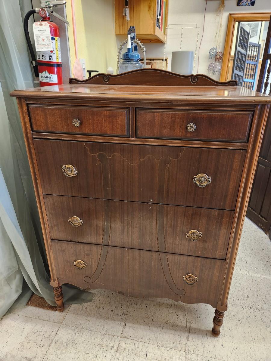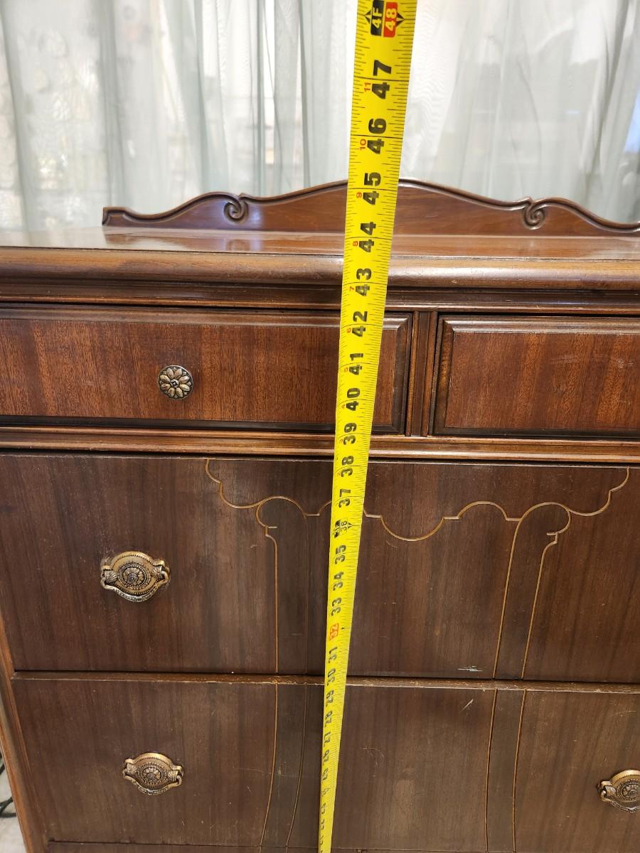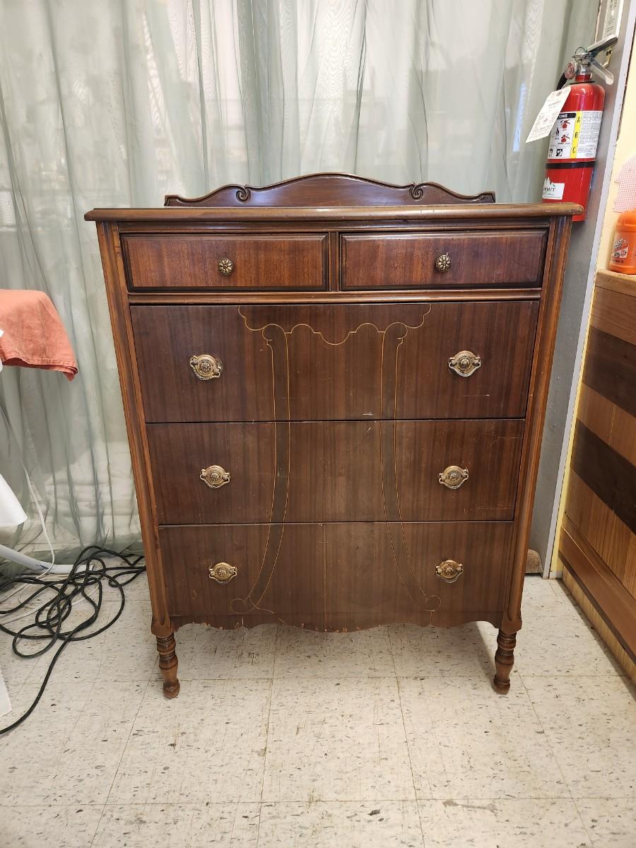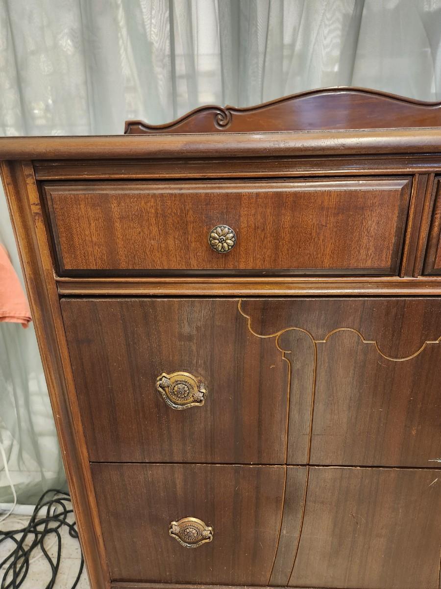 Pretty mahogany veneered chest of drawers. As is...notice the veneer damage in photos