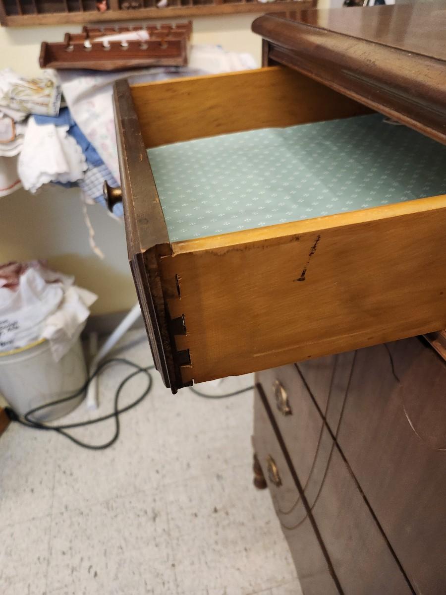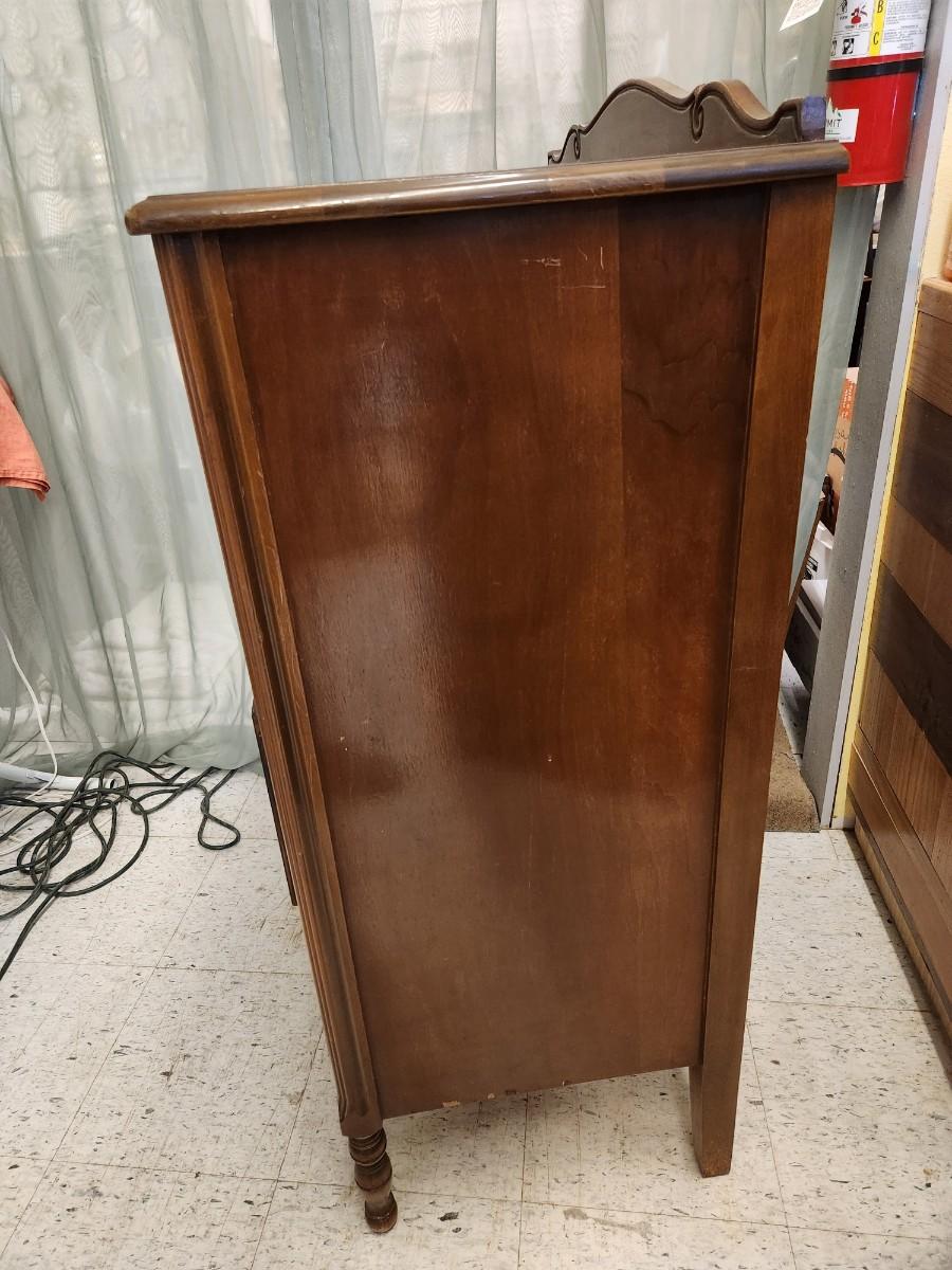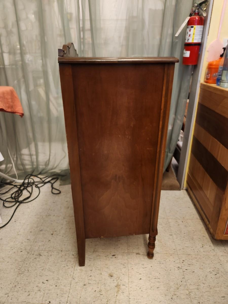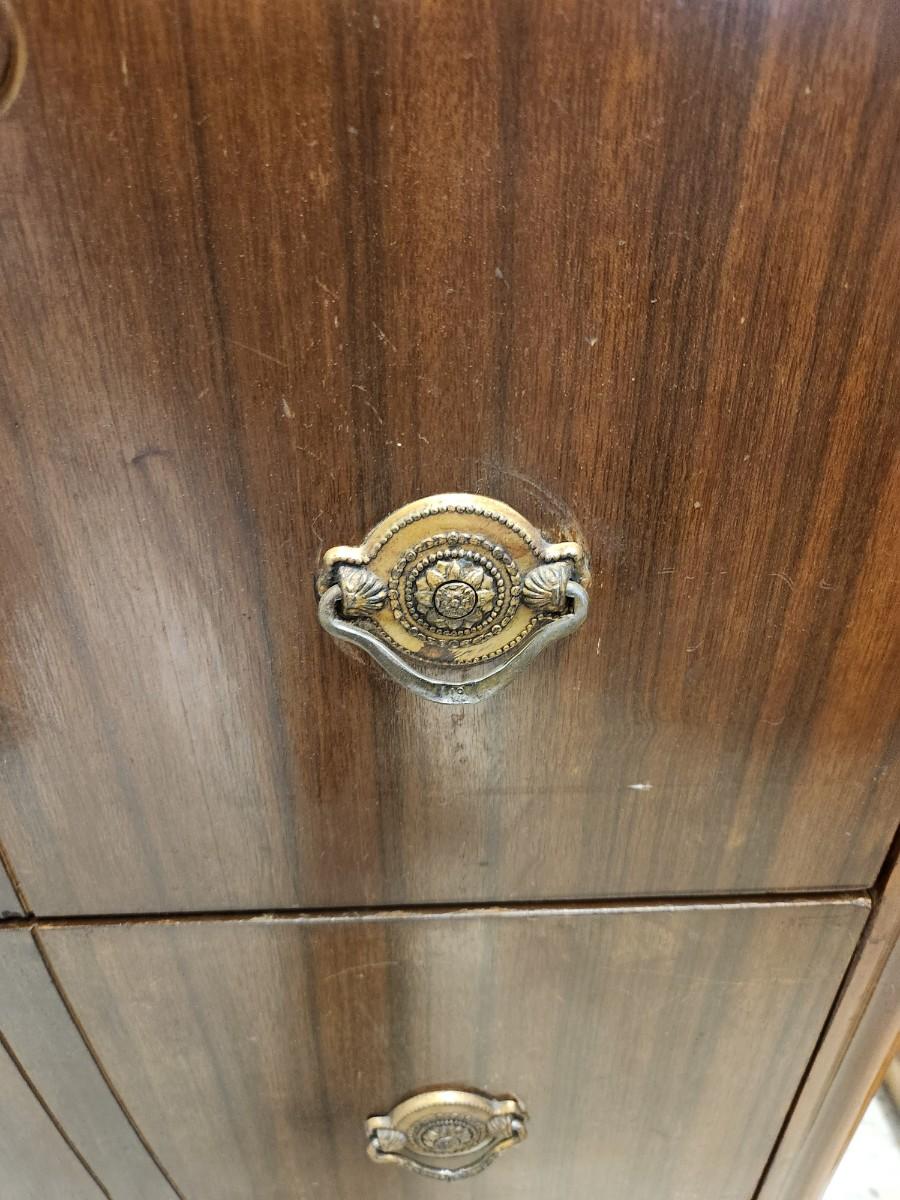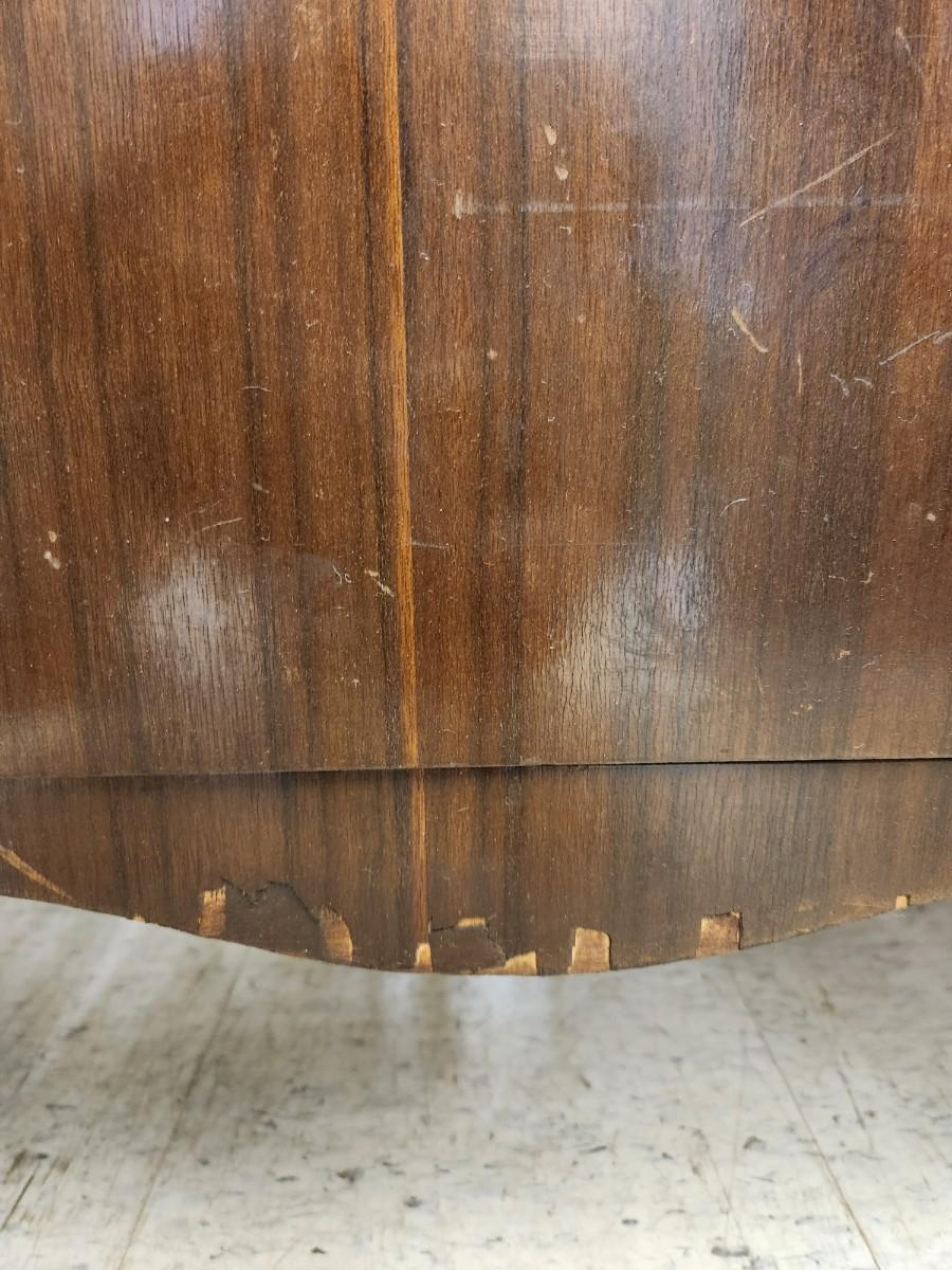 Pretty mahogany veneered chest of drawers. As is...notice the veneer damage in photos