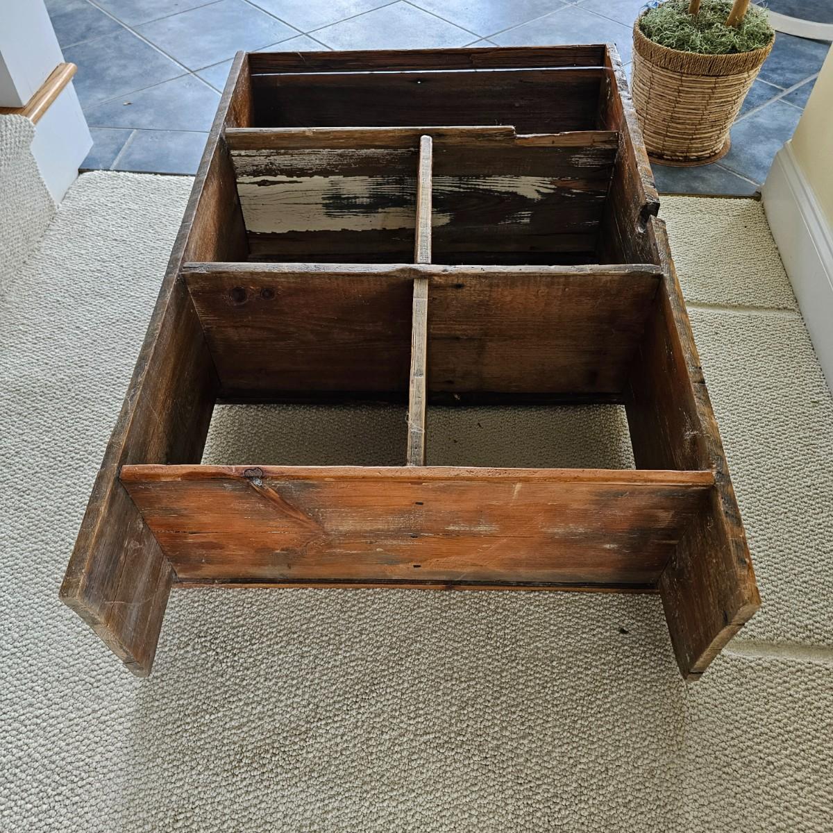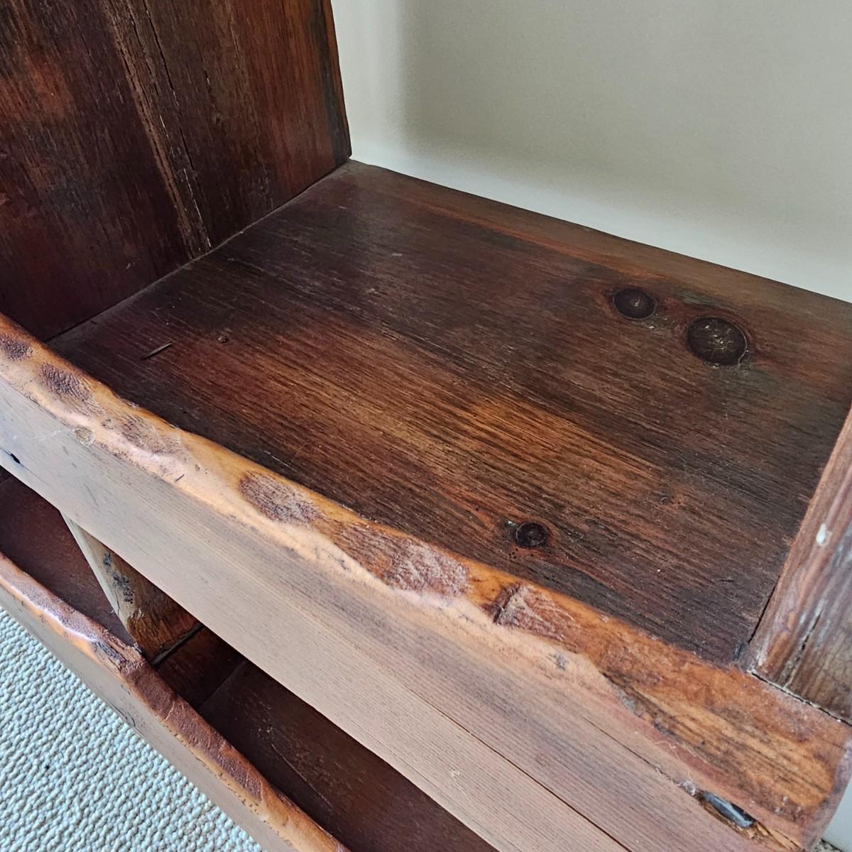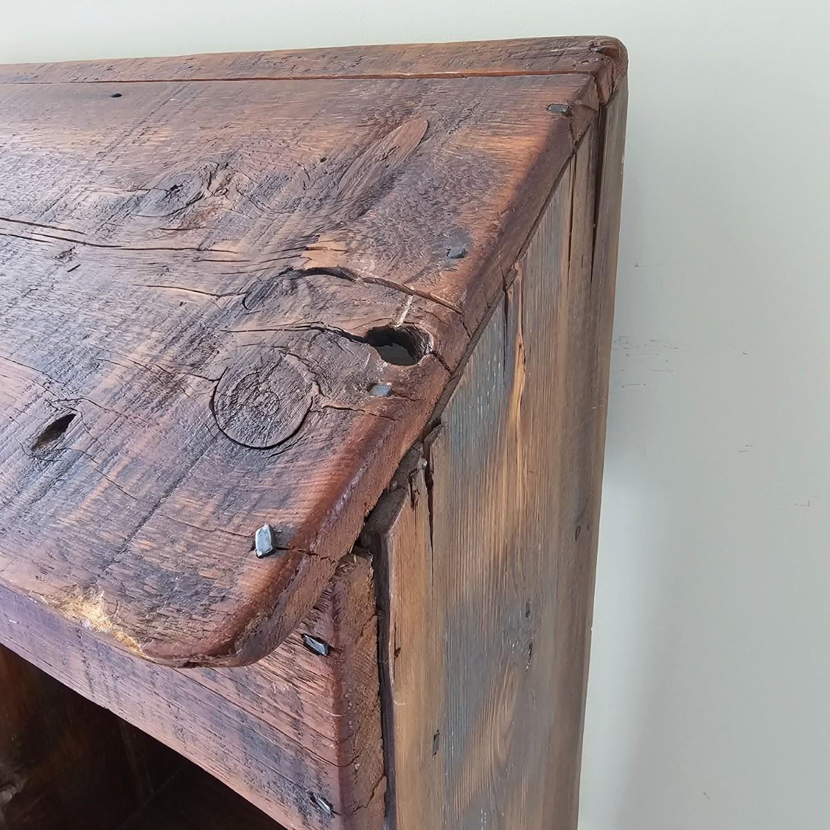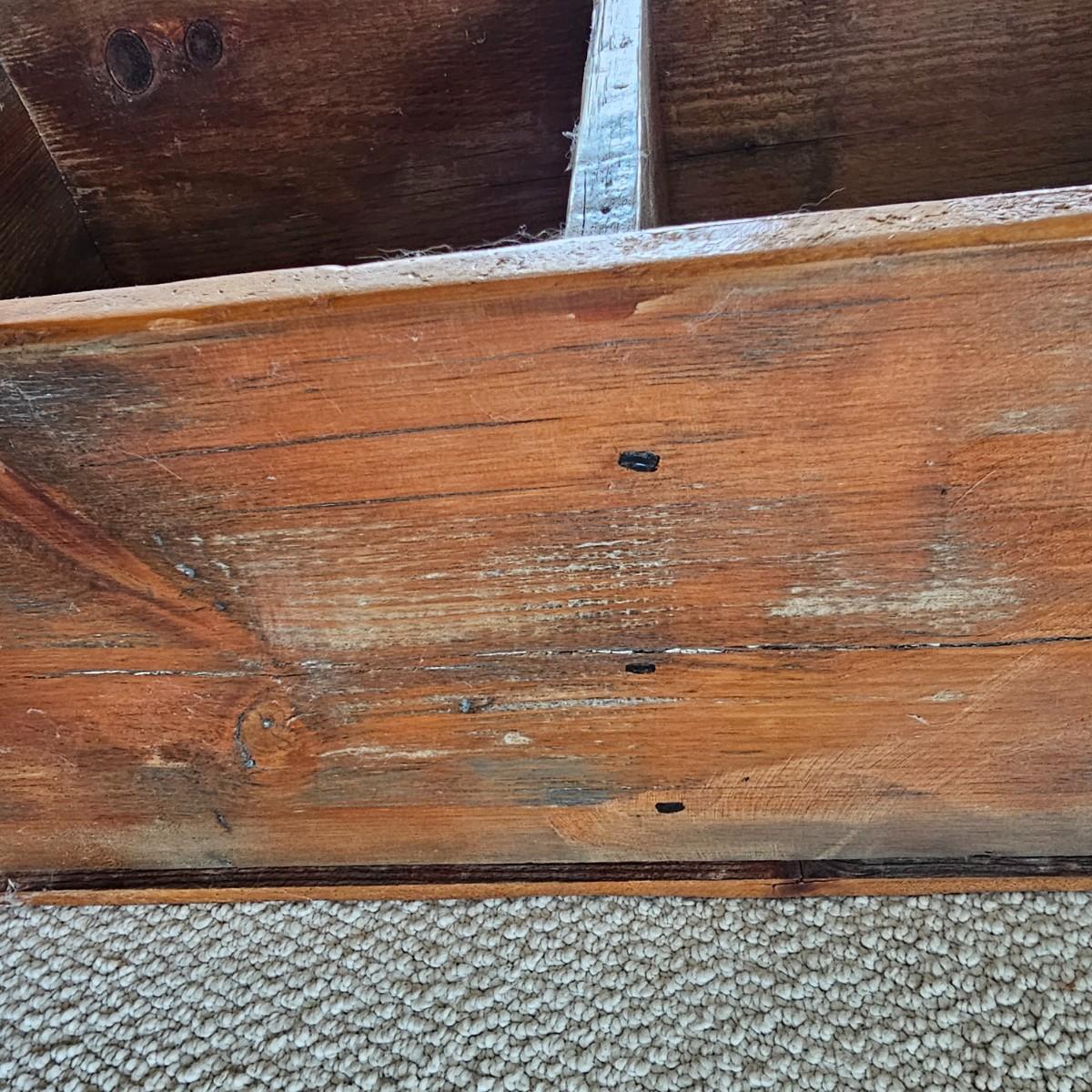 Old time chicken roosting box, made from solid oak. Boards may have been barn wood at one time. Assembled completely with cut nails. Box measures 12" x 27" x 42"H, shows wear marks at front from years of use. See photos for details. Local pickup only.