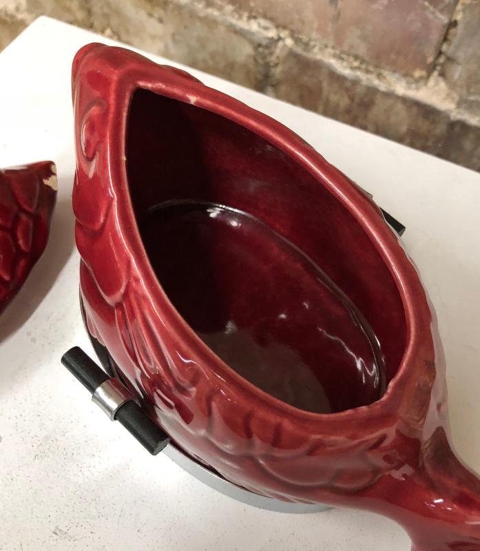 Made for Chicken of the Sea these vintage premiums for tuna casseroles was made by the Bauer Pottery in the 1950's..Good condition excepting one chip one lid..pictured...metal rack included...