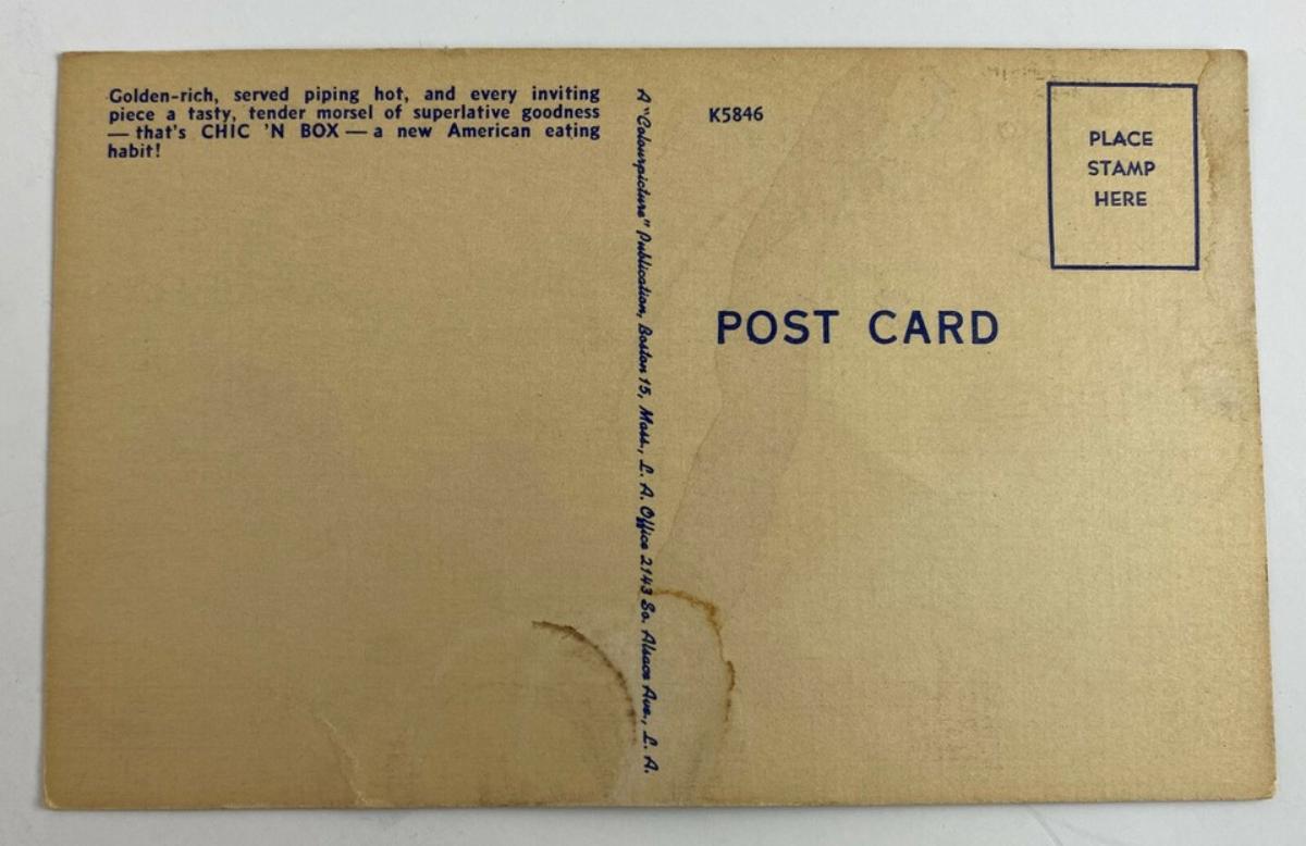 vintage linen postcard from the fifties...CHIC 'N BOX started in Salt Lake City, Utah in 1950...Good condition on front...light staining on back...by Colourpicture Publications Of Boston and L.A. #K5846